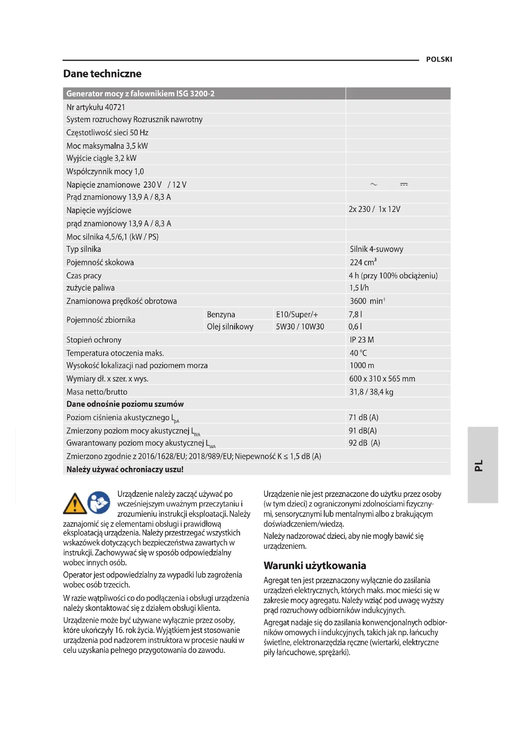 92 dB (A) Zmierzono zgodnie z 2016/1628/EU; 2018/989/EU; Niepewność K ≤ 1,5 dB (A) Należy używać ochroniaczy uszu! Urządzenie należy zacząć używać po wcześniejszym uważnym przeczytaniu i zrozumieniu instrukcji eksploatacji. Należy zaznajomić się z elementami obsługi i prawidłową eksploatacją urządzenia. Należy przestrzegać wszystkich wskazówek dotyczących bezpieczeństwa zawartych w instrukcji. Zachowywać się w sposób odpowiedzialny wobec innych osób. Operator jest odpowiedzialny za wypadki lub zagrożenia wobec osób trzecich. W razie wątpliwości co do podłączenia i obsługi urządzenia należy skontaktować się z działem obsługi klienta. Urządzenie może być używane wyłącznie przez osoby, które ukończyły 16. rok życia. Wyjątkiem jest stosowanie urządzenia pod nadzorem instruktora w procesie nauki w celu uzyskania pełnego przygotowania do zawodu. Urządzenie nie jest przeznaczone do użytku przez osoby (w tym dzieci) z ograniczonymi zdolnościami zyczny- mi, sensorycznymi lub mentalnymi albo z brakującym doświadczeniem/wiedzą. Należy nadzorować dzieci, aby nie mogły bawić się urządzeniem. Warunki użytkowania Agregat ten jest przeznaczony wyłącznie do zasilania urządzeń elektrycznych, których maks. moc mieści się w zakresie mocy agregatu. Należy wziąć pod uwagę wyższy prąd rozruchowy odbiorników indukcyjnych. Agregat nadaje się do zasilania konwencjonalnych odbior- ników omowych i indukcyjnych, takich jak np. łańcuchy świetlne, elektronarzędzia ręczne (wiertarki, elektryczne piły łańcuchowe, sprężarki). POLSKI72 73