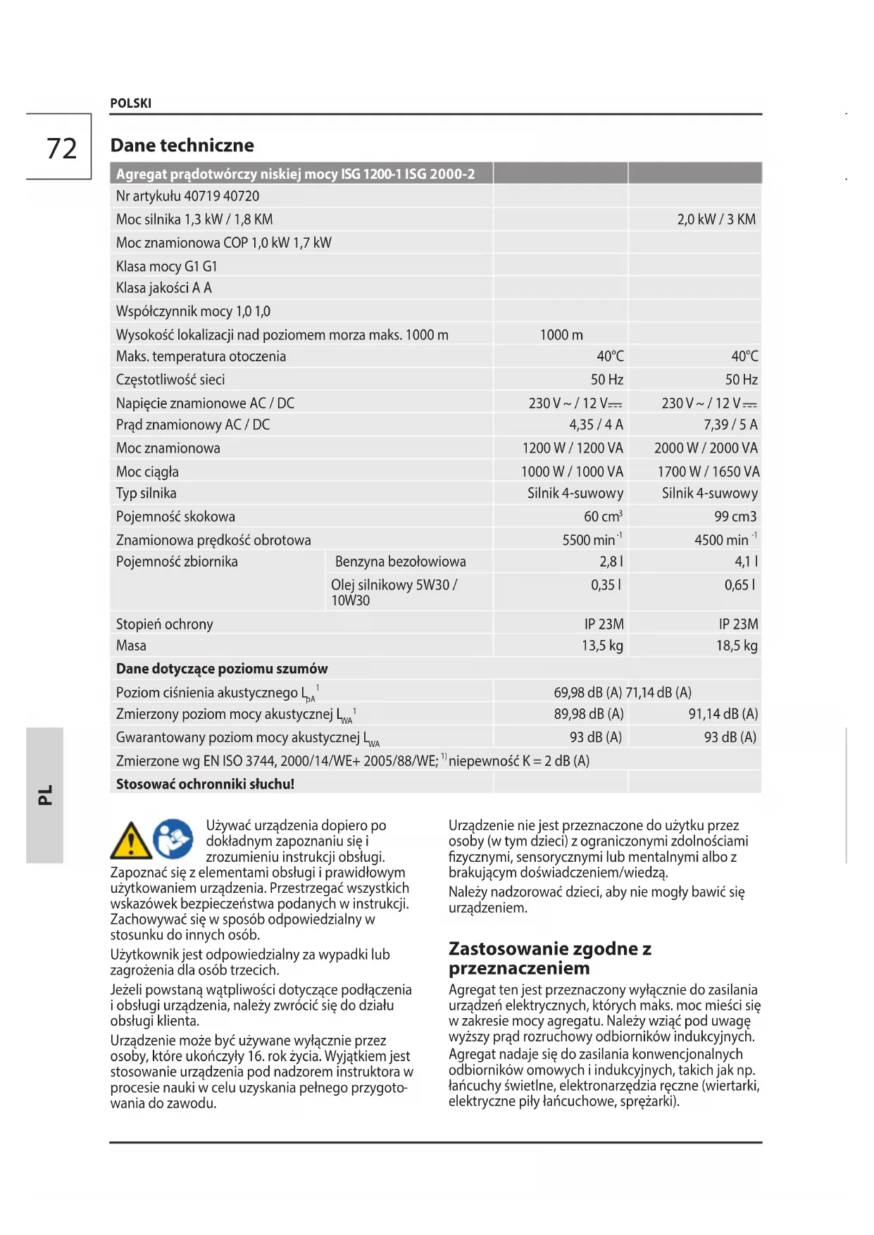 wania do zawodu. Urządzenie nie jest przeznaczone do użytku przez osoby (w tym dzieci) z ograniczonymi zdolnościami zycznymi, sensorycznymi lub mentalnymi albo z brakującym doświadczeniem/wiedzą. Należy nadzorować dzieci, aby nie mogły bawić się urządzeniem. Zastosowanie zgodne z przeznaczeniem Agregat ten jest przeznaczony wyłącznie do zasilania urządzeń elektrycznych, których maks. moc mieści się w zakresie mocy agregatu. Należy wziąć pod uwagę wyższy prąd rozruchowy odbiorników indukcyjnych. Agregat nadaje się do zasilania konwencjonalnych odbiorników omowych i indukcyjnych, takich jak np. łańcuchy świetlne, elektronarzędzia ręczne (wiertarki, elektryczne piły łańcuchowe, sprężarki).73 POLSKI