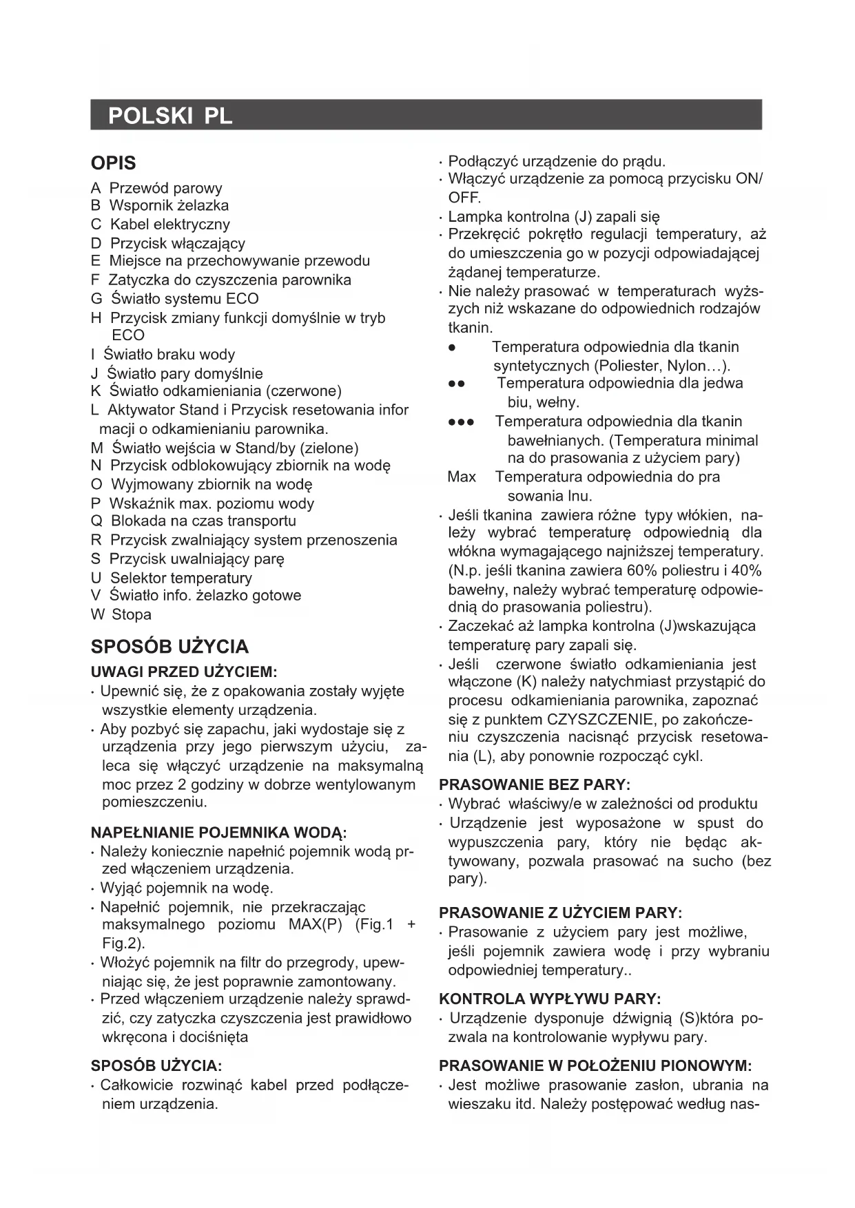 - Pokud se objeví nějaký problém, zaneste přís- troj do autorizovaného technického servisu. Nepokoušejte se přístroj rozebírat nebo opra- vovat bez odborné pomoci, může to být nebe- zpečné.POLSKI PL OPIS A Przewód parowy B Wspornik żelazka C Kabel elektryczny D Przycisk włączający E Miejsce na przechowywanie przewodu F Zatyczka do czyszczenia parownika G Światło systemu ECO H Przycisk zmiany funkcji domyślnie w tryb ECO I Światło braku wody J Światło pary domyślnie K Światło odkamieniania (czerwone) L Aktywator Stand i Przycisk resetowania infor macji o odkamienianiu parownika. M Światło wejścia w Stand/by (zielone) N Przycisk odblokowujący zbiornik na wodę O Wyjmowany zbiornik na wodę P Wskaźnik max. poziomu wody Q Blokada na czas transportu R Przycisk zwalniający system przenoszenia S Przycisk uwalniający parę U Selektor temperatury V Światło info. żelazko gotowe W Stopa