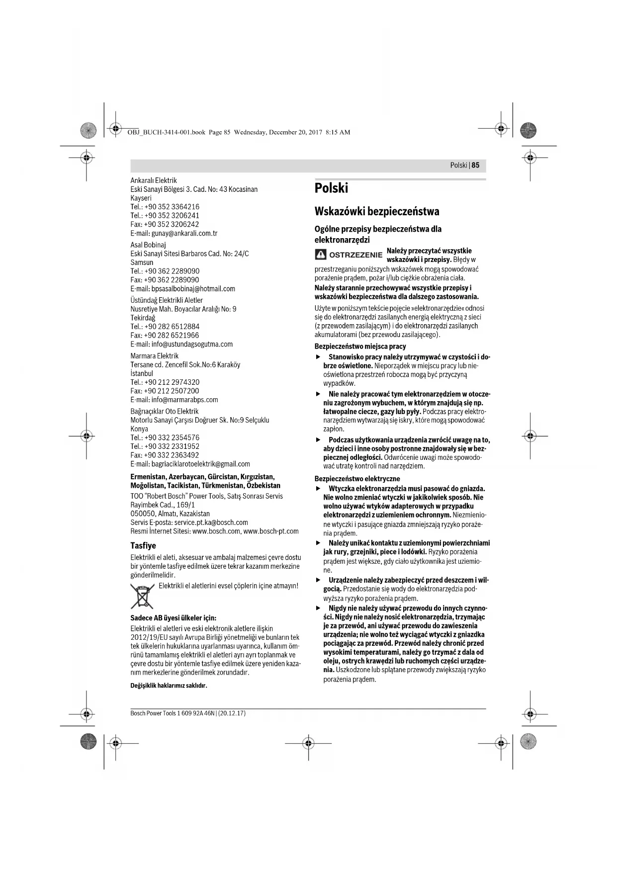 Klasa ochrony /II Dane aktualne są dla napięcia znamionowego [U] 230 V. Przy napię-ciach odbiegających od powyższego i w przypadku modeli specyficz-nych dla danego kraju dane te mogą się różnić.Podczas włączania urządzenia dochodzi do krótkotrwałych spadków napięcia. W przypadku niekorzystnych warunków sieciowych może dojść co zakłóceń pracy innych urządzeń. W przypadku impedancji źródła zasilania mniejszej niż 0,36 omów, nie należy się liczyć z żadnymi zakłóceniami. OBJ_BUCH-3414-001.book Page 89 Wednesday, December 20, 2017 8:15 AM90 | Polski 1 609 92A 46N | (20.12.17) Bosch Power Tools ochronną 10 za pomocą obu nakrętek ustalających 18 i do- ciągnąć je momentem nie mniejszym niż 10 Nm. Po zakończeniu montażu narzędzia roboczego należy za- mknąć pokrywę ochronną 10 i dociągnąć obie nakrętki motyl- kowe. Montaż narzędzi szlifierskich Ściernice muszą zapewniać dokładny ruch obrotowy. Nie wol- no używać ściernic, które utraciły obrotowy kształt – tarczę taką należy wyrównać osełką (osprzęt dodatkowy) lub wy- mienić na nową. Za pomocą osełki można utworzyć dowolne formy specjalne z tarczy podstawowej. W przypadku stosowania narządzi szlifierskich z wkładką gwintowaną, należy uważać, aby końcówka wrzeciona szlifier- ki 3 nie dotykała dziurkowanego spodu narzędzia szlifierskie- go. GGS 8 SH (zob. rys. B) – Obrócić wrzeciono szlifierki 3, w taki sposób, aby otwór we wrzecionie 3, znajdował się w jednej linii z otworami w obudowie. Przełożyć trzpień mocujący 14 przez otwory w obudowie i otwór we wrzecionie 3. – Poluzować nakrętkę mocującą 1 za pomocą załączonego klucza oczkowego 15 i wyjąć ją. – Wrzeciono szlifierki 3 i wszystkie części, które mają zostać zamontowane, należy oczyścić. – Nałożyć ściernicę i dociągnąć nakrętkę mocującą 1 za po- mocą klucza widełkowego 15. Należy przy tym upewnić się, czy ściernica może się swobodnie obracać w pokrywie