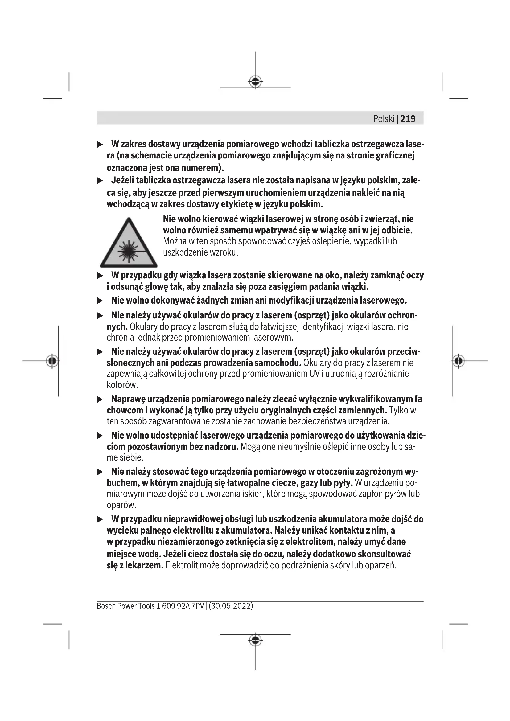Karasoku Mahallesi 28028. Sokak No:20/A Merkez / ADANA Tel.: +903223599710 -3521379 Fax: +903223591323 E-mail: isiklar@isiklarelektrik.com Diğer servis adreslerini şurada bulabilirsiniz: www.bosch-pt.com/serviceaddresses Nakliye Alet içindeki lityum iyon (Li-Ionen) aküler tehlikeli madde taşıma yönetmeliği hükümlerine tabidir. Aküler başka bir yükümlülük olmaksızın kullanıcı tarafından caddeler üzerinde taşınabilir. Üçüncü kişiler eliyle yollanma durumunda (örneğin hava yolu ile veya nakliye şirketleri ile) paketleme ve etiketlemeye ilişkin özel hükümlere uyulmalıdır. Gönderi paketlenirken bir tehlikeli madde uzmanından yardım alınmalıdır. Tasfiye Ölçüm aletleri, şarj cihazları, aküler, aksesuarlar ve ambalaj malzemesi çevre kurallarına uygun bir geri dönüşüm merkezine yollanmalıdır. Ölçüm aletleri, şarj cihazları ve aküler evdeki çöplere atılmamalıdır! Sadece AB ülkeleri için: Atık elektrikli ve elektronik cihazlara ilişkin 2012/19/EU sayılı Avrupa yönetmeliği ve ulusal hukuktaki uygulaması uyarınca, kullanım ömrünü tamamlamış ölçme aletleri ve şarj Bosch Power Tools 1 609 92A 7PV | (30.05.2022)218 | Polski cihazları ve 2006/66/EC sayılı Avrupa yönetmeliği uyarınca arızalı veya kullanım ömrünü tamamlamış aküler/piller ayrı ayrı toplanmalı ve çevre kurallarına uygun şekilde imha edilmek üzere bir geri dönüşüm merkezine gönderilmelidir. Atık elektrikli ve elektronik ekipmanlar uygun şekilde imha edilmezse olası tehlikeli maddelerin varlığı nedeniyle çevre ve insan sağlığı üzerinde zararlı etkileri olabilir. Aküler/bataryalar: Lityum iyon: Lütfen nakliye bölümündeki talimata uyun (Bakınız „Nakliye“, Sayfa217) ile onaylama yapın. u Alete entegre aküler imha edilmek üzere sadece yetkili personel tarafından çıkarılabilir. Gövde kapağı açıldığı takdirde ölçüm aleti tahrip olabilir. Aküyü ölçme cihazından çıkarmak için, ölçme cihazını akü tam olarak boşalıncaya kadar çalıştırın. Gövdedeki vidaları sökün ve aküyü almak için gövde parçasını çıkarın. Bir kısa devreden kaçınmak için aküdeki bağlantıları teker teker ve arka arkaya ayırın ve sonra kutupları izole edin. Tam olarak boşalma durumunda bile aküde kısa devreye neden olabilecek artık kapasite bulunur. Polski Wskazówki dotyczące bezpieczeństwa Aby móc efektywnie i bezpiecznie pracować przy użyciu urządzenia pomiarowego, należy przeczytać wszystkie wskazówki i stosować się do nich. Jeżeli urządzenie po- miarowe nie będzie stosowane zgodnie z niniejszymi wskazówkami, działanie wbudowanych zabezpieczeń urządzenia pomiarowego może zostać zakłócone. Należy koniecznie zadbać o czytel- ność tabliczek ostrzegawczych, znajdujących się na urządzeniu pomiarowym. PROSI- MY ZACHOWAĆ I STARANNIE PRZECHOWYWAĆ NINIEJSZE WSKAZÓWKI, A ODDA- JĄC LUB SPRZEDAJĄC URZĄDZENIE POMIAROWE, PRZEKAZAĆ JE NOWEMU UŻYT- KOWNIKOWI. u Ostrożnie: Użycie innych, niż podane w niniejszej instrukcji, elementów obsługo- wych iregulacyjnych oraz zastosowanie innych metod postępowania może prowa- dzić do niebezpiecznej ekspozycji na promieniowanie laserowe. 1 609 92A 7PV | (30.05.2022) Bosch Power ToolsPolski | 219 u W zakres dostawy urządzenia pomiarowego wchodzi tabliczka ostrzegawcza lase- ra (na schemacie urządzenia pomiarowego znajdującym się na stronie graficznej oznaczona jest ona numerem). u Jeżeli tabliczka ostrzegawcza lasera nie została napisana w języku polskim, zale- ca się, aby jeszcze przed pierwszym uruchomieniem urządzenia nakleić na nią wchodzącą w zakres dostawy etykietę w języku polskim. Nie wolno kierować wiązki laserowej wstronę osób i zwierząt, nie wolno również samemu wpatrywać się w wiązkę ani w jej odbicie. Można w ten sposób spowodować czyjeś oślepienie, wypadki lub uszkodzenie wzroku. u W przypadku gdy wiązka lasera zostanie skierowane na oko, należy zamknąć oczy i odsunąć głowę tak, aby znalazła się poza zasięgiem padania wiązki. u Nie wolno dokonywać żadnych zmian ani modyfikacji urządzenia laserowego. u Nie należy używać okularów do pracy z laserem (osprzęt) jako okularów ochron- nych. Okulary do pracy z laserem służą do łatwiejszej identyfikacji wiązki lasera, nie chronią jednak przed promieniowaniem laserowym. u Nie należy używać okularów do pracy z laserem (osprzęt) jako okularów przeciw- słonecznych ani podczas prowadzenia samochodu. Okulary do pracy z laserem nie zapewniają całkowitej ochrony przed promieniowaniem UV i utrudniają rozróżnianie kolorów. u Naprawę urządzenia pomiarowego należy zlecać wyłącznie wykwalifikowanym fa- chowcom i wykonać ją tylko przy użyciu oryginalnych części zamiennych. Tylko w ten sposób zagwarantowane zostanie zachowanie bezpieczeństwa urządzenia. u Nie wolno udostępniać laserowego urządzenia pomiarowego do użytkowania dzie- ciom pozostawionym bez nadzoru. Mogą one nieumyślnie oślepić inne osoby lub sa- me siebie. u Nie należy stosować tego urządzenia pomiarowego w otoczeniu zagrożonym wy- buchem, wktórym znajdują się łatwopalne ciecze, gazy lub pyły. W urządzeniu po- miarowym może dojść do utworzenia iskier, które mogą spowodować zapłon pyłów lub oparów. u W przypadku nieprawidłowej obsługi lub uszkodzenia akumulatora może dojść do wycieku palnego elektrolitu z akumulatora. Należy unikać kontaktu z nim, a wprzypadku niezamierzonego zetknięcia się z elektrolitem, należy umyć dane miejsce wodą. Jeżeli ciecz dostała się do oczu, należy dodatkowo skonsultować się z lekarzem. Elektrolit może doprowadzić do podrażnienia skóry lub oparzeń. Bosch Power Tools 1 609 92A 7PV | (30.05.2022)220 | Polski u Akumulatory należy ładować wyłącznie władowarkach zalecanych przez produ- centa. Ładowanie akumulatorów innych, niż te, które zostały d