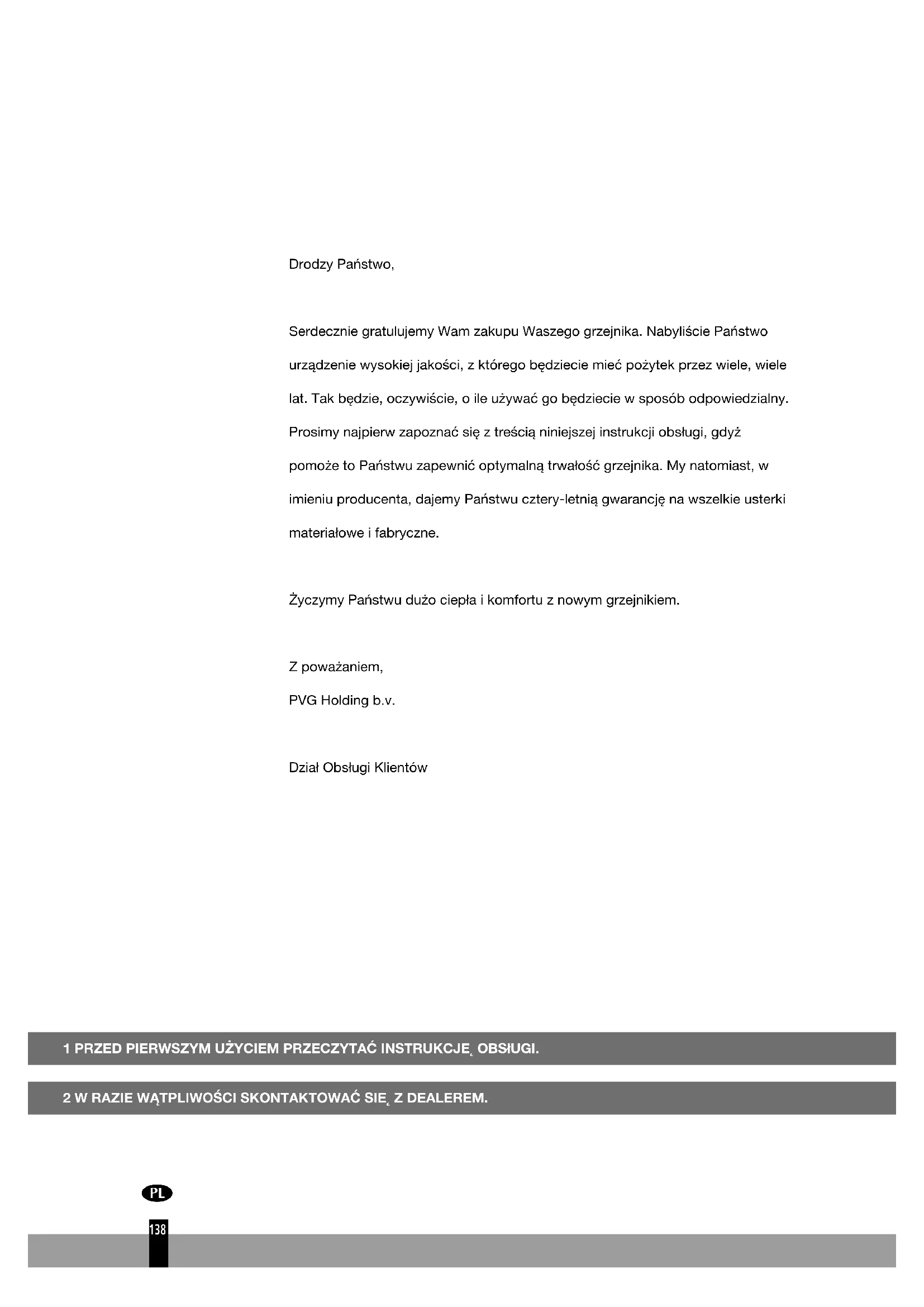 Drodzy Państwo, Serdecznie gratulujemy Wam zakupu Waszego grzejnika. Nabyliście Państwo urządzenie wysokiej jakości, z którego będziecie mieć pożytek przez wiele, wiele lat. Tak będzie, oczywiście, o ile używać go będziecie w sposób odpowiedzialny. Prosimy najpierw zapoznać się z treścią niniejszej instrukcji obsługi, gdyż pomoże to Państwu zapewnić optymalną trwałość grzejnika. My natomiast, w imieniu producenta, dajemy Państwu cztery-letnią gwarancję na wszelkie usterki materiałowe i fabryczne. Życzymy Państwu dużo ciepła i komfortu z nowym grzejnikiem. Z poważaniem, PVG Holding b.v. Dział Obsługi Klientów139