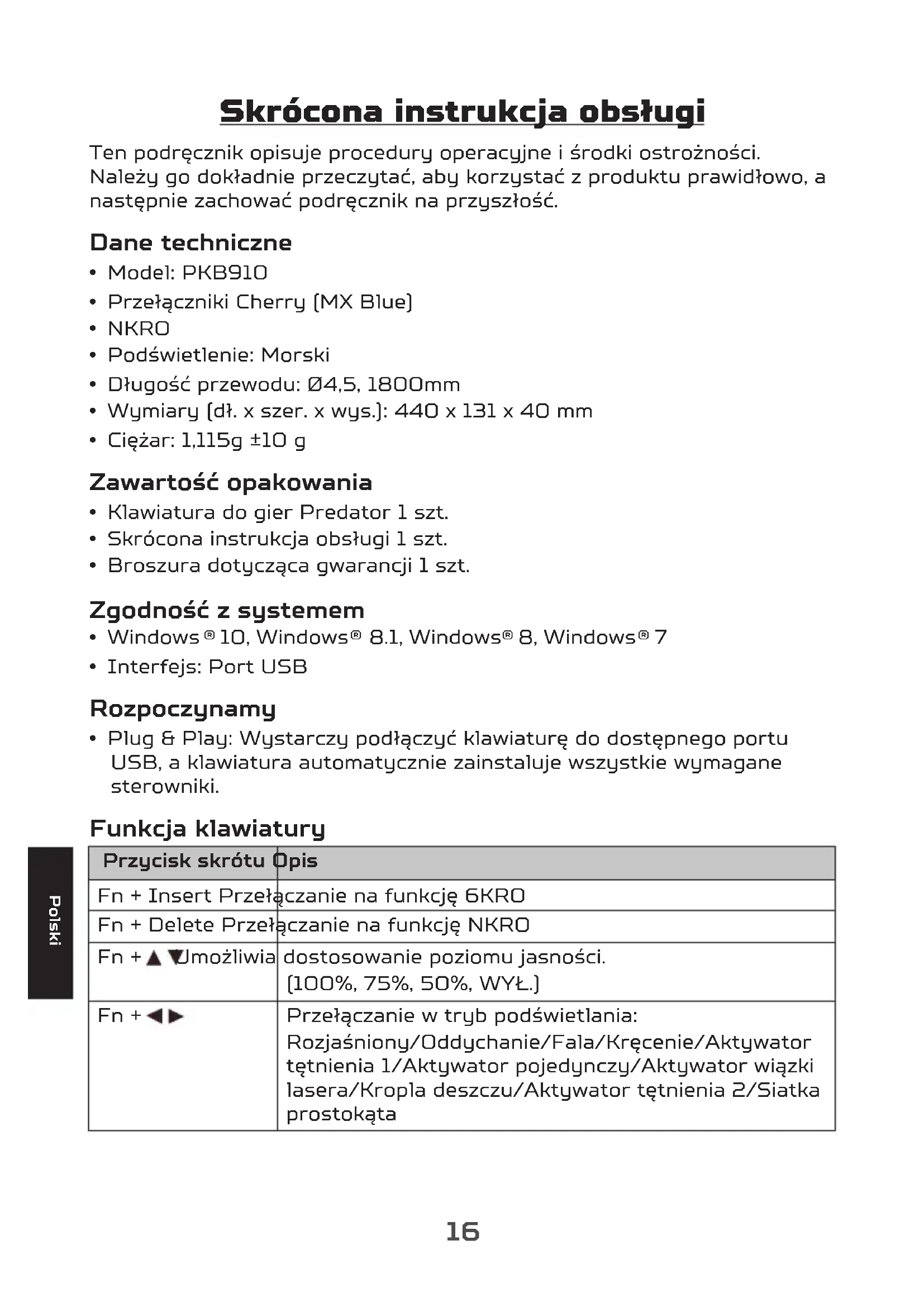 - Plug & Play: Wystarczy podłączyć klawiaturę do dostępnego portu USB, a klawiatura automatycznie zainstaluje wszystkie wymagane sterowniki. Funkcja klawiatury Przycisk skrótu Opis Fn + Insert Przełączanie na funkcję 6KRO Fn + Delete Przełączanie na funkcję NKRO Fn + Umożliwia dostosowanie poziomu jasności. (100%, 75%, 50%, WYŁ.) Fn + Przełączanie w tryb podświetlania: Rozjaśniony/Oddychanie/Fala/Kręcenie/Aktywator tętnienia 1/Aktywator pojedynczy/Aktywator wiązki lasera/Kropla deszczu/Aktywator tętnienia 2/Siatka prostokąta17 Polski Przycisk skrótu Opis Fn + Home Niezwłoczne nagrywanie makro Krok 1: Naciśnij Fn + F6. Włączona zostanie blokada klawiszy Windows. Krok 2: Naciśnij Fn + Home, zacznie migać dioda LED. Krok 3: Przypisz żądany klawisz, aby zapisać makro, dioda LED zacznie migać szybciej. Krok 4: Wpisz klawisz podany na liście makro. Krok 5: Naciśnij Fn + Home, aby zakończyć proces niezwłocznego nagrywania makro, jeśli w ciągu 20 sekund nie nastąpi żadne działanie. Wskazówki dotyczące wygody użytkowania Niektóre badania wskazują, że wykonywanie przez długi czas powtarzalnych ruchów; nieodpowiednie miejsce pracy, pozycja ciała i złe nawyki pracy mogą wiązać się z odczuwaniem braku komfortu fizycznego i skutkować uszkodzeniem nerwów, ścięgien i mięśni. Poniżej przedstawiono kilka wskazówek, jak można zoptymalizować wygodę użytkowania, a jednocześnie uniknąć obrażeń.