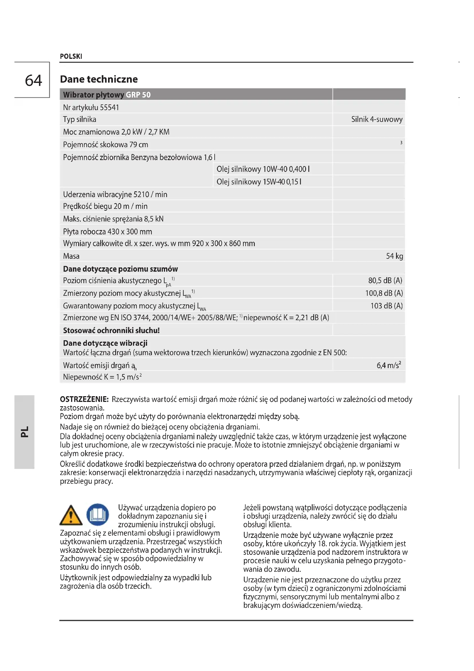 Pojemność zbiornika Benzyna bezołowiowa 1,6 l Olej silnikowy 10W-40 0,400 l Olej silnikowy 15W-40 0,15 l Uderzenia wibracyjne 5210 / min Prędkość biegu 20 m / min Maks. ciśnienie sprężania 8,5 kN Płyta robocza 430 x 300 mm Wymiary całkowite dł. x szer. wys. w mm 920 x 300 x 860 mm Masa 54 kg Dane dotyczące poziomu szumów Poziom ciśnienia akustycznego L