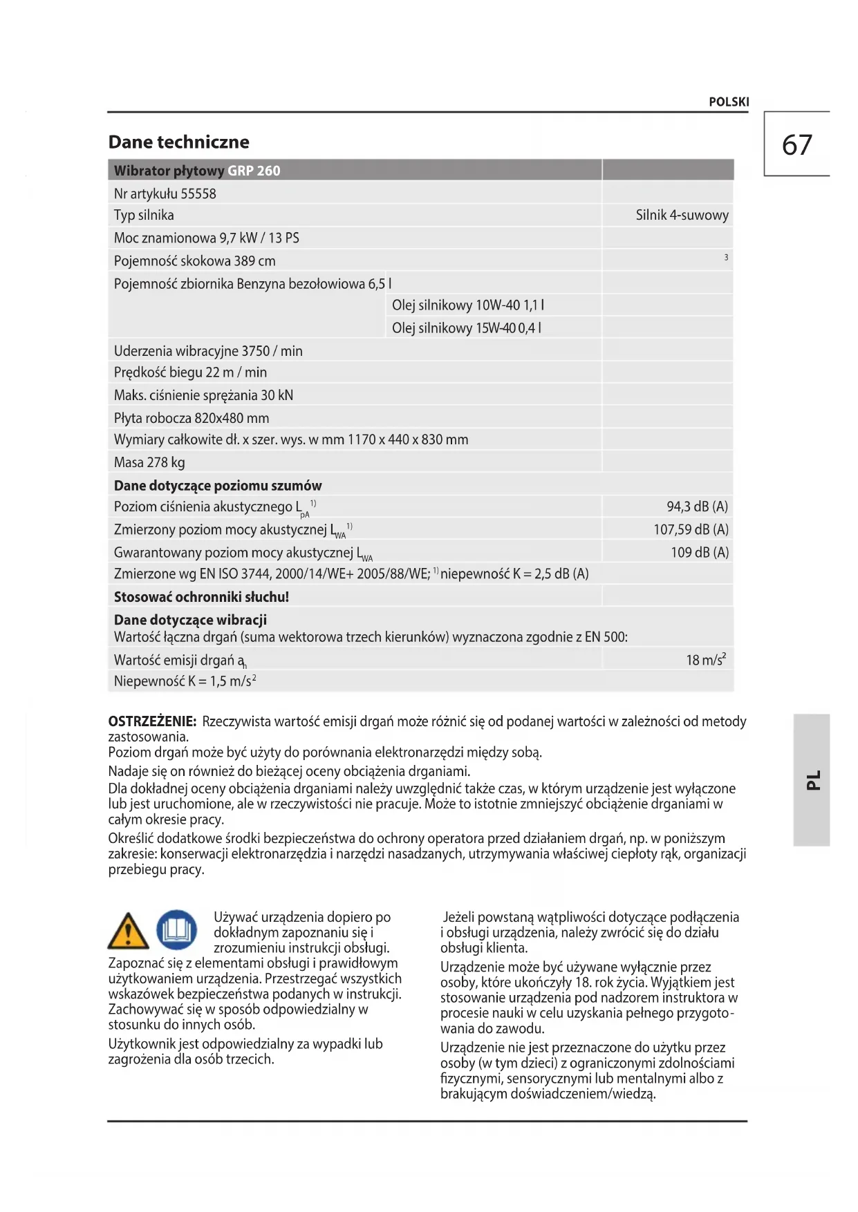 Pojemność zbiornika Benzyna bezołowiowa 6,5 l Olej silnikowy 10W-40 1,1 l Olej silnikowy 15W-40 0,4 l Uderzenia wibracyjne 3750 / min Prędkość biegu 22 m / min Maks. ciśnienie sprężania 30 kN Płyta robocza 820x480 mm Wymiary całkowite dł. x szer. wys. w mm 1170 x 440 x 830 mm Masa 278 kg Dane dotyczące poziomu szumów Poziom ciśnienia akustycznego L