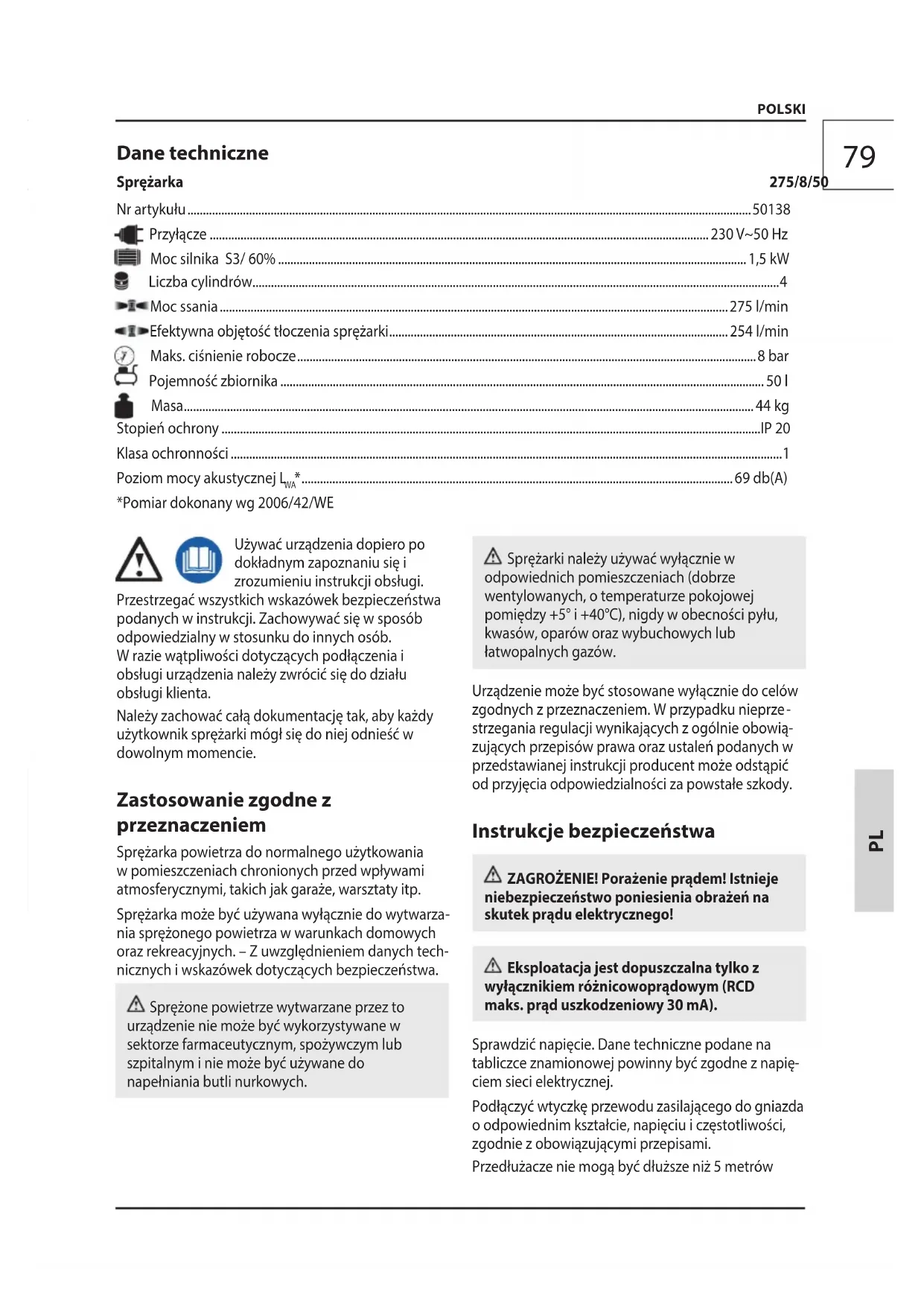 ciem sieci elektrycznej. Podłączyć wtyczkę przewodu zasilającego do gniazda o odpowiednim kształcie, napięciu i częstotliwości, zgodnie z obowiązującymi przepisami. Przedłużacze nie mogą być dłuższe niż 5 metrów Dane techniczne Sprężarka 275/8/50 SILENT80 Podczas używania sprężarki należy nosić okulary ochronne, aby chronić oczy przed ciałami obcymi dostającymi się do strumienia sprężonego powietrza. Podczas korzystania z akcesoriów pneumatycznych należy w miarę możliwości nosić odzież chroniącą przed wypadkami. Między sprężarką a obszarem roboczym należy zawsze zachować bezpieczną odległość wynoszącą co najmniej 4 metry. Uwaga! Niebezpieczeństwo dynamicznego prze