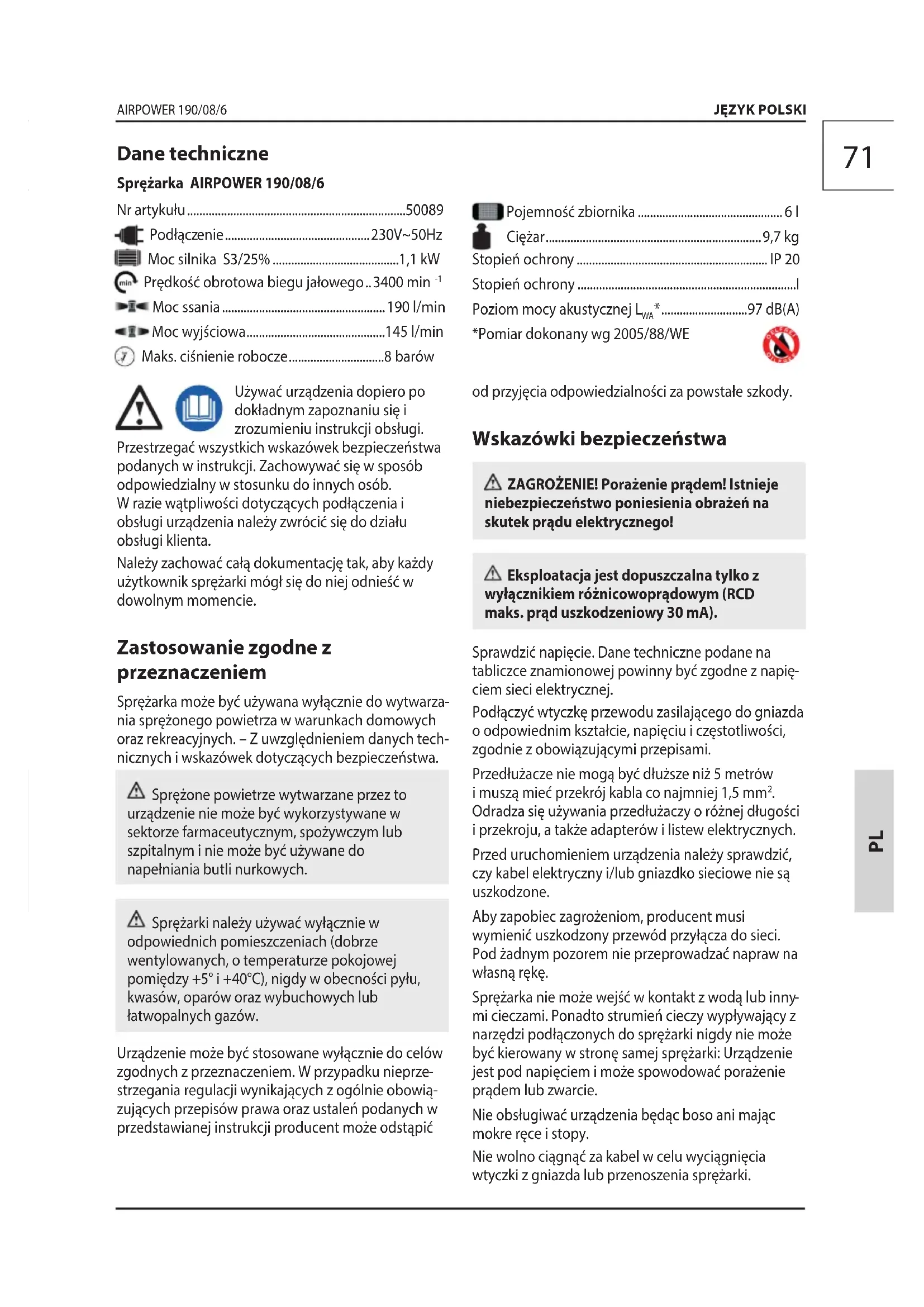 - Dane techniczne Sprężarka AIRPOWER 190/08/6 Nr artykułu p. 5008