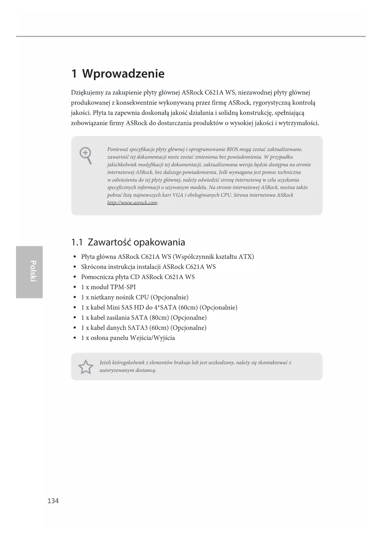 1 x osłona panelu Wejścia/Wyjścia Jeżeli któregokolwiek z elementów brakuje lub jest uszkodzony, należy się skontaktować z autoryzowanym dostawcą.Ponieważ specyfikacje płyty głównej i oprogramowanie BIOS mogą zostać zaktualizowane, zawartość tej dokumentacji może zostać zmieniona bez powiadomienia. W przypadku jakichkolwiek modyfikacji tej dokumentacji, zaktualizowana wersja będzie dostępna na stronie internetowej ASRock, bez dalszego powiadomienia. Jeśli wymagana jest pomoc techniczna w odniesieniu do tej płyty głównej, należy odwiedzić stronę internetową w celu uzyskania specyficznych informacji o używanym modelu. Na stronie internetowej ASRock, można także pobrać listę najnowszych kart VGA i obsługiwanych CPU. Strona internetowa ASRock http://www.asrock.com.135 C621A WS Polski Polski