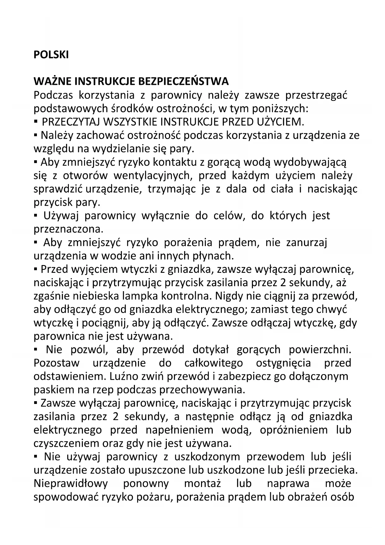 - Aby zmniejszyć ryzyko kontaktu z gorącą wodą wydobywającą się z otworów wentylacyjnych, przed każdym użyciem należy sprawdzić urządzenie, trzymając je z dala od ciała i naciskając przycisk pary.
