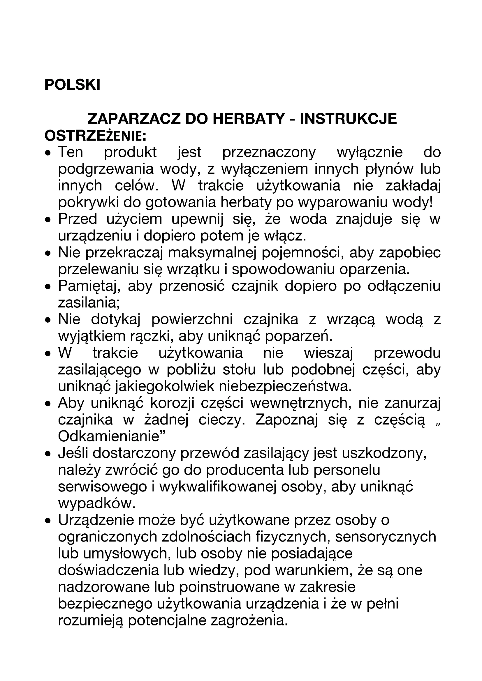 - Ten produkt jest przeznaczony wyłącznie do podgrzewania wody, z wyłączeniem innych płynów lub innych celów. W trakcie użytkowania nie zakładaj pokrywki do gotowania herbaty po wyparowaniu wody!