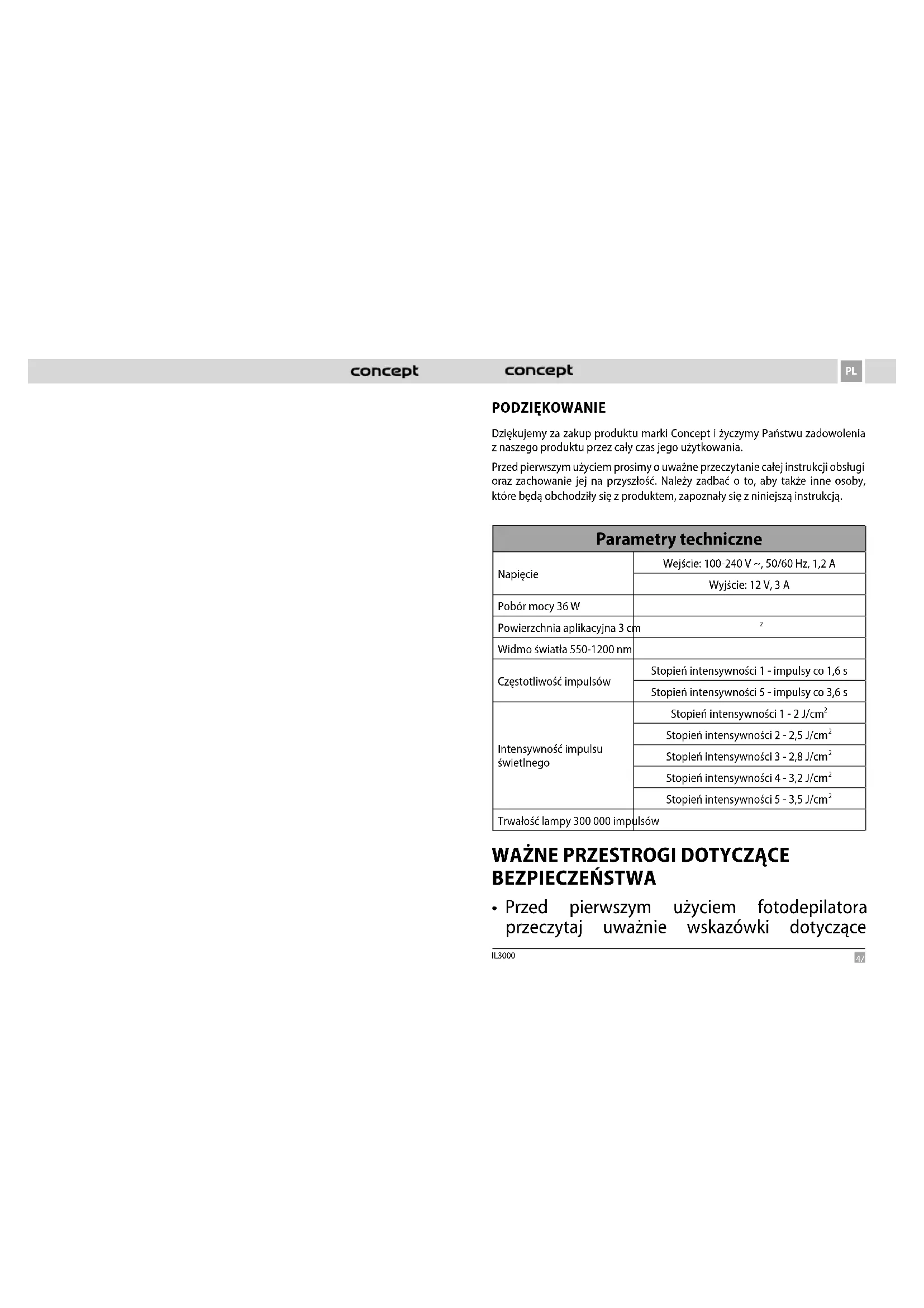 IL3000 PODZIĘKOWANIE Dziękujemy za zakup produktu marki Concept i życzymy Państwu zadowolenia znaszego produktu przez cały czas jego użytkowania. Przed pierwszym użyciem prosimy o uważne przeczytanie całej instrukcji obsługi oraz zachowanie jej na przyszłość. Należy zadbać o to, aby także inne osoby, które będą obchodziły się z produktem, zapoznały się z niniejszą instrukcją. Parametry techniczne Napięcie Wejście: 100-240 V ~, 50/60 Hz, 1,2 A Wyjście: 12 V, 3 A Pobór mocy 36 W Powierzchnia aplikacyjna 3 cm