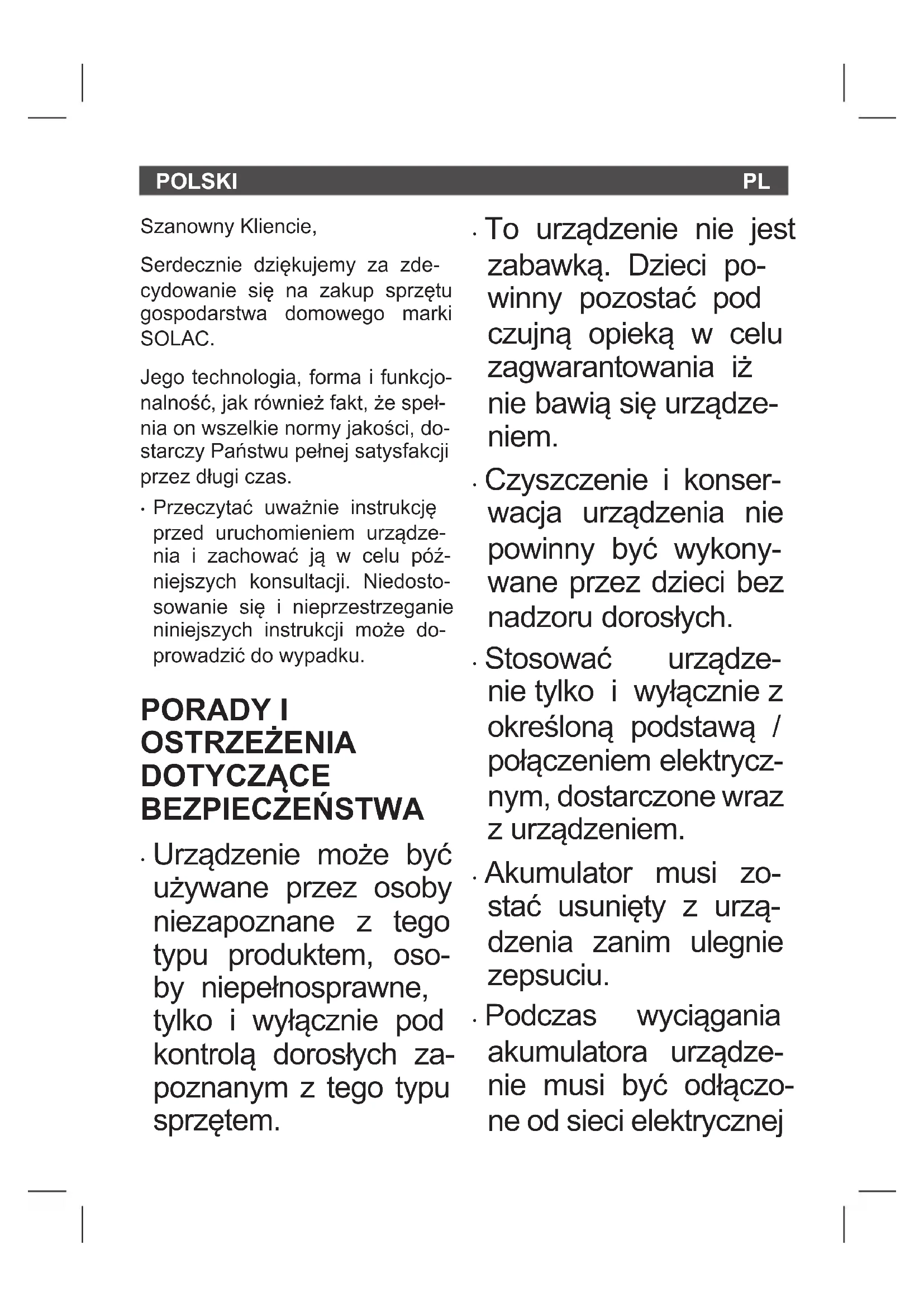 - Przeczytać uważnie instrukcję przed uruchomieniem urządze- nia i zachować ją w celu póź- niejszych konsultacji. Niedosto- sowanie się i nieprzestrzeganie niniejszych instrukcji może do- prowadzić do wypadku. PORADY I OSTRZEŻENIA DOTYCZĄCE BEZPIECZEŃSTWA