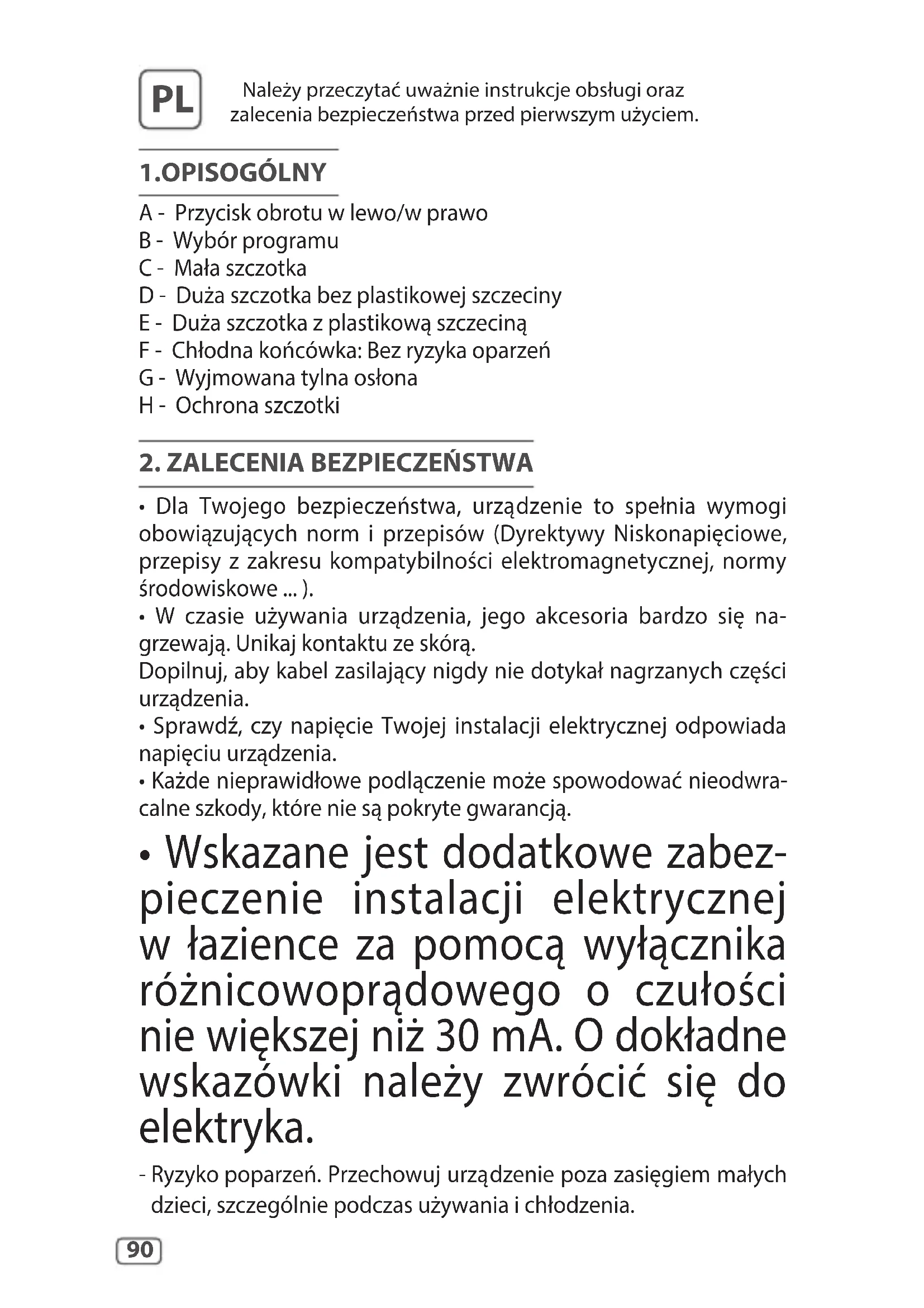A - Przycisk obrotu w lewo/w prawo B - Wybór programu C - Mała szczotka D - Duża szczotka bez plastikowej szczeciny E - Duża szczotka z plastikową szczeciną F - Chłodna końcówka: Bez ryzyka oparzeń G - Wyjmowana tylna osłona H - Ochrona szczotki