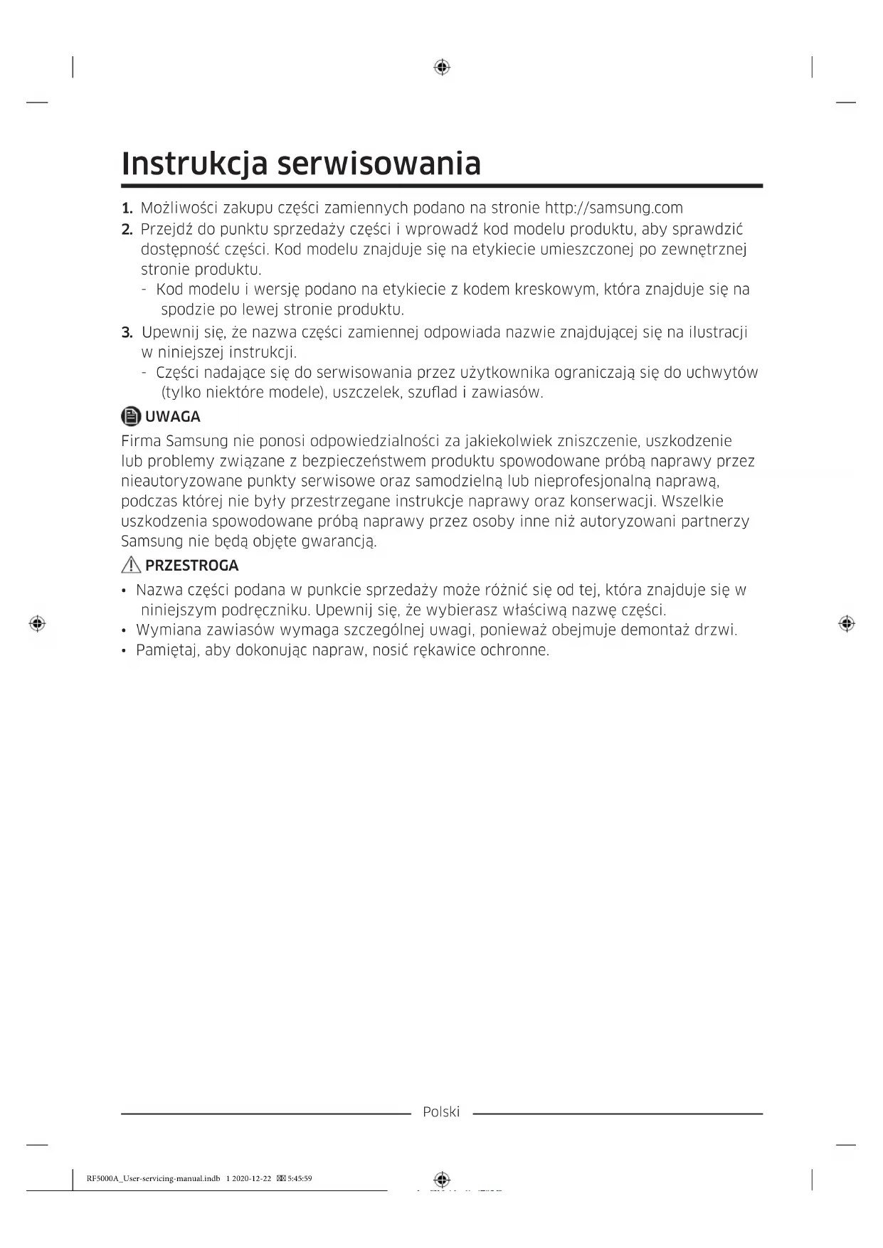 - Aby ponownie włożyć szuadę, wsuń ją w prowadnice, a następnie przesuń do wewnątrz. RF5000A_User-servicing-manual.indb 8 2020-12-22 5:46:01Polski Wymiana zawiasów Aby wymienić zawiasy, w pierwszej kolejności musisz zdemontować drzwi. PRZESTROGA