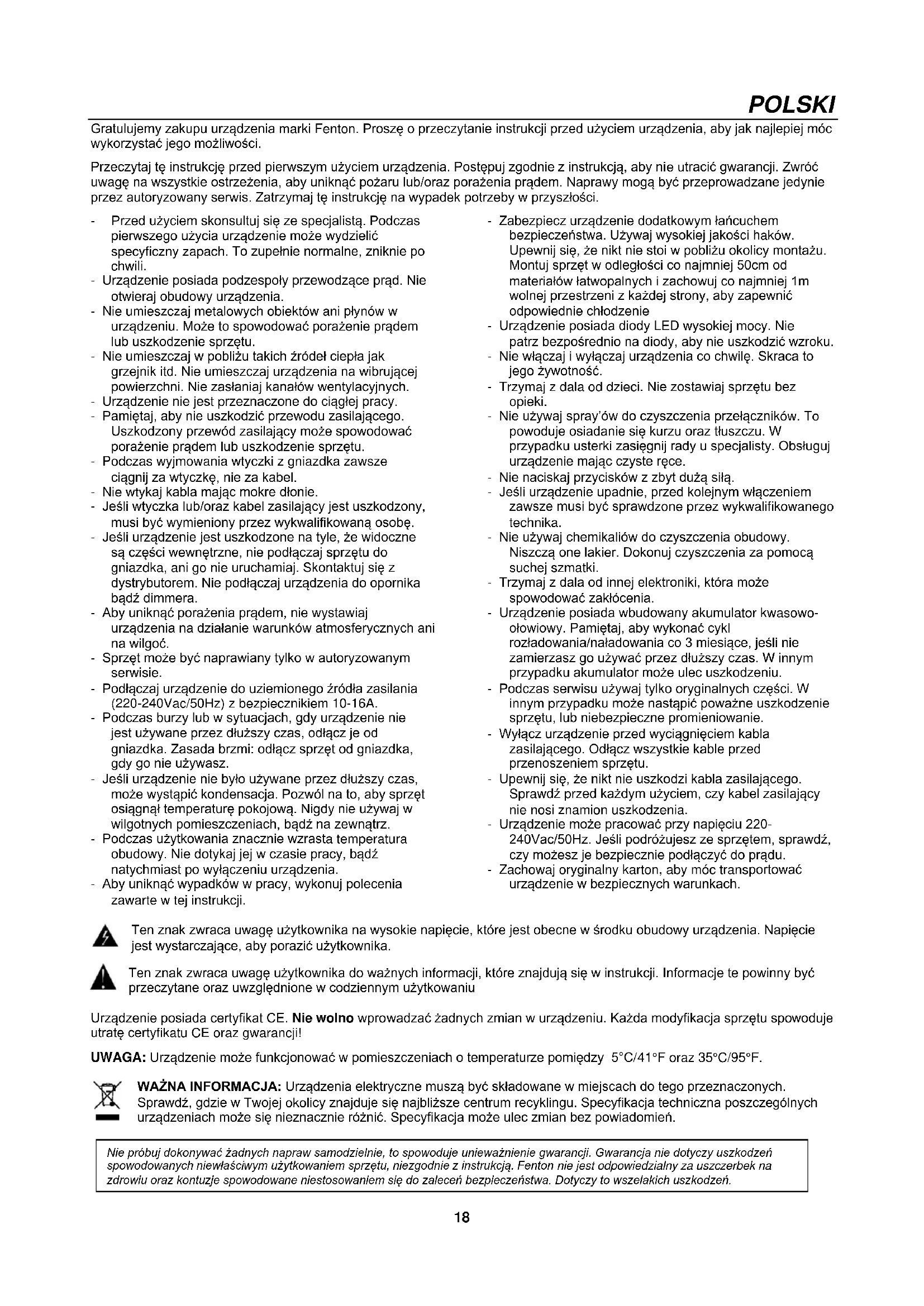 Avant de relier le cordon d'alimentation, assurez-vous que la tension secteur correspond bien à la tension notée sur la plaque d'information sur l'appareil.18 POLSKI Gratulujemy zakupu urządzenia marki Fenton. Proszę o przeczytanie instrukcji przed użyciem urządzenia, aby jak najlepiej móc wykorzystać jego możliwości. Przeczytaj tę instrukcję przed pierwszym użyciem urządzenia. Postępuj zgodnie z instrukcją, aby nie utracić gwarancji. Zwróć uwagę na wszystkie ostrzeżenia, aby uniknąć pożaru lub/oraz porażenia prądem. Naprawy mogą być przeprowadzane jedynie przez autoryzowany serwis. Zatrzymaj tę instrukcję na wypadek potrzeby w przyszłości. - Przed użyciem skonsultuj się ze specjalistą. Podczas pierwszego użycia urządzenie może wydzielić specyficzny zapach. To zupełnie normalne, zniknie po chwili. - Urządzenie posiada podzespoły przewodzące prąd. Nie otwieraj obudowy urządzenia. - Nie umieszczaj metalowych obiektów ani płynów w urządzeniu. Może to spowodować porażenie prądem lub uszkodzenie sprzętu. - Nie umieszczaj w pobliżu takich źródeł ciepła jak grzejnik itd. Nie umieszczaj urządzenia na wibrującej powierzchni. Nie zasłaniaj kanałów wentylacyjnych. - Urządzenie nie jest przeznaczone do ciągłej pracy. - Pamiętaj, aby nie uszkodzić przewodu zasilającego. Uszkodzony przewód zasilający może spowodować porażenie prądem lub uszkodzenie sprzętu. - Podczas wyjmowania wtyczki z gniazdka zawsze ciągnij za wtyczkę, nie za kabel. - Nie wtykaj kabla mając mokre dłonie. - Jeśli wtyczka lub/oraz kabel zasilający jest uszkodzony, musi być wymieniony przez wykwalifikowaną osobę. - Jeśli urządzenie jest uszkodzone na tyle, że widoczne są części wewnętrzne, nie podłączaj sprzętu do gniazdka, ani go nie uruchamiaj. Skontaktuj się z dystrybutorem. Nie podłączaj urządzenia do opornika bądź dimmera. - Aby uniknąć porażenia prądem, nie wystawiaj urządzenia na działanie warunków atmosferycznych ani na wilgoć. - Sprzęt może być naprawiany tylko w autoryzowanym serwisie. - Podłączaj urządzenie do uziemionego źródła zasilania (220-240Vac/50Hz) z bezpiecznikiem 10-16A. - Podczas burzy lub w sytuacjach, gdy urządzenie nie jest używane przez dłuższy czas, odłącz je od gniazdka. Zasada brzmi: odłącz sprzęt od gniazdka, gdy go nie używasz. - Jeśli urządzenie nie było używane przez dłuższy czas, może wystąpić kondensacja. Pozwól na to, aby sprzęt osiągnął temperaturę pokojową. Nigdy nie używaj w wilgotnych pomieszczeniach, bądź na zewnątrz. - Podczas użytkowania znacznie wzrasta temperatura obudowy. Nie dotykaj jej w czasie pracy, bądź natychmiast po wyłączeniu urządzenia. - Aby uniknąć wypadków w pracy, wykonuj polecenia zawarte w tej instrukcji. - Zabezpiecz urządzenie dodatkowym łańcuchem bezpieczeństwa. Używaj wysokiej jakości haków. Upewnij się, że nikt nie stoi w pobliżu okolicy montażu. Montuj sprzęt w odległości co najmniej 50cm od materiałów łatwopalnych i zachowuj co najmniej 1m wolnej przestrzeni z każdej strony, aby zapewnić odpowiednie chłodzenie - Urządzenie posiada diody LED wysokiej mocy. Nie patrz bezpośrednio na diody, aby nie uszkodzić wzroku. - Nie włączaj i wyłączaj urządzenia co chwilę. Skraca to jego żywotność. - Trzymaj z dala od dzieci. Nie zostawiaj sprzętu bez opieki. - Nie używaj spray’ów do czyszczenia przełączników. To powoduje osiadanie się kurzu oraz tłuszczu. W przypadku usterki zasięgnij rady u specjalisty. Obsługuj urządzenie mając czyste ręce. - Nie naciskaj przycisków z zbyt dużą siłą. - Jeśli urządzenie upadnie, przed kolejnym włączeniem zawsze musi być sprawdzone przez wykwalifikowanego technika. - Nie używaj chemikaliów do czyszczenia obudowy. Niszczą one lakier. Dokonuj czyszczenia za pomocą suchej szmatki. - Trzymaj z dala od innej elektroniki, która może spowodować zakłócenia. - Urządzenie posiada wbudowany akumulator kwasowo- ołowiowy. Pamiętaj, aby wykonać cykl rozładowania/naładowania co 3 miesiące, jeśli nie zamierzasz go używać przez dłuższy czas. W innym przypadku akumulator może ulec uszkodzeniu. - Podczas serwisu używaj tylko oryginalnych części. W innym przypadku może nastąpić poważne uszkodzenie sprzętu, lub niebezpieczne promieniowanie. - Wyłącz urządzenie przed wyciągnięciem kabla zasilającego. Odłącz wszystkie kable przed przenoszeniem sprzętu. - Upewnij się, że nikt nie uszkodzi kabla zasilającego. Sprawdź przed każdym użyciem, czy kabel zasilający nie nosi znamion uszkodzenia. - Urządzenie może pracować przy napięciu 220- 240Vac/50Hz. Jeśli podróżujesz ze sprzętem, sprawdź, czy możesz je bezpiecznie podłączyć do prądu. - Zachowaj oryginalny karton, aby móc transportować urządzenie w bezpiecznych warunkach. Ten znak zwraca uwagę użytkownika na wysokie napięcie, które jest obecne w środku obudowy urządzenia. Napięcie jest wystarczające, aby porazić użytkownika. Ten znak zwraca uwagę użytkownika do ważnych informacji, które znajdują się w instrukcji. Informacje te powinny być przeczytane oraz uwzględnione w codziennym użytkowaniu Urządzenie posiada certyfikat CE. Nie wolno wprowadzać żadnych zmian w urządzeniu. Każda modyfikacja sprzętu spowoduje utratę certyfikatu CE oraz gwarancji! UWAGA: Urządzenie może funkcjonować w pomieszczeniach o temperaturze pomiędzy 5°C/41°F oraz 35°C/95°F. WAŻNA INFORMACJA: Urządzenia elektryczne muszą być składowane w miejscach do tego przeznaczonych. Sprawdź, gdzie w Twojej okolicy znajduje się najbliższe centrum recyklingu. Specyfikacja techniczna poszczególnych urządzeniach może się nieznacznie różnić. Specyfikacja może ulec zmian bez powiadomień. Nie próbuj dokonywać żadnych napraw samodzielnie, to spowoduje unieważnienie gwarancji. Gwarancja nie dotyczy uszkodzeń spowodowanych niewłaściwym użytkow