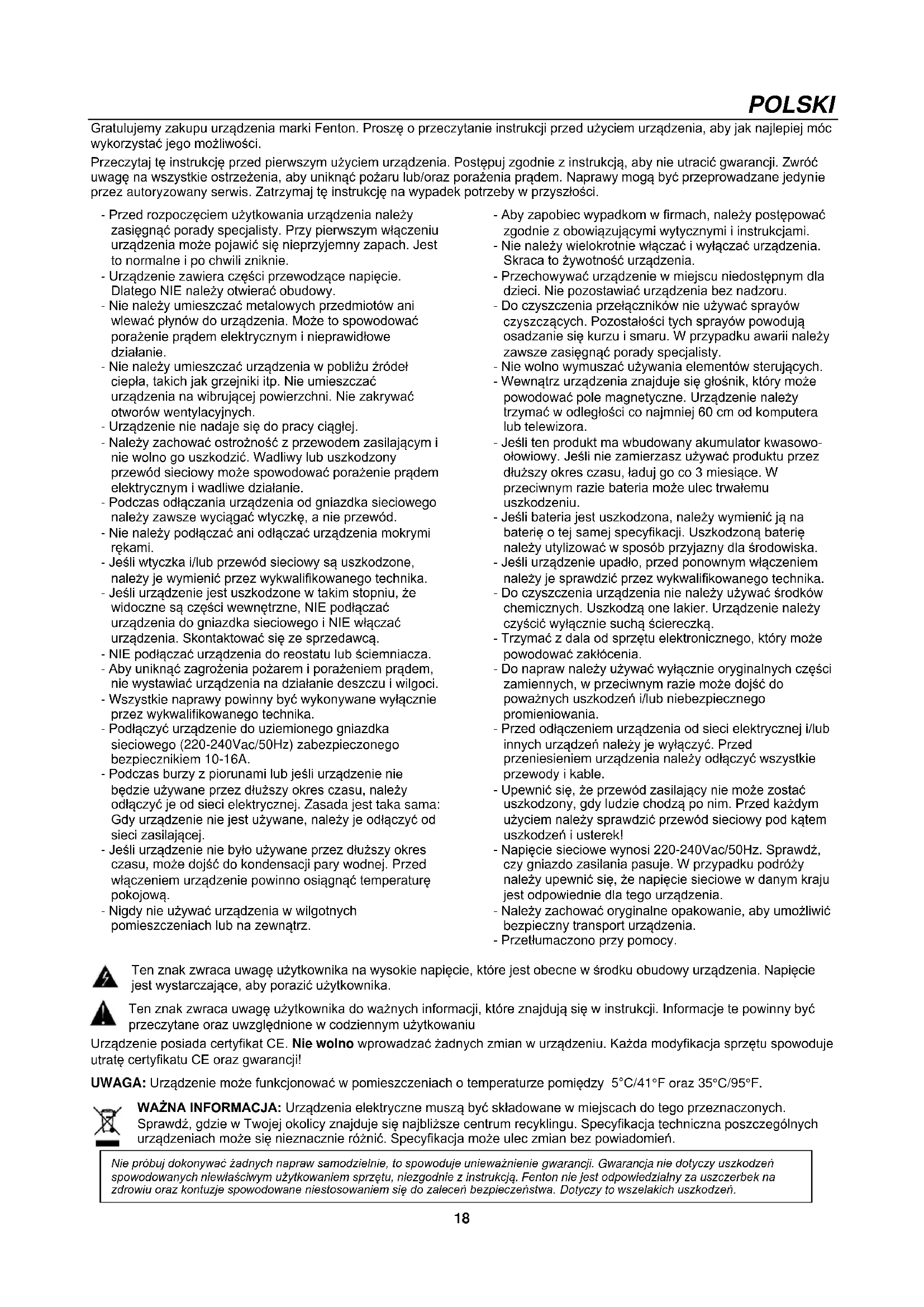 Si un mot de passe est demandé, vous pouvez saisir "0000". Attention: la distance BT est de 10 mètres environ sans obstacle.18 POLSKI Gratulujemy zakupu urządzenia marki Fenton. Proszę o przeczytanie instrukcji przed użyciem urządzenia, aby jak najlepiej móc wykorzystać jego możliwości. Przeczytaj tę instrukcję przed pierwszym użyciem urządzenia. Postępuj zgodnie z instrukcją, aby nie utracić gwarancji. Zwróć uwagę na wszystkie ostrzeżenia, aby uniknąć pożaru lub/oraz porażenia prądem. Naprawy mogą być przeprowadzane jedynie przez autoryzowany serwis. Zatrzymaj tę instrukcję na wypadek potrzeby w przyszłości. - Przed rozpoczęciem użytkowania urządzenia należy zasięgnąć porady specjalisty. Przy pierwszym włączeniu urządzenia może pojawić się nieprzyjemny zapach. Jest to normalne i po chwili zniknie. - Urządzenie zawiera części przewodzące napięcie. Dlatego NIE należy otwierać obudowy. - Nie należy umieszczać metalowych przedmiotów ani wlewać płynów do urządzenia. Może to spowodować porażenie prądem elektrycznym i nieprawidłowe działanie. - Nie należy umieszczać urządzenia w pobliżu źródeł ciepła, takich jak grzejniki itp. Nie umieszczać urządzenia na wibrującej powierzchni. Nie zakrywać otworów wentylacyjnych. - Urządzenie nie nadaje się do pracy ciągłej. - Należy zachować ostrożność z przewodem zasilającym i nie wolno go uszkodzić. Wadliwy lub uszkodzony przewód sieciowy może spowodować porażenie prądem elektrycznym i wadliwe działanie. - Podczas odłączania urządzenia od gniazdka sieciowego należy zawsze wyciągać wtyczkę, a nie przewód. - Nie należy podłączać ani odłączać urządzenia mokrymi rękami. - Jeśli wtyczka i/lub przewód sieciowy są uszkodzone, należy je wymienić przez wykwalifikowanego technika. - Jeśli urządzenie jest uszkodzone w takim stopniu, że widoczne są części wewnętrzne, NIE podłączać urządzenia do gniazdka sieciowego i NIE włączać urządzenia. Skontaktować się ze sprzedawcą. - NIE podłączać urządzenia do reostatu lub ściemniacza. - Aby uniknąć zagrożenia pożarem i porażeniem prądem, nie wystawiać urządzenia na działanie deszczu i wilgoci. - Wszystkie naprawy powinny być wykonywane wyłącznie przez wykwalifikowanego technika. - Podłączyć urządzenie do uziemionego gniazdka sieciowego (220-240Vac/50Hz) zabezpieczonego bezpiecznikiem 10-16A. - Podczas burzy z piorunami lub jeśli urządzenie nie będzie używane przez dłuższy okres czasu, należy odłączyć je od sieci elektrycznej. Zasada jest taka sama: Gdy urządzenie nie jest używane, należy je odłączyć od sieci zasilającej. - Jeśli urządzenie nie było używane przez dłuższy okres czasu, może dojść do kondensacji pary wodnej. Przed włączeniem urządzenie powinno osiągnąć temperaturę pokojową. - Nigdy nie używać urządzenia w wilgotnych pomieszczeniach lub na zewnątrz. - Aby zapobiec wypadkom w firmach, należy postępować zgodnie z obowiązującymi wytycznymi i instrukcjami. - Nie należy wielokrotnie włączać i wyłączać urządzenia. Skraca to żywotność urządzenia. - Przechowywać urządzenie w miejscu niedostępnym dla dzieci. Nie pozostawiać urządzenia bez nadzoru. - Do czyszczenia przełączników nie używać sprayów czyszczących. Pozostałości tych sprayów powodują osadzanie się kurzu i smaru. W przypadku awarii należy zawsze zasięgnąć porady specjalisty. - Nie wolno wymuszać używania elementów sterujących. - Wewnątrz urządzenia znajduje się głośnik, który może powodować pole magnetyczne. Urządzenie należy trzymać w odległości co najmniej 60 cm od komputera lub telewizora. - Jeśli ten produkt ma wbudowany akumulator kwasowo- ołowiowy. Jeśli nie zamierzasz używać produktu przez dłuższy okres czasu, ładuj go co 3 miesiące. W przeciwnym razie bateria może ulec trwałemu uszkodzeniu. - Jeśli bateria jest uszkodzona, należy wymienić ją na baterię o tej samej specyfikacji. Uszkodzoną baterię należy utylizować w sposób przyjazny dla środowiska. - Jeśli urządzenie upadło, przed ponownym włączeniem należy je sprawdzić przez wykwalifikowanego technika. - Do czyszczenia urządzenia nie należy używać środków chemicznych. Uszkodzą one lakier. Urządzenie należy czyścić wyłącznie suchą ściereczką. - Trzymać z dala od sprzętu elektronicznego, który może powodować zakłócenia. - Do napraw należy używać wyłącznie oryginalnych części zamiennych, w przeciwnym razie może dojść do poważnych uszkodzeń i/lub niebezpiecznego promieniowania. - Przed odłączeniem urządzenia od sieci elektrycznej i/lub innych urządzeń należy je wyłączyć. Przed przeniesieniem urządzenia należy odłączyć wszystkie przewody i kable. - Upewnić się, że przewód zasilający nie może zostać uszkodzony, gdy ludzie chodzą po nim. Przed każdym użyciem należy sprawdzić przewód sieciowy pod kątem uszkodzeń i usterek! - Napięcie sieciowe wynosi 220-240Vac/50Hz. Sprawdź, czy gniazdo zasilania pasuje. W przypadku podróży należy upewnić się, że napięcie sieciowe w danym kraju jest odpowiednie dla tego urządzenia. - Należy zachować oryginalne opakowanie, aby umożliwić bezpieczny transport urządzenia. - Przetłumaczono przy pomocy. Ten znak zwraca uwagę użytkownika na wysokie napięcie, które jest obecne w środku obudowy urządzenia. Napięcie jest wystarczające, aby porazić użytkownika. Ten znak zwraca uwagę użytkownika do ważnych informacji, które znajdują się w instrukcji. Informacje te powinny być przeczytane oraz uwzględnione w codziennym użytkowaniu Urządzenie posiada certyfikat CE. Nie wolno wprowadzać żadnych zmian w urządzeniu. Każda modyfikacja sprzętu spowoduje utratę certyfikatu CE oraz gwarancji! UWAGA: Urządzenie może funkcjonować w pomieszczeniach o temperaturze pomiędzy 5°C/41°F oraz 35°C/95°F. WAŻNA INFORMACJA: Ur