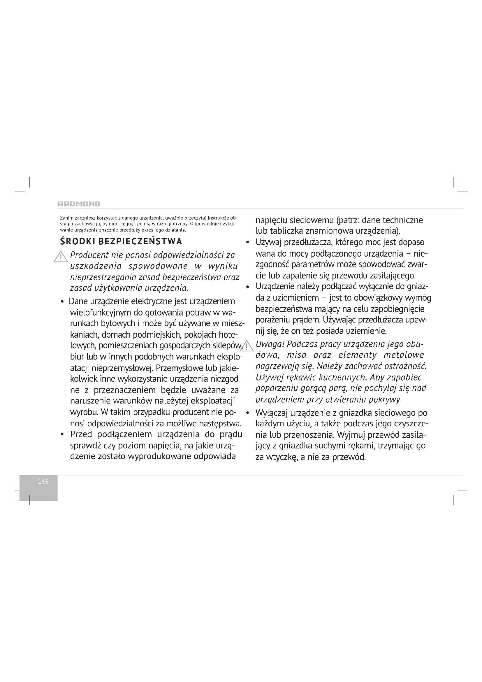 - Dane urządzenie elektryczne jest urządzeniem wielofunkcyjnym do gotowania potraw w wa- runkach bytowych i może być używane w miesz- kaniach, domach podmiejskich, pokojach hote- lowych, pomieszczeniach gospodarczych sklepów, biur lub w innych podobnych warunkach eksplo- atacji nieprzemysłowej. Przemysłowe lub jakie- kolwiek inne wykorzystanie urządzenia niezgod- ne z przeznaczeniem będzie uważane za naruszenie warunków należytej eksploatacji wyrobu. W takim przypadku producent nie po- nosi odpowiedzialności za możliwe następstwa.