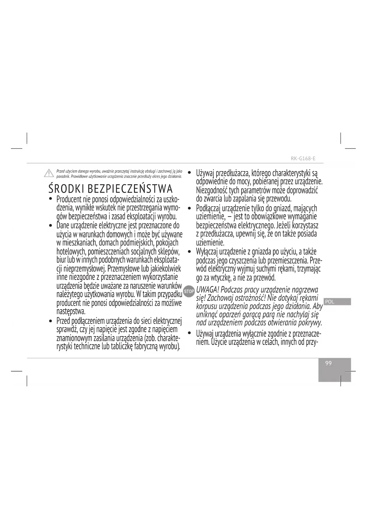 Dzieci w wieku 8 lat i więcej oraz osoby z ograniczo- nymi zdolnościami zycznymi, sensorycznymi lub umysłowymi lub nieposiadające wiedzy lub doświad- czenia, pod warunkiem, że będą one nadzorowane i/lub zostaną poinstruowane na temat korzystania z tego urządzenia w sposób bezpieczny oraz mają świadomość potencjalnych zagrożeń, wynikających z jego użytkowania. Dzieci powinny znajdować się pod nadzorem, aby nie dopuścić do zabawy z urzą-RK-G168-E