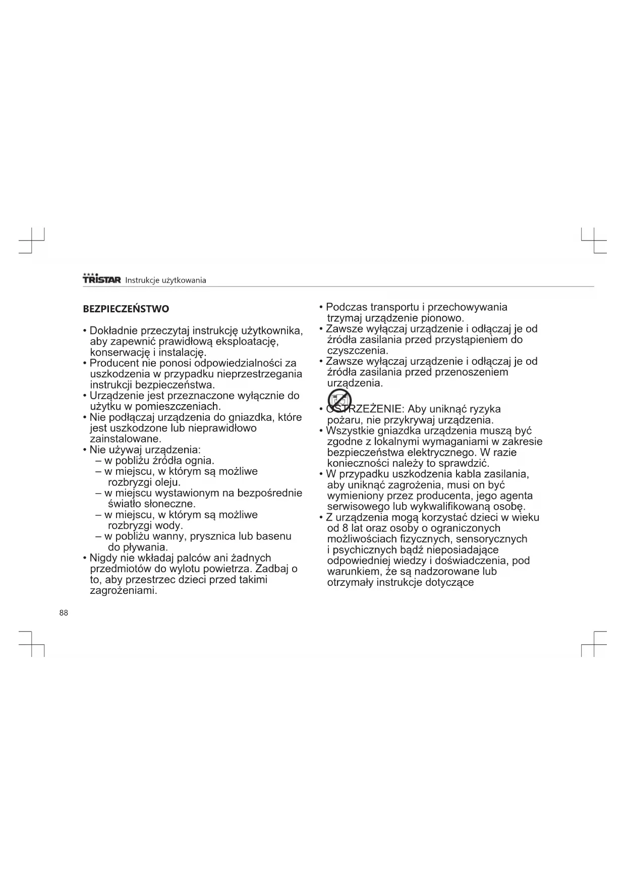 - Nie używaj urządzenia: – w pobliżu źródła ognia. – w miejscu, w którym są możliwe rozbryzgi oleju. – w miejscu wystawionym na bezpośrednie światło słoneczne. – w miejscu, w którym są możliwe rozbryzgi wody. – w pobliżu wanny, prysznica lub basenu do pływania.