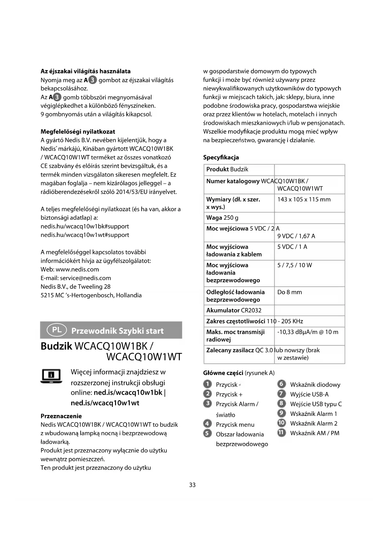 - Baterii lub akumulatorów używaj tylko do celu, do którego zostały przeznaczone. WCACQ10W1BK_WCACQ10W1WT_MAN_COMP_0520_QSG_(20257 1422)_v1.0.indd 34 26/05/2020 10:59:0735 Korzystanie z lampki nocnejNaciśnij A3, aby włączyć lampkę nocną.Naciskaj A 3, aby przejść przez różne tryby podświetlenia.Po 9 naciśnięciach światło zgaśnie.Deklaracja zgodnościNiniejszym rma Nedis B.V. deklaruje jako producent, że produkt WCACQ10W1BK / WCACQ10W1WT naszej marki Nedis , produkowany w Chinach, został przetestowany zgodnie ze wszystkimi odpowiednimi normami i przepisami WE oraz że we wszystkich testach uzyskał on pozytywny rezultat. Obejmuje to, ale nie ogranicza się do rozporządzenia RED 2014/53/UE.Pełną deklarację zgodności (oraz kartę danych bezpieczeństwa, jeśli dotyczy) można znaleźć i pobrać tutaj:nedis.pl/wcacq10w1bk#supportnedis.pl/wcacq10w1wt#supportAby uzyskać dodatkowe informacje dotyczące zgodności, skontaktuj się z obsługą klienta:Strona www: www.nedis.comE-mail: service@nedis.comNedis B.V., de Tweeling 285215 MC ’s-Hertogenbosch, Holandia.