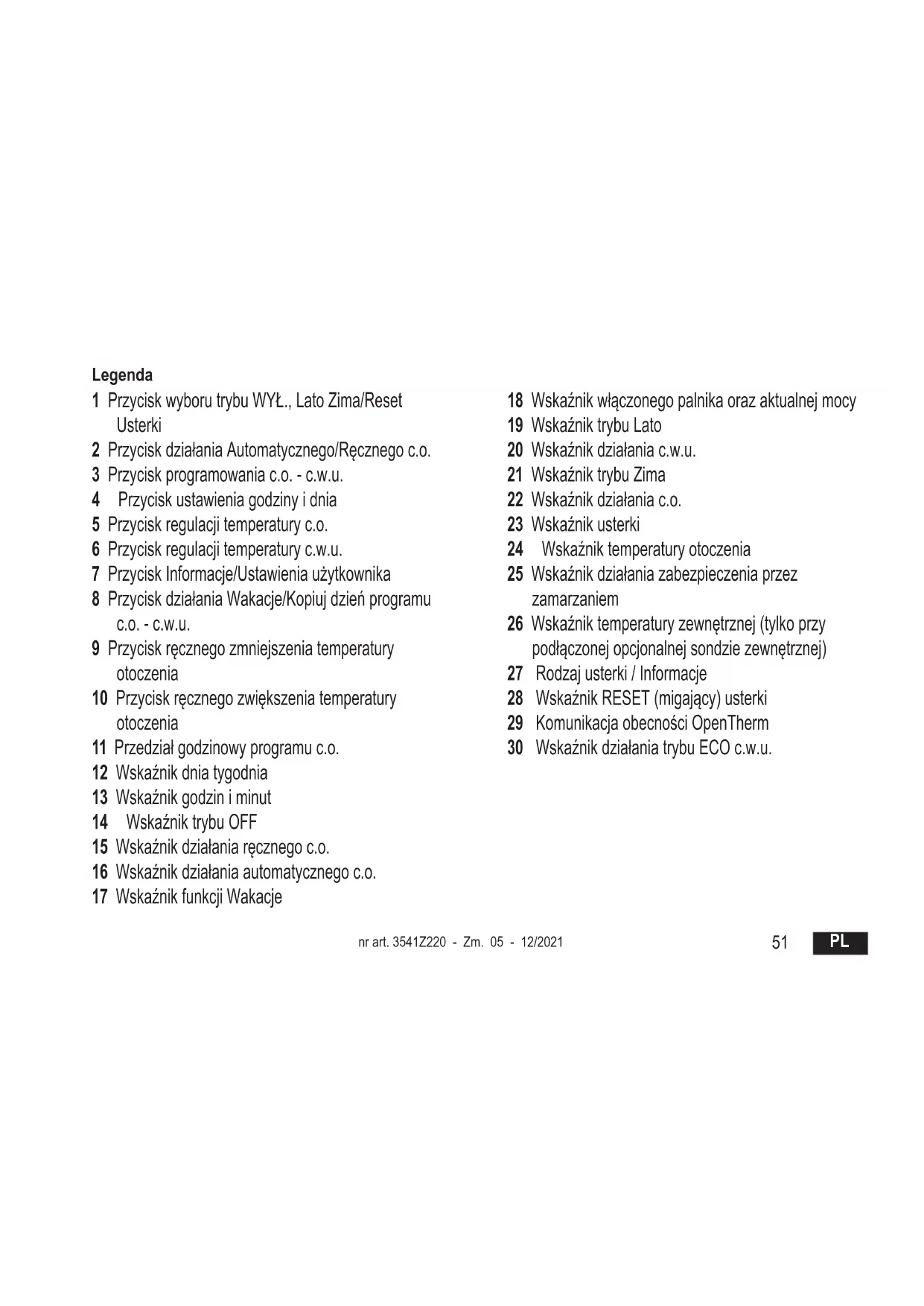 50Legenda 1 PrzyciskwyborutrybuWYŁ.,LatoZima/Reset Usterki 2 PrzyciskdziałaniaAutomatycznego/Ręcznegoc.o. 3 Przyciskprogramowaniac.o.-c.w.u. 4 Przyciskustawieniagodzinyidnia 5 Przyciskregulacjitemperaturyc.o. 6 Przyciskregulacjitemperaturyc.w.u. 7 PrzyciskInformacje/Ustawieniaużytkownika 8 PrzyciskdziałaniaWakacje/Kopiujdzieńprogramu c.o.-c.w.u. 9 Przyciskręcznegozmniejszeniatemperatury otoczenia 10 Przyciskręcznegozwiększeniatemperatury otoczenia 11 Przedziałgodzinowyprogramuc.o. 12 Wskaźnikdniatygodnia 13 Wskaźnikgodziniminut 14 WskaźniktrybuOFF 15 Wskaźnikdziałaniaręcznegoc.o. 16 Wskaźnikdziałaniaautomatycznegoc.o. 17 WskaźnikfunkcjiWakacje 18 Wskaźnikwłączonegopalnikaorazaktualnejmocy 19 WskaźniktrybuLato 20 Wskaźnikdziałaniac.w.u. 21 WskaźniktrybuZima 22 Wskaźnikdziałaniac.o. 23 Wskaźnikusterki 24 Wskaźniktemperaturyotoczenia 25 Wskaźnikdziałaniazabezpieczeniaprzez zamarzaniem 26 Wskaźniktemperaturyzewnętrznej(tylkoprzy podłączonejopcjonalnejsondziezewnętrznej) 27 Rodzajusterki/Informacje 28 WskaźnikRESET(migający)usterki 29 KomunikacjaobecnościOpenTherm 30 WskaźnikdziałaniatrybuECOc.w.u. nr art. 3541Z220 - Zm. 05 - 12/2021
