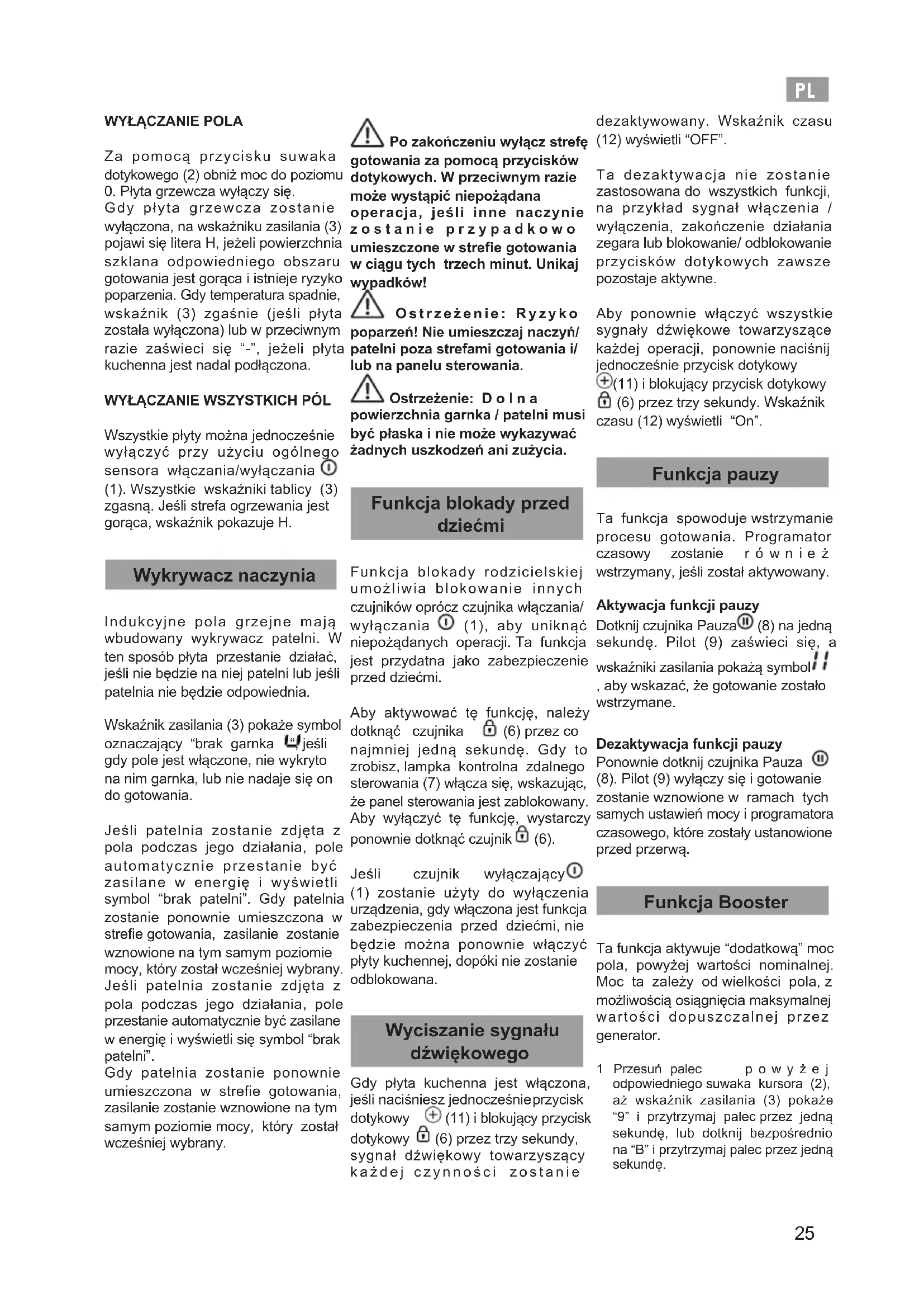 Wszystkie płyty można jednocześnie wyłączyć przy użyciu ogólnego sensora włączania/wyłączania (1). Wszystkie wskaźniki tablicy (3) zgasną. Jeśli strefa ogrzewania jest gorąca, wskaźnik pokazuje H. Wykrywacz naczynia Indukcyjne pola grzejne mają wbudowany wykrywacz patelni. W ten sposób płyta przestanie działać, jeśli nie będzie na niej patelni lub jeśli patelnia nie będzie odpowiednia. Wskaźnik zasilania (3) pokaże symbol oznaczający “brak garnka “, jeśli gdy pole jest włączone, nie wykryto na nim garnka, lub nie nadaje się on do gotowania. Jeśli patelnia zostanie zdjęta z pola podczas jego działania, pole automatycznie przestanie być zasilane w energię i wyświetli symbol “brak patelni”. Gdy patelnia zostanie ponownie umieszczona w stree gotowania, zasilanie zostanie wznowione na tym samym poziomie mocy, który został wcześniej wybrany. Jeśli patelnia zostanie zdjęta z pola podczas jego działania, pole przestanie automatycznie być zasilane w energię i wyświetli się symbol “brak patelni”. Gdy patelnia zostanie ponownie umieszczona w strefie gotowania, zasilanie zostanie wznowione na tym samym poziomie mocy, który został wcześniej wybrany. Po zakończeniu wyłącz strefę gotowania za pomocą przycisków dotykowych. W przeciwnym razie może wystąpić niepożądana operacja, jeśli inne naczynie zostanie przypadkowo umieszczone w stree gotowania w ciągu tych trzech minut. Unikaj wypadków! Ostrzeżenie: Ryzyko poparzeń! Nie umieszczaj naczyń/ patelni poza strefami gotowania i/ lub na panelu sterowania. Ostrzeżenie: D o l n a powierzchnia garnka / patelni musi być płaska i nie może wykazywać żadnych uszkodzeń ani zużycia. Funkcja blokady przed dziećmi Funkcja blokady rodzicielskiej umożliwia blokowanie innych czujników oprócz czujnika włączania/ wyłączania (1), aby uniknąć niepożądanych operacji. Ta funkcja jest przydatna jako zabezpieczenie przed dziećmi. Aby aktywować tę funkcję, należy dotknąć czujnika (6) przez co najmniej jedną sekundę. Gdy to zrobisz, lampka kontrolna zdalnego sterowania (7) włącza się, wskazując, że panel sterowania jest zablokowany. Aby wyłączyć tę funkcję, wystarczy ponownie dotknąć czujnik (6). Jeśli czujnik wyłączający (1) zostanie użyty do wyłączenia urządzenia, gdy włączona jest funkcja zabezpieczenia przed dziećmi, nie będzie można ponownie włączyć płyty kuchennej, dopóki nie zostanie odblokowana. Wyciszanie sygnału dźwiękowego Gdy płyta kuchenna jest włączona, jeśli naciśniesz jednocześnie przycisk dotykowy (11) i blokujący przycisk dotykowy (6) przez trzy sekundy, sygnał dźwiękowy towarzyszący każdej czynności zostanie dezaktywowany. Wskaźnik czasu (12) wyświetli “OFF”. Ta dezaktywacja nie zostanie zastosowana do wszystkich funkcji, na przykład sygnał włączenia / wyłączenia, zakończenie działania zegara lub blokowanie/ odblokowanie przycisków dotykowych zawsze pozostaje aktywne. Aby ponownie włączyć wszystkie sygnały dźwiękowe towarzyszące każdej operacji, ponownie naciśnij jednocześnie przycisk dotykowy (11) i blokujący przycisk dotykowy (6) przez trzy sekundy. Wskaźnik czasu (12) wyświetli “On”. Funkcja pauzy Ta funkcja spowoduje wstrzymanie procesu gotowania. Programator czasowy zostanie r ó w n i e ż wstrzymany, jeśli został aktywowany. Aktywacja funkcji pauzy Dotknij czujnika Pauza (8) na jedną sekundę. Pilot (9) zaświeci się, a wskaźniki zasilania pokażą symbol , aby wskazać, że gotowanie zostało wstrzymane. Dezaktywacja funkcji pauzy Ponownie dotknij czujnika Pauza (8). Pilot (9) wyłączy się i gotowanie zostanie wznowione w ramach tych samych ustawień mocy i programatora czasowego, które zostały ustanowione przed przerwą. Funkcja Booster Ta funkcja aktywuje “dodatkową” moc pola, powyżej wartości nominalnej. Moc ta zależy od wielkości pola, z możliwością osiągnięcia maksymalnej wartości dopuszczalnej przez generator. 1 Przesuń palec p o w y ż e j odpowiedniego suwaka kursora (2), aż wskaźnik zasilania (3) pokaże “9” i przytrzymaj palec przez jedną sekundę, lub dotknij bezpośrednio na “B” i przytrzymaj palec przez jedną sekundę.PL