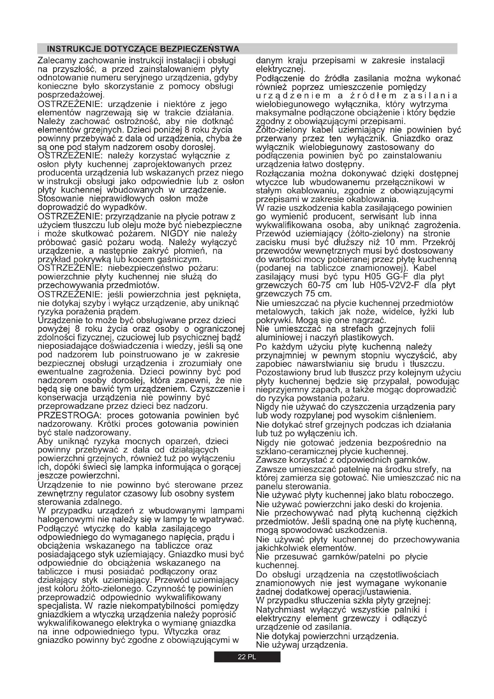 AUX 1kW 1 1 1 1 1 SR 1,75 kW 2 - 1 1 2 R 2,7 kW 1 1 1 2 1 DC 4 kW Mono - - 1 - - DC 4,2 kW Mono - - - - 1 DC 4,5 kW Mono - 1 - 1 - Entrada nomnal de calor 7,2kW 8,2kW 9,45kW 12,65kW NG 11,4kW LPG 11,2kW G20/20 mbar 686 l/h 781 l/h 900 l/h 1204 l/h 1085 l/h G30/28-30 mbar 524 g/h 596 g/h 688 g/h 920 g/h 814 g/h Clase de nstalacón 3 3 3 3 3 Voltaje / Frecuenca V / Hz 220-240V 50/60Hz 220-240V 50/60Hz 220-240V 50/60Hz 220-240V 50/60Hz 220-240V 50/60Hz Potenca de entrada 1 1 1 1 1 Igncón eléctrca S S S S S Dmensón del producto 595x505x42 595x505x42 595x505x42 745x505x42 745x505x4222 PL OSTRZEŻENIE: urządzenie i niektóre z jego elementów nagrzewają się w trakcie działania. Należy zachować ostrożność, aby nie dotknąć elementów grzejnych. Dzieci poniżej 8 roku życia powinny przebywać z dala od urządzenia, chyba że są one pod stałym nadzorem osoby dorosłej. OSTRZEŻENIE: należy korzystać wyłącznie z osłon płyty kuchennej zaprojektowanych przez producenta urządzenia lub wskazanych przez niego w instrukcji obsługi jako odpowiednie lub z osłon płyty kuchennej wbudowanych w urządzenie. Stosowanie nieprawidłowych osłon może doprowadzić do wypadków. OSTRZEŻENIE: przyrządzanie na płycie potraw z użyciem tłuszczu lub oleju może być niebezpieczne i może skutkować pożarem. NIGDY nie należy próbować gasić pożaru wodą. Należy wyłączyć urządzenie, a następnie zakryć płomień, na przykład pokrywką lub kocem gaśniczym. Zalecamy zachowanie instrukcji instalacji i obsługi na przyszłość, a przed zainstalowaniem płyty odnotowanie numeru seryjnego urządzenia, gdyby konieczne było skorzystanie z pomocy obsługi posprzedażowej. OSTRZEŻENIE: niebezpieczeństwo pożaru: powierzchnie płyty kuchennej nie służą do przechowywania przedmiotów. OSTRZEŻENIE: jeśli powierzchnia jest pęknięta, nie dotykaj szyby i wyłącz urządzenie, aby uniknąć ryzyka porażenia prądem. Urządzenie to może być obsługiwane przez dzieci powyżej 8 roku życia oraz osoby o ograniczonej zdolności fizycznej, czuciowej lub psychicznej bądź nieposiadające doświadczenia i wiedzy, jeśli są one pod nadzorem lub poinstruowano je w zakresie bezpiecznej obsługi urządzenia i zrozumiały one ewentualne zagrożenia. Dzieci powinny być pod nadzorem osoby dorosłej, która zapewni, że nie będą się one bawić tym urządzeniem. Czyszczenie i konserwacja urządzenia nie powinny być przeprowadzane przez dzieci bez nadzoru. PRZESTROGA: proces gotowania powinien być nadzorowany. Krótki proces gotowania powinien być stale nadzorowany. Aby uniknąć ryzyka mocnych oparzeń, dzieci powinny przebywać z dala od działających powierzchni grzejnych, również tuż po wyłączeniu ich, dopóki świeci się lampka informująca o gorącej jeszcze powierzchni. Urządzenie to nie powinno być sterowane przez zewnętrzny regulator czasowy lub osobny system sterowania zdalnego. W przypadku urządzeń z wbudowanymi lampami halogenowymi nie należy się w lampy te wpatrywać. Podłączyć wtyczkę do kabla zasilającego odpowiedniego do wymaganego napięcia, prądu i obciążenia wskazanego na tabliczce oraz posiadającego styk uziemiający. Gniazdko musi być odpowiednie do obciążenia wskazanego na tabliczce i musi posiadać podłączony oraz działający styk uziemiający. Przewód uziemiający jest koloru żółto-zielonego. Czynność tę powinien przeprowadzić odpowiednio wykwalifikowany specjalista. W razie niekompatybilności pomiędzy gniazdkiem a wtyczką urządzenia należy poprosić wykwalifikowanego elektryka o wymianę gniazdka na inne odpowiedniego typu. Wtyczka oraz gniazdko powinny być zgodne z obowiązującymi w