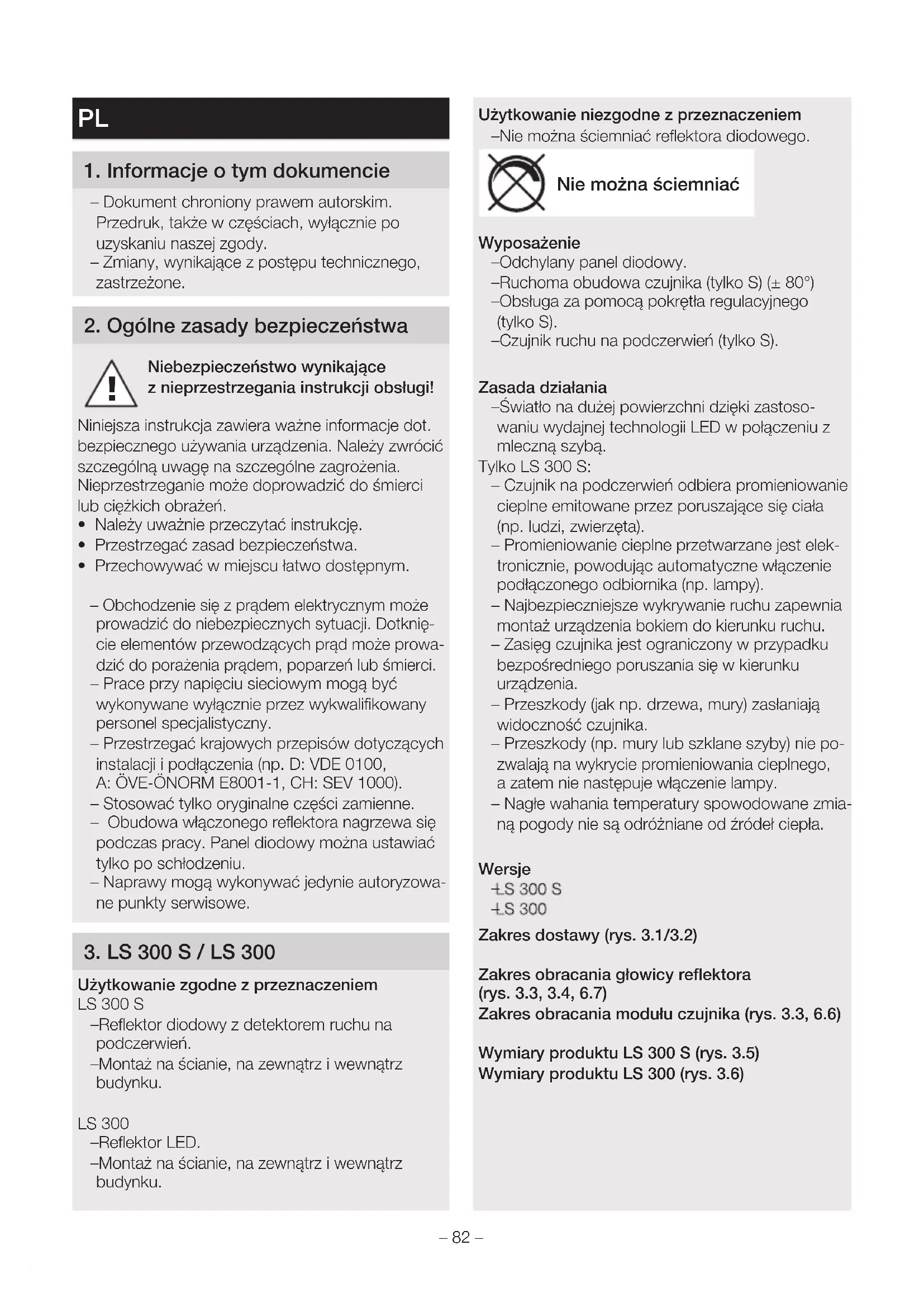 Użytkowanie zgodne zprzeznaczeniem LS300S – Reflektor diodowy z detektorem ruchu na podczerwień. – Montaż na ścianie, na zewnątrz i wewnątrz budynku. LS300 – Reflektor LED. – Montaż na ścianie, na zewnątrz i wewnątrz budynku. Użytkowanie niezgodne z przeznaczeniem – Nie można ściemniać reflektora diodowego. Nie można ściemniać Wyposażenie – Odchylany panel diodowy. – Ruchoma obudowa czujnika (tylko S) (±80°) – Obsługa za pomocą pokrętła regulacyjnego (tylko S). – Czujnik ruchu na podczerwień (tylko S). Zasada działania – Światło na dużej powierzchni dzięki zastoso- waniu wydajnej technologii LED w połączeniu z mleczną szybą. Tylko LS 300 S: – Czujnik na podczerwień odbiera promieniowanie cieplne emitowane przez poruszające się ciała (np. ludzi, zwierzęta). – Promieniowanie cieplne przetwarzane jest elek- tronicznie, powodując automatyczne włączenie podłączonego odbiornika (np. lampy). – Najbezpieczniejsze wykrywanie ruchu zapewnia montaż urządzenia bokiem do kierunku ruchu. – Zasięg czujnika jest ograniczony w przypadku bezpośredniego poruszania się w kierunku urządzenia. – Przeszkody (jak np. drzewa, mury) zasłaniają widoczność czujnika. – Przeszkody (np. mury lub szklane szyby) nie po- zwalają na wykrycie promieniowania cieplnego, azatem nie następuje włączenie lampy. – Nagłe wahania temperatury spowodowane zmia- ną pogody nie są odróżniane od źródeł ciepła. Wersje