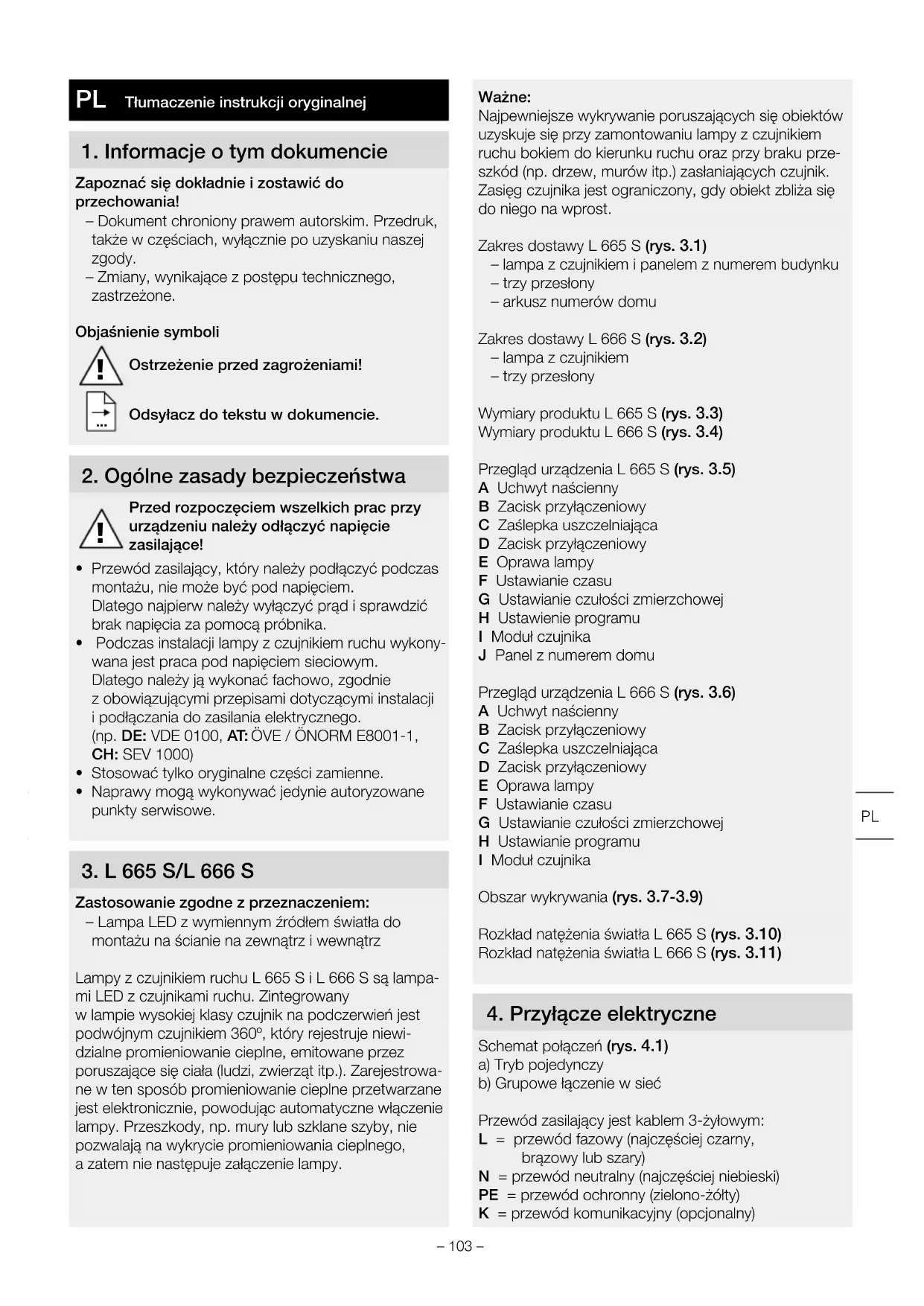 Zastosowanie zgodne zprzeznaczeniem: – Lampa LED zwymiennym źródłem światła do montażu na ścianie na zewnątrz iwewnątrz Lampy z czujnikiem ruchu L 665 S i L 666 S są lampa- mi LED z czujnikami ruchu. Zintegrowany w lampie wysokiej klasy czujnik na podczerwień jest podwójnym czujnikiem 360º, który rejestruje niewi- dzialne promieniowanie cieplne, emitowane przez poruszające się ciała (ludzi, zwierząt itp.). Zarejestrowa- ne wten sposób promieniowanie cieplne przetwarzane jest elektronicznie, powodując automatyczne włączenie lampy. Przeszkody, np. mury lub szklane szyby, nie pozwalają na wykrycie promieniowania cieplnego, azatem nie następuje załączenie lampy. Ważne: Najpewniejsze wykrywanie poruszających się obiektów uzyskuje się przy zamontowaniu lampy z czujnikiem ruchu bokiem do kierunku ruchu oraz przy braku prze- szkód (np. drzew, murów itp.) zasłaniających czujnik. Zasięg czujnika jest ograniczony, gdy obiekt zbliża się do niego na wprost. Zakres dostawy L 665 S (rys. 3.1) – lampa z czujnikiem i panelem z numerem budynku – trzy przesłony – arkusz numerów domu Zakres dostawy L 666 S (rys. 3.2) – lampa z czujnikiem – trzy przesłony Wymiary produktu L 665 S (rys. 3.3) Wymiary produktu L 666 S (rys. 3.4) Przegląd urządzenia L 665 S (rys. 3.5) A Uchwyt naścienny B Zacisk przyłączeniowy C Zaślepka uszczelniająca D Zacisk przyłączeniowy E Oprawa lampy F Ustawianie czasu G Ustawianie czułości zmierzchowej H Ustawienie programu I Moduł czujnika J Panel z numerem domu Przegląd urządzenia L 666 S (rys. 3.6) A Uchwyt naścienny B Zacisk przyłączeniowy C Zaślepka uszczelniająca D Zacisk przyłączeniowy E Oprawa lampy F Ustawianie czasu G Ustawianie czułości zmierzchowej H Ustawianie programu I Moduł czujnika Obszar wykrywania (rys. 3.7-3.9) Rozkład natężenia światła L665S (rys. 3.10) Rozkład natężenia światła L666S (rys. 3.11)
