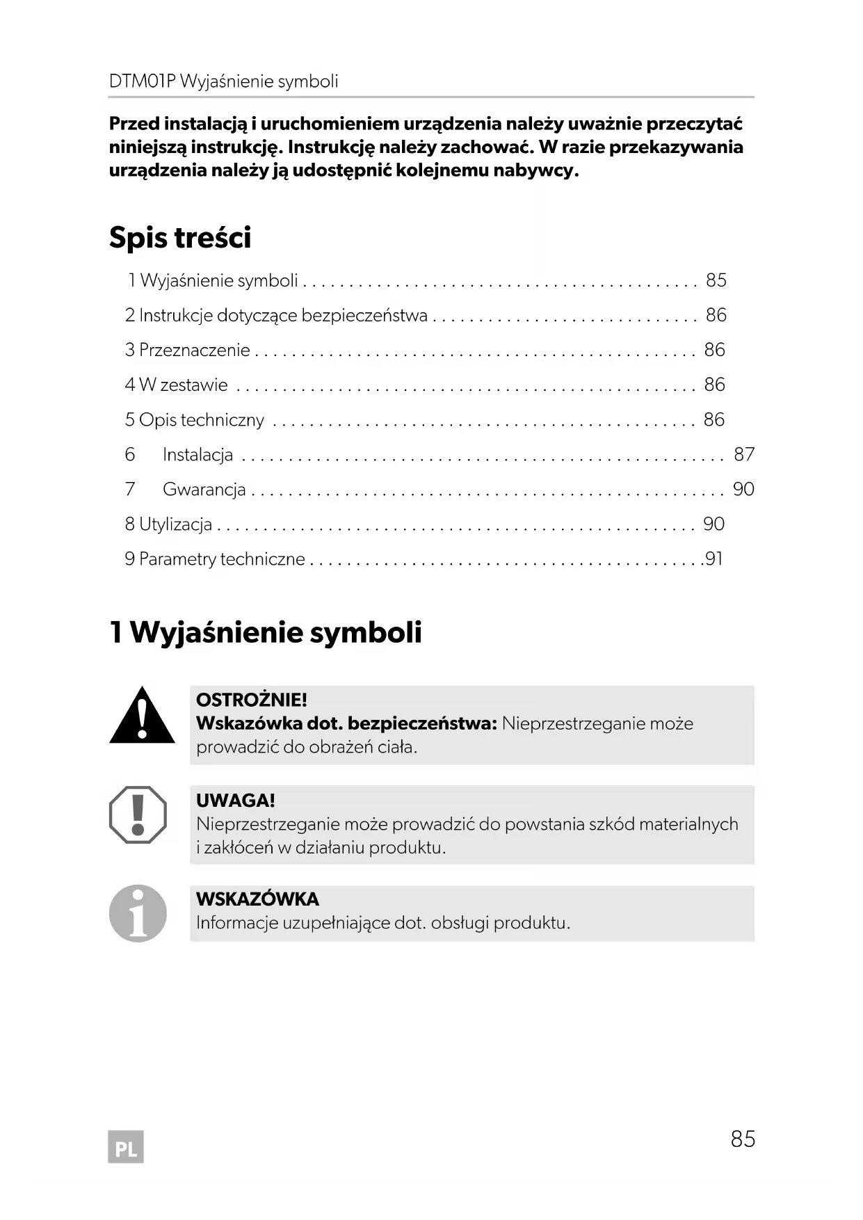 - Przed instalacją i uruchomieniem urządzenia należy uważnie przeczytać niniejszą instrukcję. Instrukcję należy zachować. W razie przekazywania urządzenia należy ją udostępnić kolejnemu nabywcy. Spis treści 1 Wyjaśnienie symboli p. 85