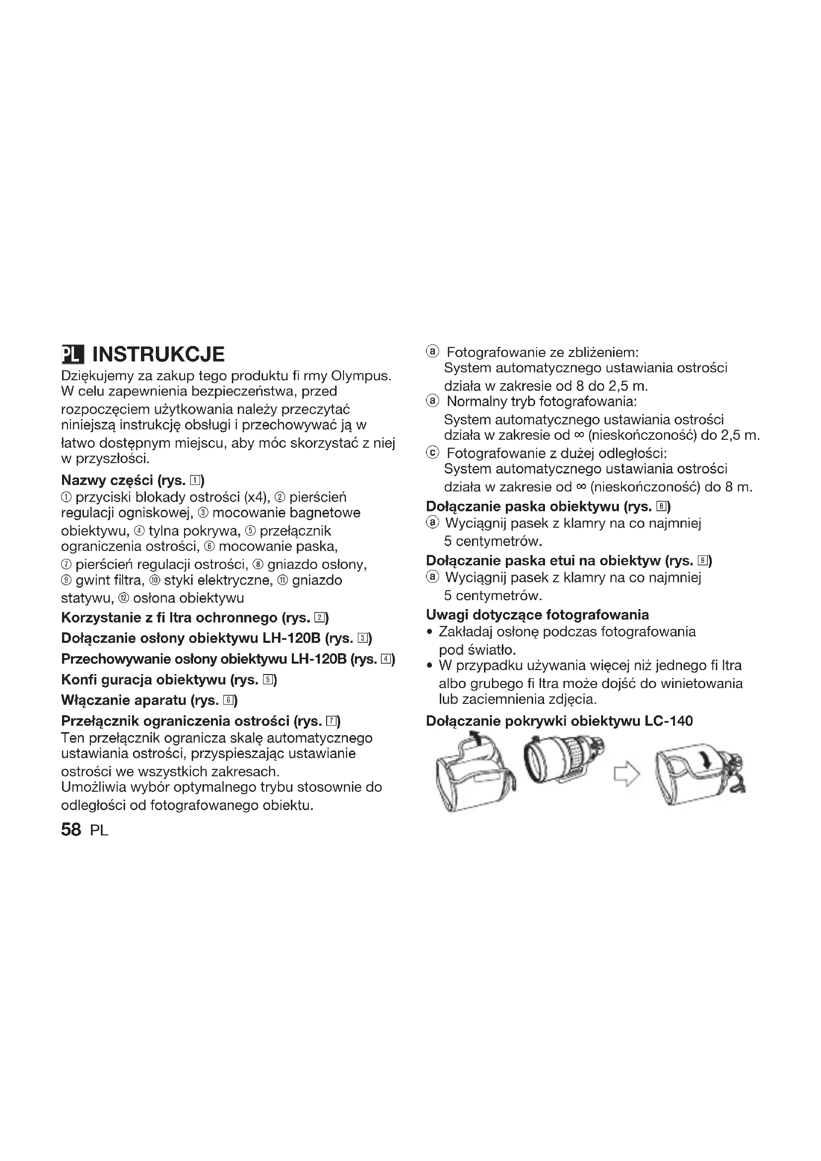 - 58 PL INSTRUKCJE Dziękujemy za zakup tego produktu fi rmy Olympus. W celu zapewnienia bezpieczeństwa, przed rozpoczęciem użytkowania należy przeczytać niniejszą instrukcję obsługi i przechowywać ją w łatwo dostępnym miejscu, aby móc skorzystać z niej w przyszłości. Nazwy części (rys. 1) 1 przyciski blokady ostrości (x4), 2 pierścień regulacji ogniskowej, 3 mocowanie bagnetowe obiektywu, 4 tylna pokrywa, 5 przełącznik ograniczenia ostrości, 6 mocowanie paska, 7 pierścień regulacji ostrości, 8 gniazdo osłony, 9 gwint fi ltra, 0 styki elektryczne, q gniazdo statywu, w osłona obiektywu Korzystanie z fi ltra ochronnego (rys. 2) Dołączanie osłony obiektywu LH-120B (rys. 3) Przechowywanie osłony obiektywu LH-120B (rys. 4) Konfi guracja obiektywu (rys. 5) Włączanie aparatu (rys. 6) Przełącznik ograniczenia ostrości (rys. 7) Ten przełącznik ogranicza skalę automatycznego ustawiania ostrości, przyspieszając ustawianie ostrości we wszystkich zakresach. Umożliwia wybór optymalnego trybu stosownie do odległości od fotografowanego obiektu.