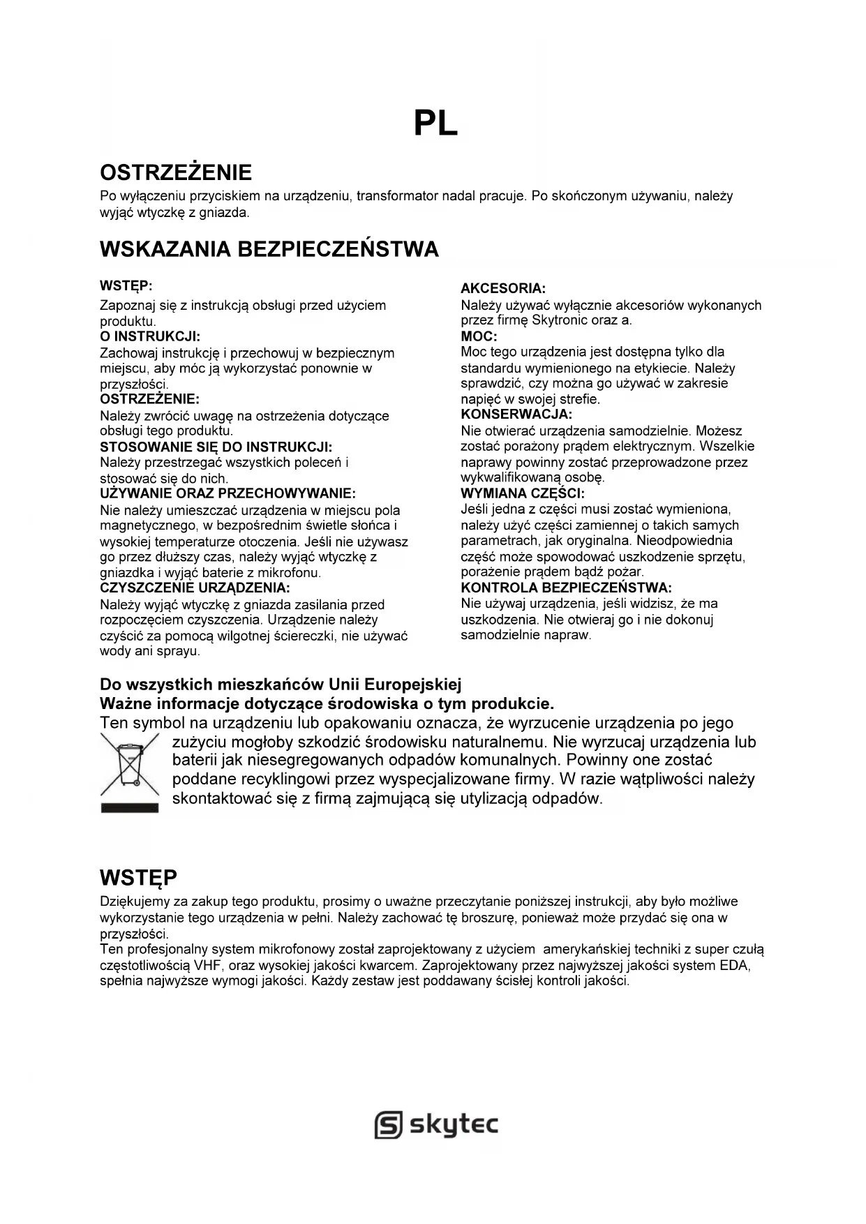 WSTĘP: Zapoznaj się z instrukcją obsługi przed użyciem produktu. O INSTRUKCJI: Zachowaj instrukcję i przechowuj w bezpiecznym miejscu, aby móc ją wykorzystać ponownie w przyszłości. OSTRZEŻENIE: Należy zwrócić uwagę na ostrzeżenia dotyczące obsługi tego produktu. STOSOWANIE SIĘ DO INSTRUKCJI: Należy przestrzegać wszystkich poleceń i stosować się do nich. UŻYWANIE ORAZ PRZECHOWYWANIE: Nie należy umieszczać urządzenia w miejscu pola magnetycznego, w bezpośrednim świetle słońca i wysokiej temperaturze otoczenia. Jeśli nie używasz go przez dłuższy czas, należy wyjąć wtyczkę z gniazdka i wyjąć baterie z mikrofonu. CZYSZCZENIE URZĄDZENIA: Należy wyjąć wtyczkę z gniazda zasilania przed rozpoczęciem czyszczenia. Urządzenie należy czyścić za pomocą wilgotnej ściereczki, nie używać wody ani sprayu. AKCESORIA: Należy używać wyłącznie akcesoriów wykonanych przez firmę Skytronic oraz a. MOC: Moc tego urządzenia jest dostępna tylko dla standardu wymienionego na etykiecie. Należy sprawdzić, czy można go używać w zakresie napięć w swojej strefie. KONSERWACJA: Nie otwierać urządzenia samodzielnie. Możesz zostać porażony prądem elektrycznym. Wszelkie naprawy powinny zostać przeprowadzone przez wykwalifikowaną osobę. WYMIANA CZĘŚCI: Jeśli jedna z części musi zostać wymieniona, należy użyć części zamiennej o takich samych parametrach, jak oryginalna. Nieodpowiednia część może spowodować uszkodzenie sprzętu, porażenie prądem bądź pożar. KONTROLA BEZPIECZEŃSTWA: Nie używaj urządzenia, jeśli widzisz, że ma uszkodzenia. Nie otwieraj go i nie dokonuj samodzielnie napraw.
