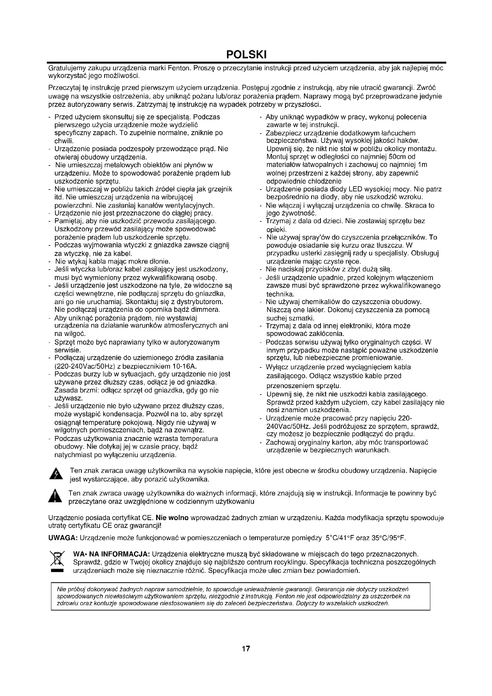 Affiche le signal de sortie NOTE: le segment “0“ correspond au niveau de sortie nominal. Le témoin Peak brille en rouge lorsque le niveau de la sortie atteint le niveau d'écrêtage.17 POLSKI Gratulujemy zakupu urządzenia marki Fenton. Proszę o przeczytanie instrukcji przed użyciem urządzenia, aby jak najlepiej móc wykorzystać jego możliwości. Przeczytaj tę instrukcję przed pierwszym użyciem urządzenia. Postępuj zgodnie z instrukcją, aby nie utracić gwarancji. Zwróć uwagę na wszystkie ostrzeżenia, aby uniknąć pożaru lub/oraz porażenia prądem. Naprawy mogą być przeprowadzane jedynie przez autoryzowany serwis. Zatrzymaj tę instrukcję na wypadek potrzeby w przyszłości. - Przed użyciem skonsultuj się ze specjalistą. Podczas pierwszego użycia urządzenie może wydzielić specyficzny zapach. To zupełnie normalne, zniknie po chwili. - Urządzenie posiada podzespoły przewodzące prąd. Nie otwieraj obudowy urządzenia. - Nie umieszczaj metalowych obiektów ani płynów w urządzeniu. Może to spowodować porażenie prądem lub uszkodzenie sprzętu. - Nie umieszczaj w pobliżu takich źródeł ciepła jak grzejnik itd. Nie umieszczaj urządzenia na wibrującej powierzchni. Nie zasłaniaj kanałów wentylacyjnych. - Urządzenie nie jest przeznaczone do ciągłej pracy. - Pamiętaj, aby nie uszkodzić przewodu zasilającego. Uszkodzony przewód zasilający może spowodować porażenie prądem lub uszkodzenie sprzętu. - Podczas wyjmowania wtyczki z gniazdka zawsze ciągnij za wtyczkę, nie za kabel. - Nie wtykaj kabla mając mokre dłonie. - Jeśli wtyczka lub/oraz kabel zasilający jest uszkodzony, musi być wymieniony przez wykwalifikowaną osobę. - Jeśli urządzenie jest uszkodzone na tyle, że widoczne są części wewnętrzne, nie podłączaj sprzętu do gniazdka, ani go nie uruchamiaj. Skontaktuj się z dystrybutorem. Nie podłączaj urządzenia do opornika bądź dimmera. - Aby uniknąć porażenia prądem, nie wystawiaj urządzenia na działanie warunków atmosferycznych ani na wilgoć. - Sprzęt może być naprawiany tylko w autoryzowanym serwisie. - Podłączaj urządzenie do uziemionego źródła zasilania (220-240Vac/50Hz) z bezpiecznikiem 10-16A. - Podczas burzy lub w sytuacjach, gdy urządzenie nie jest używane przez dłuższy czas, odłącz je od gniazdka. Zasada brzmi: odłącz sprzęt od gniazdka, gdy go nie używasz. - Jeśli urządzenie nie było używane przez dłuższy czas, może wystąpić kondensacja. Pozwól na to, aby sprzęt osiągnął temperaturę pokojową. Nigdy nie używaj w wilgotnych pomieszczeniach, bądź na zewnątrz. - Podczas użytkowania znacznie wzrasta temperatura obudowy. Nie dotykaj jej w czasie pracy, bądź natychmiast po wyłączeniu urządzenia. - Aby uniknąć wypadków w pracy, wykonuj polecenia zawarte w tej instrukcji. - Zabezpiecz urządzenie dodatkowym łańcuchem bezpieczeństwa. Używaj wysokiej jakości haków. Upewnij się, że nikt nie stoi w pobliżu okolicy montażu. Montuj sprzęt w odległości co najmniej 50cm od materiałów łatwopalnych i zachowuj co najmniej 1m wolnej przestrzeni z każdej strony, aby zapewnić odpowiednie chłodzenie - Urządzenie posiada diody LED wysokiej mocy. Nie patrz bezpośrednio na diody, aby nie uszkodzić wzroku. - Nie włączaj i wyłączaj urządzenia co chwilę. Skraca to jego żywotność. - Trzymaj z dala od dzieci. Nie zostawiaj sprzętu bez opieki. - Nie używaj spray’ów do czyszczenia przełączników. To powoduje osiadanie się kurzu oraz tłuszczu. W przypadku usterki zasięgnij rady u specjalisty. Obsługuj urządzenie mając czyste ręce. - Nie naciskaj przycisków z zbyt dużą siłą. - Jeśli urządzenie upadnie, przed kolejnym włączeniem zawsze musi być sprawdzone przez wykwalifikowanego technika. - Nie używaj chemikaliów do czyszczenia obudowy. Niszczą one lakier. Dokonuj czyszczenia za pomocą suchej szmatki. - Trzymaj z dala od innej elektroniki, która może spowodować zakłócenia. - Podczas serwisu używaj tylko oryginalnych części. W innym przypadku może nastąpić poważne uszkodzenie sprzętu, lub niebezpieczne promieniowanie. - Wyłącz urządzenie przed wyciągnięciem kabla zasilającego. Odłącz wszystkie kable przed przenoszeniem sprzętu. - Upewnij się, że nikt nie uszkodzi kabla zasilającego. Sprawdź przed każdym użyciem, czy kabel zasilający nie nosi znamion uszkodzenia. - Urządzenie może pracować przy napięciu 220- 240Vac/50Hz. Jeśli podróżujesz ze sprzętem, sprawdź, czy możesz je bezpiecznie podłączyć do prądu. - Zachowaj oryginalny karton, aby móc transportować urządzenie w bezpiecznych warunkach. Ten znak zwraca uwagę użytkownika na wysokie napięcie, które jest obecne w środku obudowy urządzenia. Napięcie jest wystarczające, aby porazić użytkownika. Ten znak zwraca uwagę użytkownika do ważnych informacji, które znajdują się w instrukcji. Informacje te powinny być przeczytane oraz uwzględnione w codziennym użytkowaniu Urządzenie posiada certyfikat CE. Nie wolno wprowadzać żadnych zmian w urządzeniu. Każda modyfikacja sprzętu spowoduje utratę certyfikatu CE oraz gwarancji! UWAGA: Urządzenie może funkcjonować w pomieszczeniach o temperaturze pomiędzy 5°C/41°F oraz 35°C/95°F. WA• NA INFORMACJA: Urządzenia elektryczne muszą być składowane w miejscach do tego przeznaczonych. Sprawdź, gdzie w Twojej okolicy znajduje się najbliższe centrum recyklingu. Specyfikacja techniczna poszczególnych urządzeniach może się nieznacznie różnić. Specyfikacja może ulec zmian bez powiadomień.