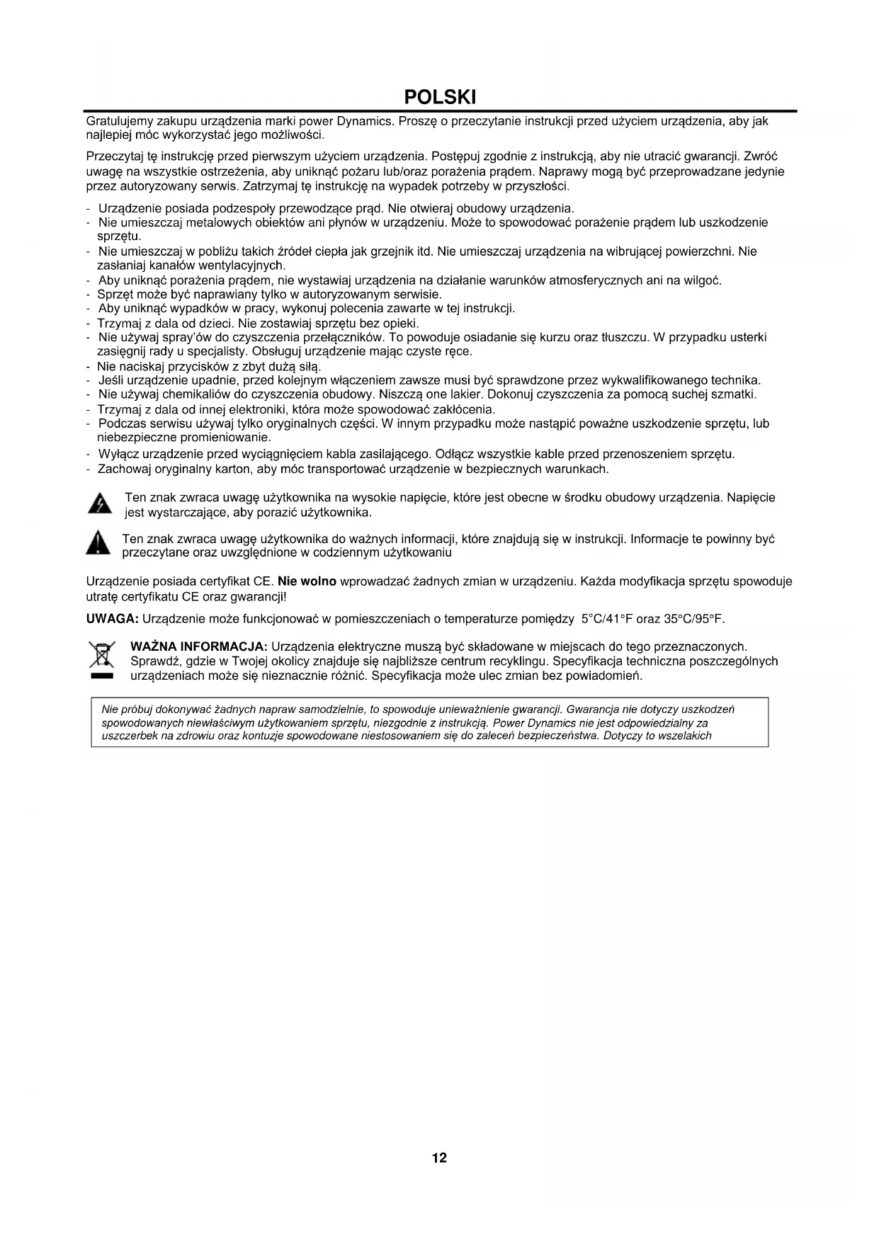 POLSKI Gratulujemy zakupu urządzenia marki power Dynamics. Proszę o przeczytanie instrukcji przed użyciem urządzenia, aby jak najlepiej móc wykorzystać jego możliwości. Przeczytaj tę instrukcję przed pierwszym użyciem urządzenia. Postępuj zgodnie z instrukcją, aby nie utracić gwarancji. Zwróć uwagę na wszystkie ostrzeżenia, aby uniknąć pożaru lub/oraz porażenia prądem. Naprawy mogą być przeprowadzane jedynie przez autoryzowany serwis. Zatrzymaj tę instrukcję na wypadek potrzeby w przyszłości. - Urządzenie posiada podzespoły przewodzące prąd. Nie otwieraj obudowy urządzenia. - Nie umieszczaj metalowych obiektów ani płynów w urządzeniu. Może to spowodować porażenie prądem lub uszkodzenie sprzętu. - Nie umieszczaj w pobliżu takich źródeł ciepła jak grzejnik itd. Nie umieszczaj urządzenia na wibrującej powierzchni. Nie zasłaniaj kanałów wentylacyjnych. - Aby uniknąć porażenia prądem, nie wystawiaj urządzenia na działanie warunków atmosferycznych ani na wilgoć. - Sprzęt może być naprawiany tylko w autoryzowanym serwisie. - Aby uniknąć wypadków w pracy, wykonuj polecenia zawarte w tej instrukcji. - Trzymaj z dala od dzieci. Nie zostawiaj sprzętu bez opieki. - Nie używaj spray’ów do czyszczenia przełączników. To powoduje osiadanie się kurzu oraz tłuszczu. W przypadku usterki zasięgnij rady u specjalisty. Obsługuj urządzenie mając czyste ręce. - Nie naciskaj przycisków z zbyt dużą siłą. - Jeśli urządzenie upadnie, przed kolejnym włączeniem zawsze musi być sprawdzone przez wykwalifikowanego technika. - Nie używaj chemikaliów do czyszczenia obudowy. Niszczą one lakier. Dokonuj czyszczenia za pomocą suchej szmatki. - Trzymaj z dala od innej elektroniki, która może spowodować zakłócenia. - Podczas serwisu używaj tylko oryginalnych części. W innym przypadku może nastąpić poważne uszkodzenie sprzętu, lub niebezpieczne promieniowanie. - Wyłącz urządzenie przed wyciągnięciem kabla zasilającego. Odłącz wszystkie kable przed przenoszeniem sprzętu. - Zachowaj oryginalny karton, aby móc transportować urządzenie w bezpiecznych warunkach. Ten znak zwraca uwagę użytkownika na wysokie napięcie, które jest obecne w środku obudowy urządzenia. Napięcie jest wystarczające, aby porazić użytkownika. Ten znak zwraca uwagę użytkownika do ważnych informacji, które znajdują się w instrukcji. Informacje te powinny być przeczytane oraz uwzględnione w codziennym użytkowaniu Urządzenie posiada certyfikat CE. Nie wolno wprowadzać żadnych zmian w urządzeniu. Każda modyfikacja sprzętu spowoduje utratę certyfikatu CE oraz gwarancji! UWAGA: Urządzenie może funkcjonować w pomieszczeniach o temperaturze pomiędzy 5°C/41°F oraz 35°C/95°F. WAŻNA INFORMACJA: Urządzenia elektryczne muszą być składowane w miejscach do tego przeznaczonych. Sprawdź, gdzie w Twojej okolicy znajduje się najbliższe centrum recyklingu. Specyfikacja techniczna poszczególnych urządzeniach może się nieznacznie różnić. Specyfikacja może ulec zmian bez powiadomień.