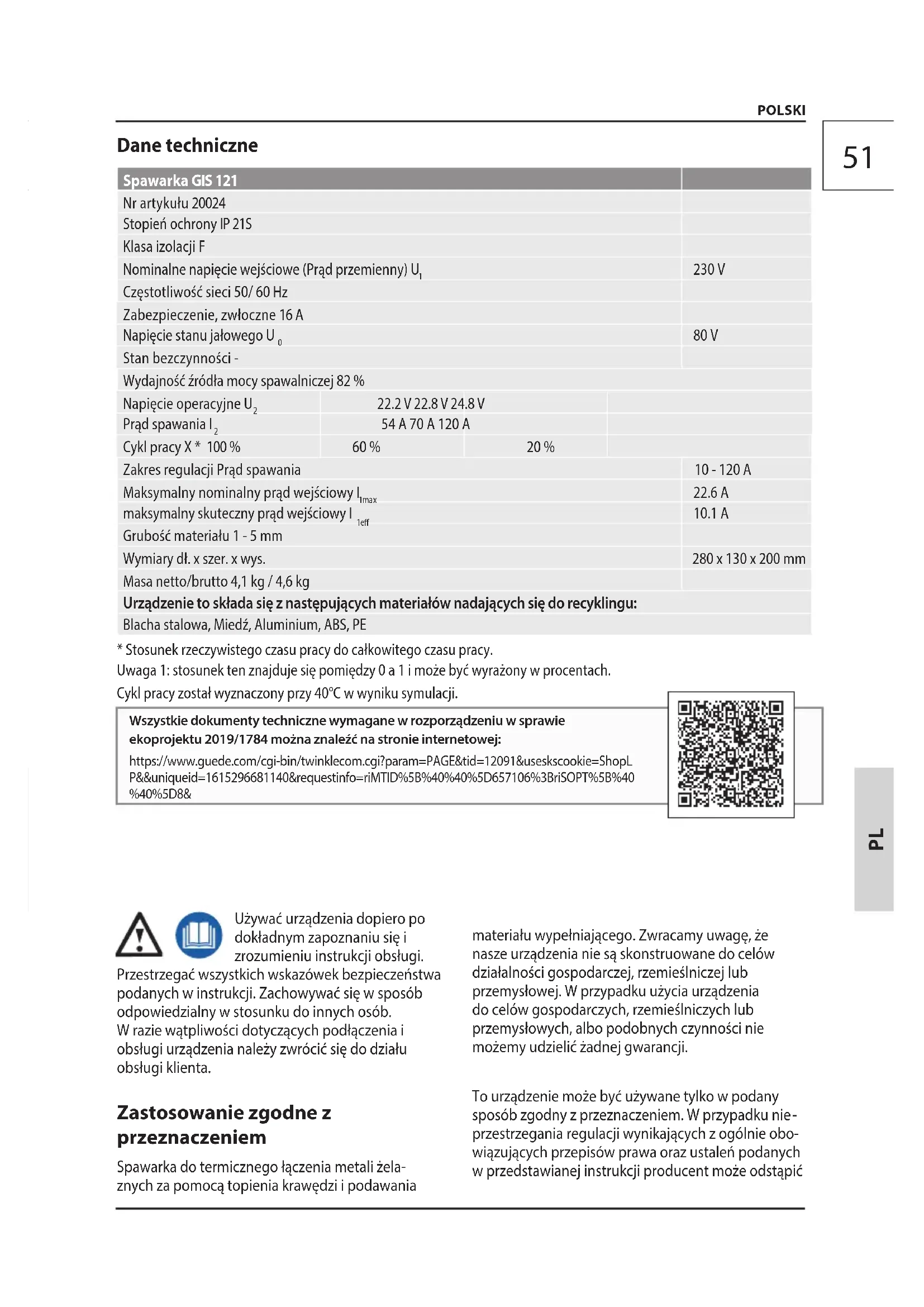 przestrzegania regulacji wynikających z ogólnie obo- wiązujących przepisów prawa oraz ustaleń podanych w przedstawianej instrukcji producent może odstąpić Używać urządzenia dopiero po dokładnym zapoznaniu się i zrozumieniu instrukcji obsługi. Przestrzegać wszystkich wskazówek bezpieczeństwa podanych w instrukcji. Zachowywać się w sposób odpowiedzialny w stosunku do innych osób. W razie wątpliwości dotyczących podłączenia i obsługi urządzenia należy zwrócić się do działu obsługi klienta. Zastosowanie zgodne z przeznaczeniem Spawarka do termicznego łączenia metali żela- znych za pomocą topienia krawędzi i podawania POLSKI Dane techniczne Spawarka GIS 121 Nr artykułu 20024 Stopień ochrony IP 21S Klasa izolacji F Nominalne napięcie wejściowe (Prąd przemienny) U