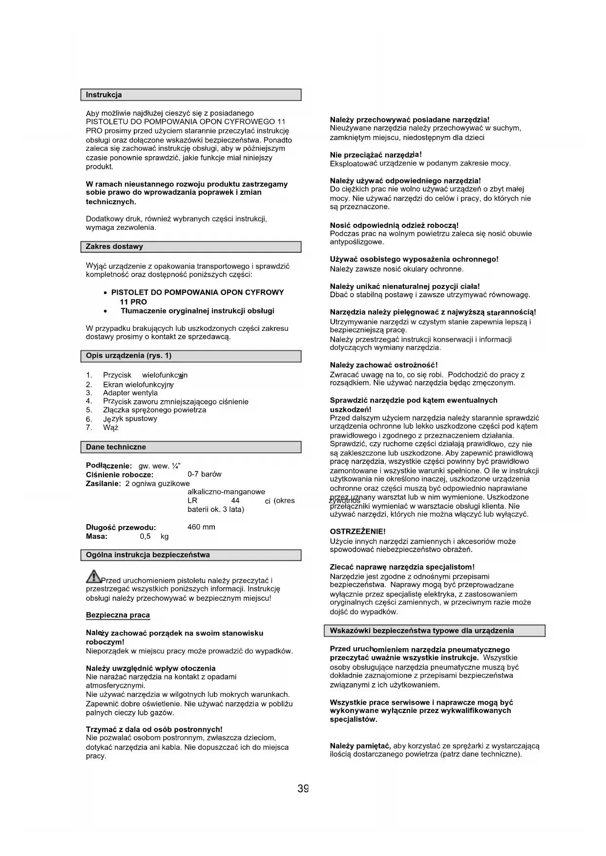 jąü urządzenie z opakowania transportowego i sprawdziü kompletnoĞü oraz dostĊpnoĞü poniĪszych czĊĞci: x PISTOLET DO POMPOWANIA OPON CYFROWY 11 PRO x Táumaczenie oryginalnej instrukcji obsáugi W przypadku brakujących lub uszkodzonych czĊĞci zakresu dostawy prosimy o kontakt ze sprzedawcą. Opis urządzenia (rys. 1)