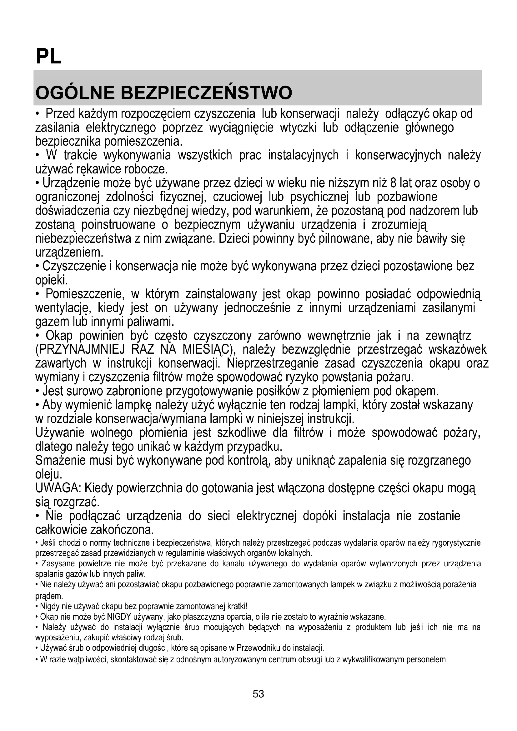 - Okap powinien być często czyszczony zarówno wewnętrznie jak i na zewnątrz (PRZYNAJMNIEJ RAZ NA MIESIĄC), należy bezwzględnie przestrzegać wskazówek zawartych w instrukcji konserwacji. Nieprzestrzeganie zasad czyszczenia okapu oraz wymiany i czyszczenia filtrów może spowodować ryzyko powstania pożaru.