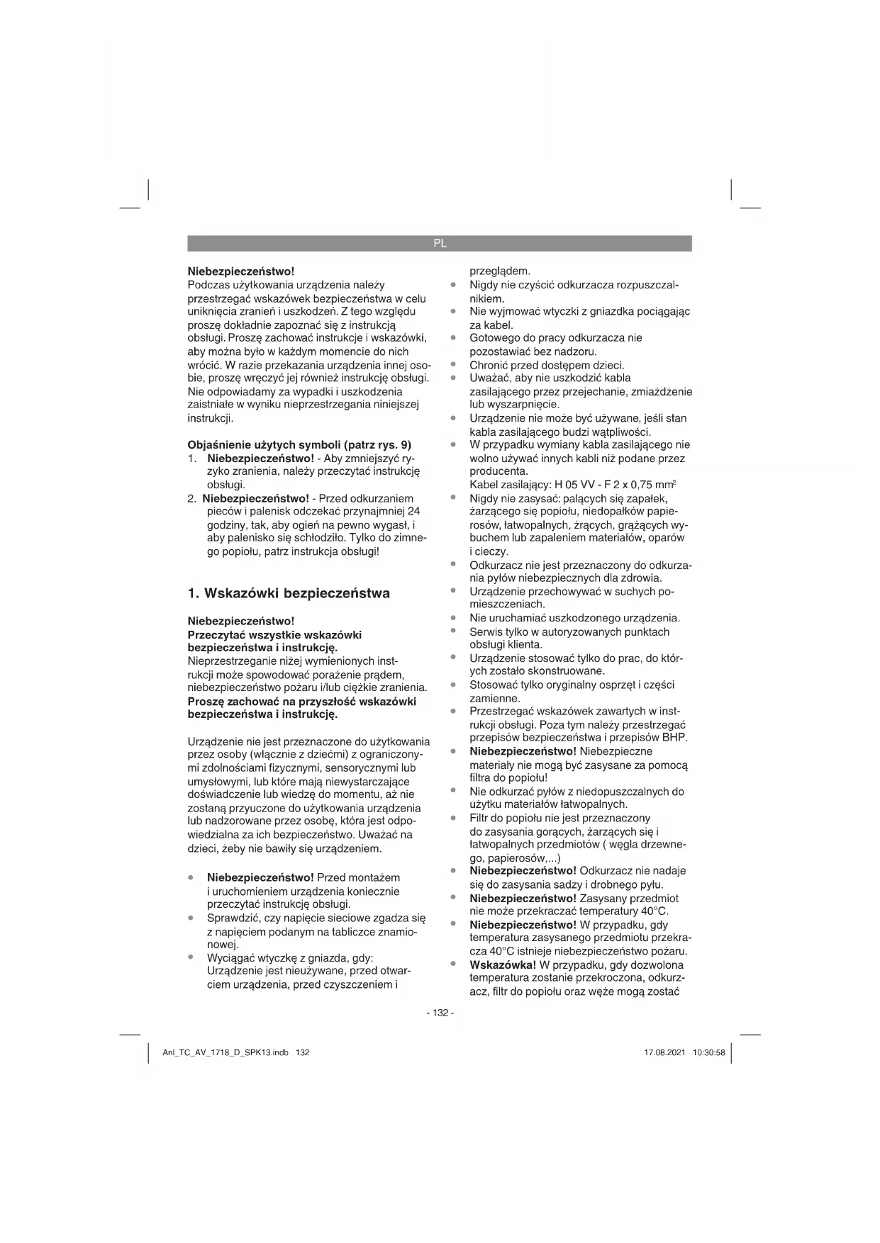Wskazówka! W przypadku, gdy dozwolona temperatura zostanie przekroczona, odkurz- acz, filtr do popiołu oraz węże mogą zostać Anl_TC_AV_1718_D_SPK13.indb 132Anl_TC_AV_1718_D_SPK13.indb 132 17.08.2021 10:30:5817.08.2021 10:30:58PL