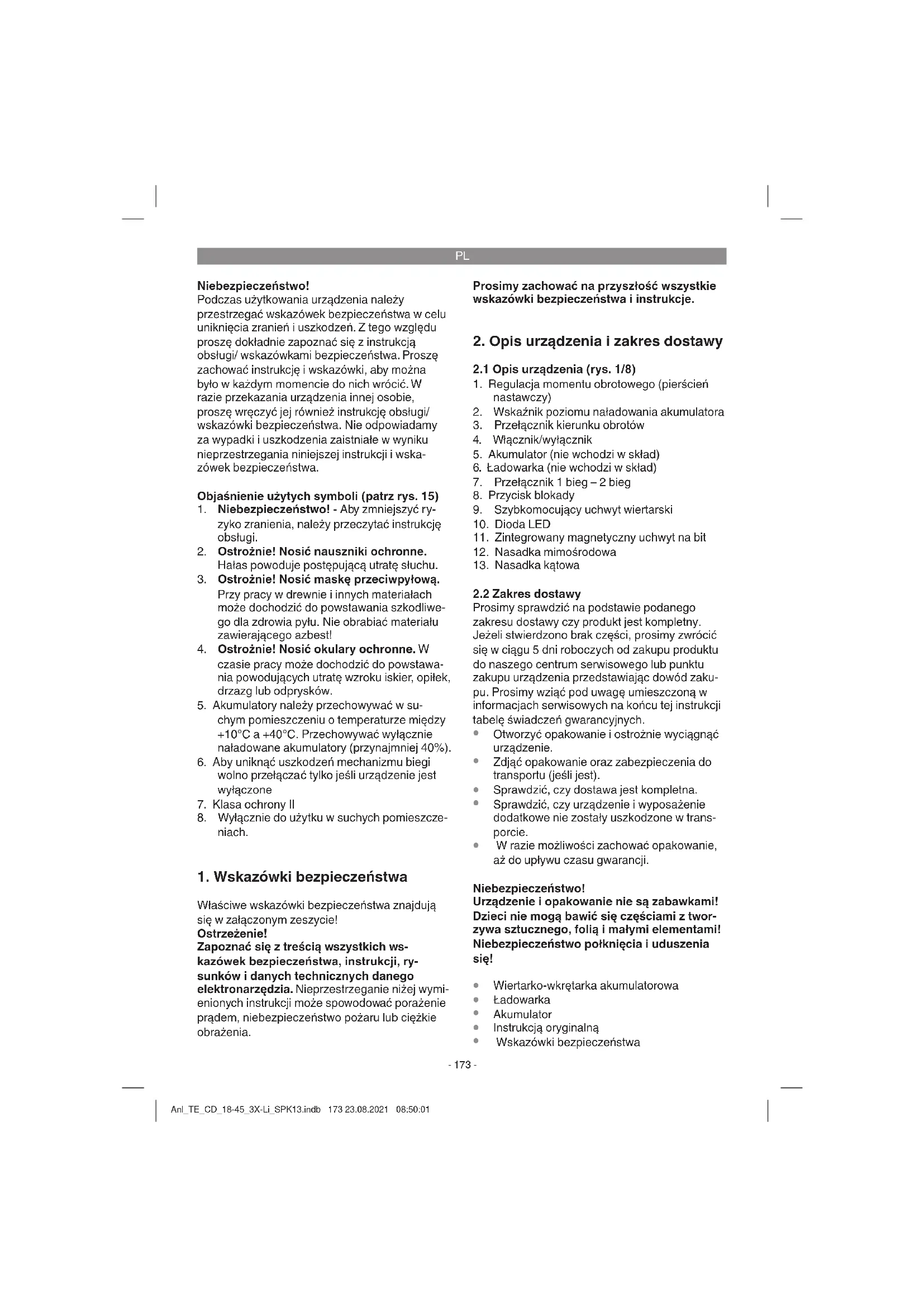 Wskazówki bezpieczeństwa Anl_TE_CD_18-45_3X-Li_SPK13.indb 173 23.08.2021 08:50:01PL