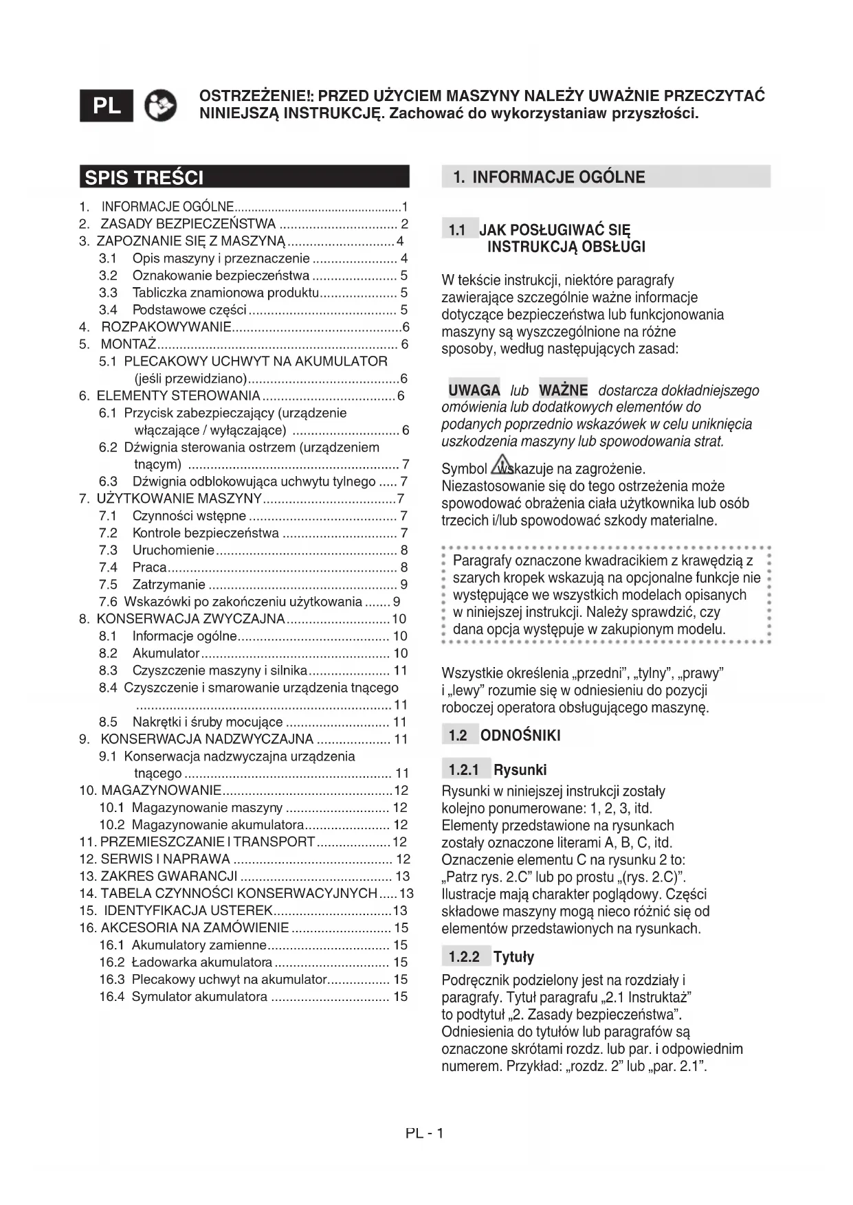 Podręcznik podzielony jest na rozdziały i paragrafy. Tytuł paragrafu „2.1 Instruktaż” to podtytuł „2. Zasady bezpieczeństwa”. Odniesienia do tytułów lub paragrafów są oznaczone skrótami rozdz. lub par. i odpowiednim numerem. Przykład: „rozdz. 2” lub „par. 2.1”.