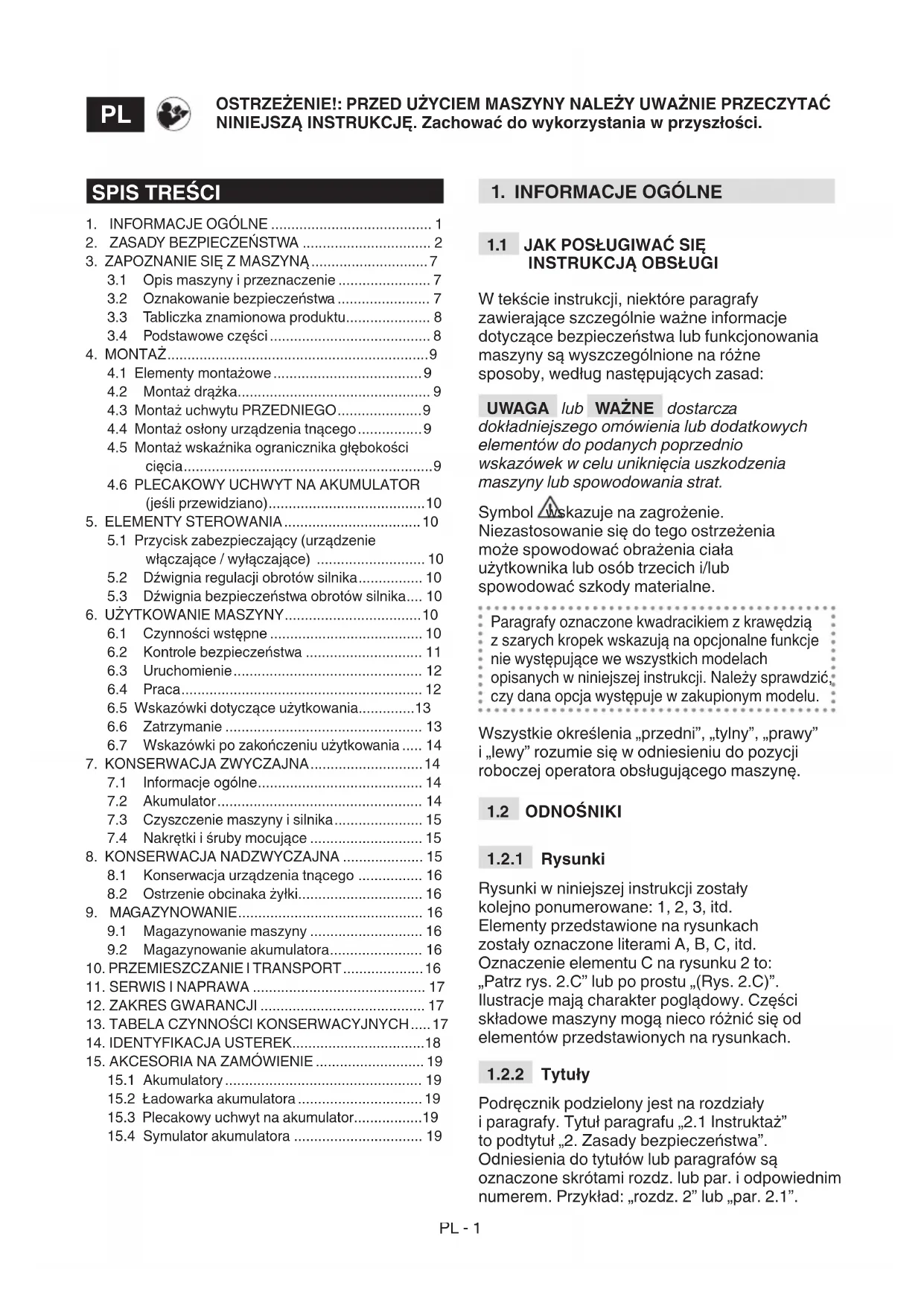 Podręcznik podzielony jest na rozdziały i paragrafy. Tytuł paragrafu „2.1 Instruktaż” to podtytuł „2. Zasady bezpieczeństwa”. Odniesienia do tytułów lub paragrafów są oznaczone skrótami rozdz. lub par. i odpowiednim numerem. Przykład: „rozdz. 2” lub „par. 2.1”.