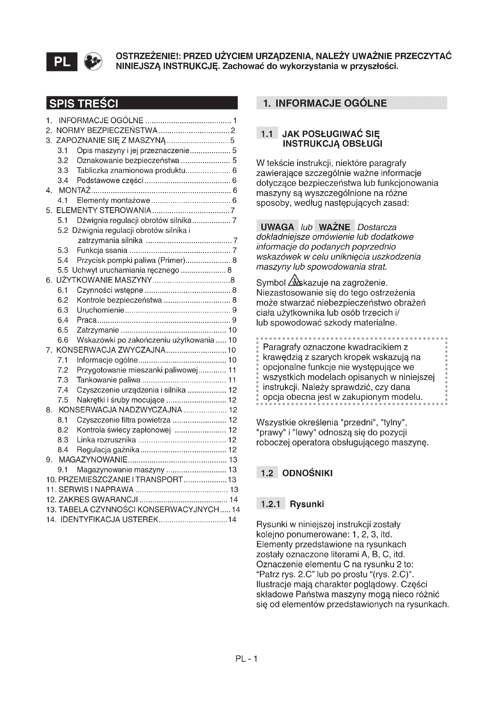Niniejsza instrukcja zawiera wszelkie informacje niezbędne do posługiwania się maszyną i poprawnego wykonania podstawowych czynności z zakresu konserwacji dokonywanych przez samego użytkownika. Wszystkie czynności regulacyjne i konserwacyjne nieopisane w niniejszej instrukcji powinny być wykonane przez Państwa sprzedawcę lub w autoryzowanym punkcie serwisowym, który dysponuje wiedzą i sprzętem umożliwiającym właściwe wykonanie czynności konserwacyjnych przy zapewnieniu odpowiedniego stopnia bezpieczeństwa urządzenia. Czynności wykonane przez nieprzystosowane do tego serwisy lub osoby niekompetentne powodują utratę udzielonych gwarancji oraz zwalniają producenta z jakichkolwiek zobowiązań i z odpowiedzialności prawnej.