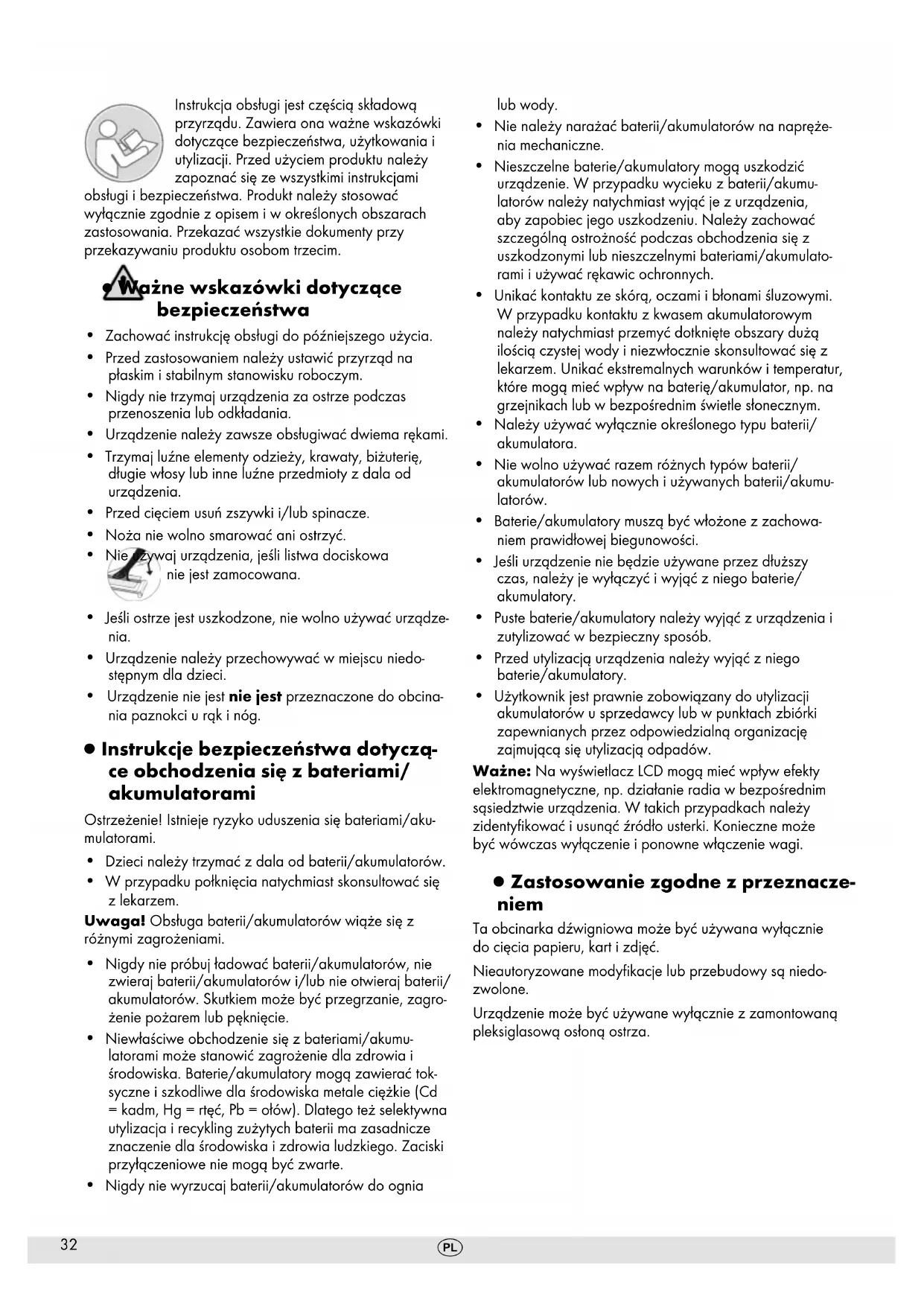 - Użytkownik jest prawnie zobowiązany do utylizacji akumulatorów u sprzedawcy lub w punktach zbiórki zapewnianych przez odpowiedzialną organizację zajmującą się utylizacją odpadów. Ważne: Na wyświetlacz LCD mogą mieć wpływ efekty elektromagnetyczne, np. działanie radia w bezpośrednim sąsiedztwie urządzenia. W takich przypadkach należy zidentykować i usunąć źródło usterki. Konieczne może być wówczas wyłączenie i ponowne włączenie wagi. ▯ Zastosowanie zgodne z przeznacze- niem Ta obcinarka dźwigniowa może być używana wyłącznie do cięcia papieru, kart i zdjęć. Nieautoryzowane modykacje lub przebudowy są niedo- zwolone. Urządzenie może być używane wyłącznie z zamontowaną pleksiglasową osłoną ostrza.33