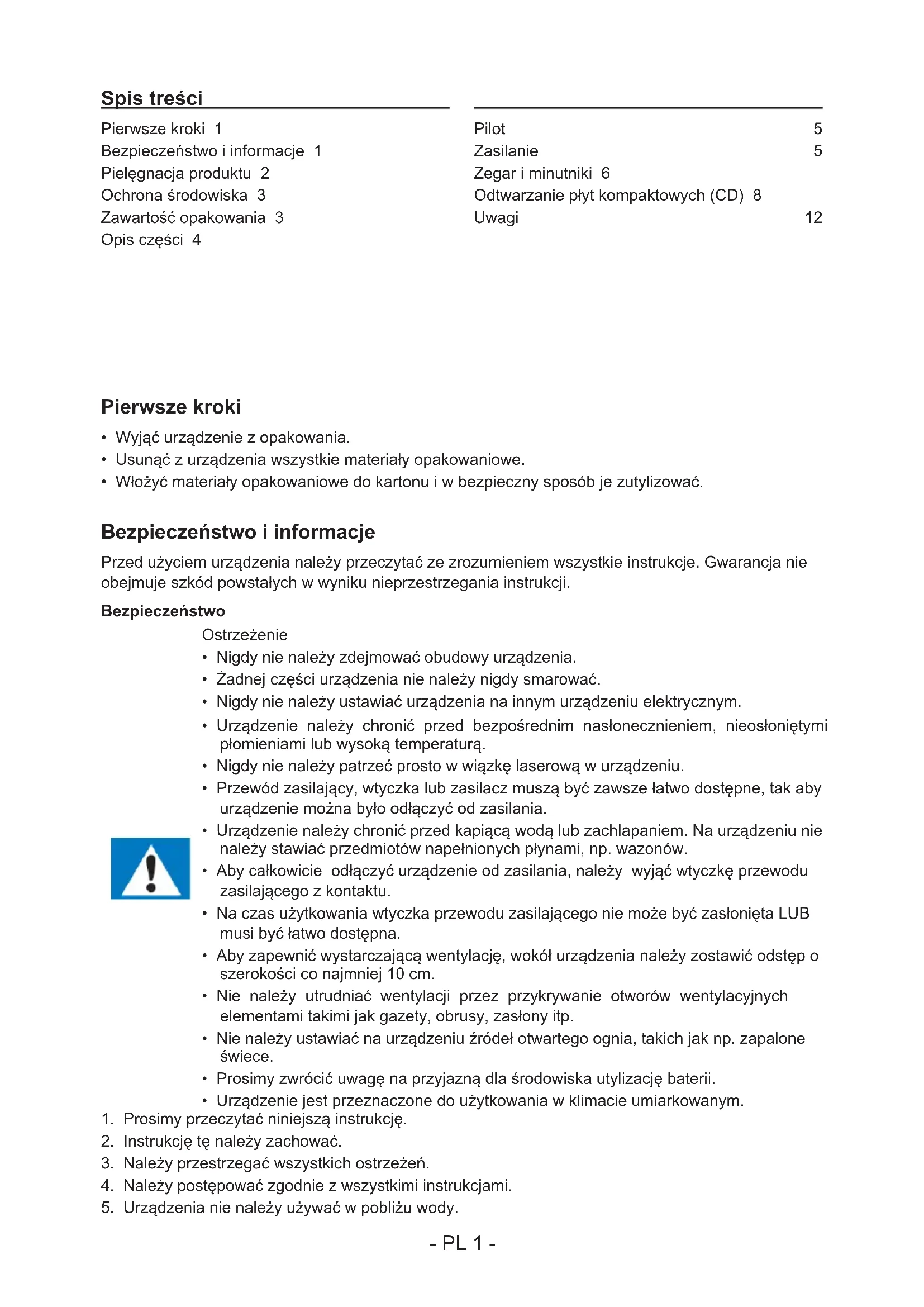 Pierwsze kroki 1 Bezpieczeństwo i informacje 1 Pielęgnacja produktu 2 Ochrona środowiska 3 Zawartość opakowania 3 Opis części 4 Pilot 5 Zasilanie 5 Zegar i minutniki 6 Odtwarzanie płyt kompaktowych (CD) 8 Uwagi: 12