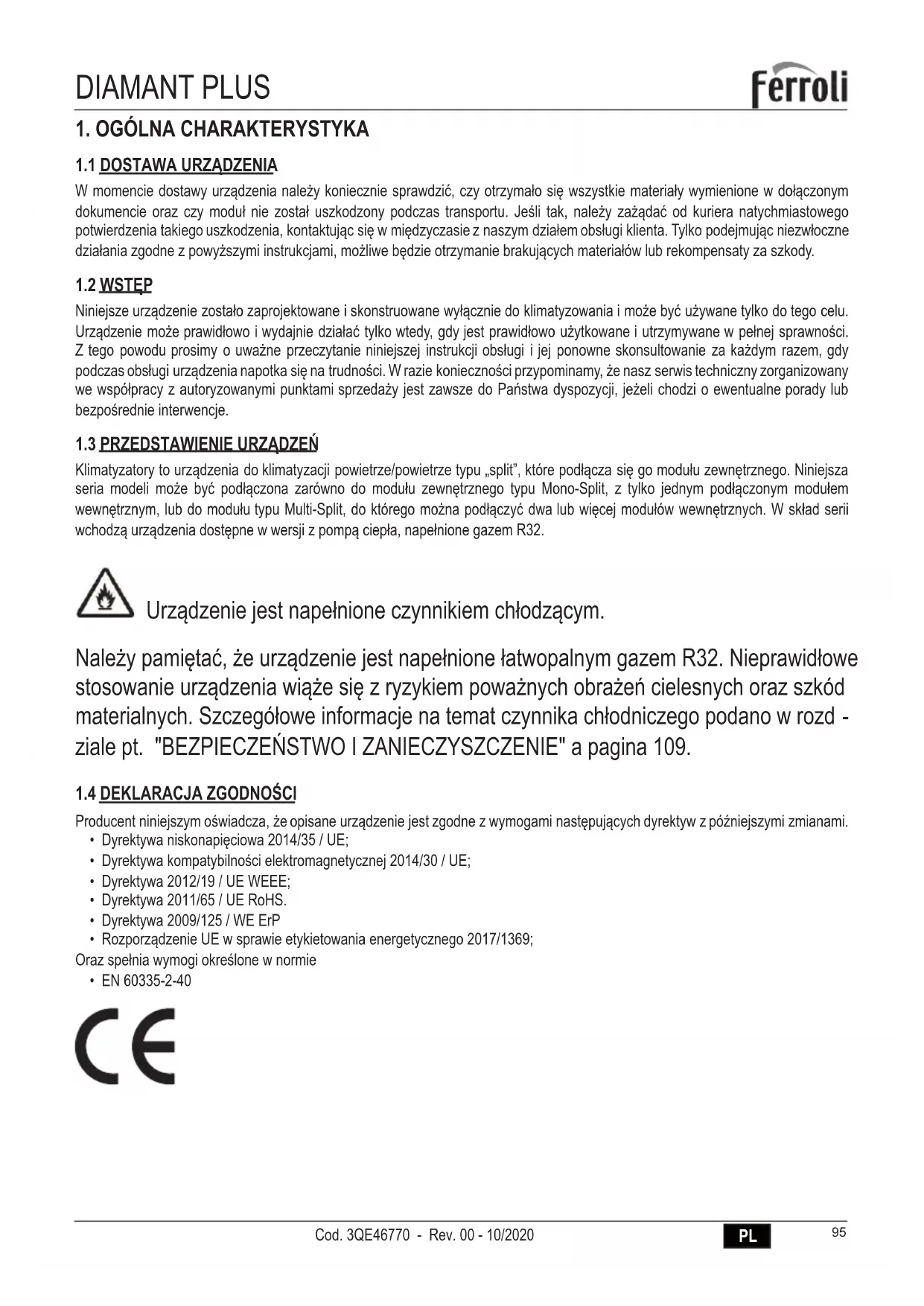 - Dyrektywa niskonapięciowa 2014/35 / UE;• Dyrektywa kompatybilności elektromagnetycznej 2014/30 / UE;• Dyrektywa 2012/19 / UE WEEE;• Dyrektywa 2011/65 / UE RoHS.• Dyrektywa 2009/125 / WE ErP• Rozporządzenie UE w sprawie etykietowania energetycznego 2017/1369;Oraz spełnia wymogi określone w normie• EN 60335-2-40PL Cod. 3QE46770 - Rev. 00 - 10/2020 DIAMANT PLUS
