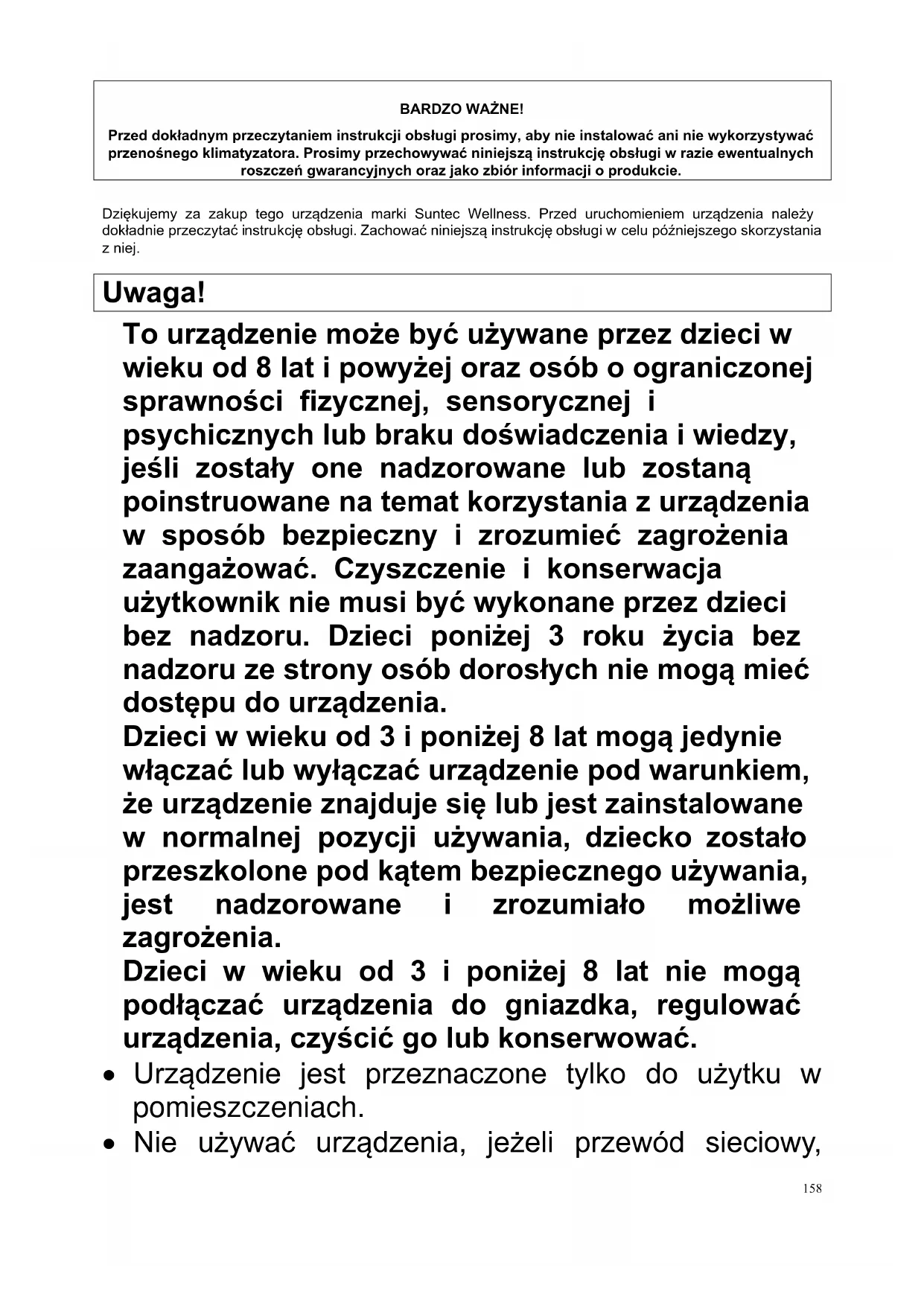 BARDZO WAŻNE! Przed dokładnym przeczytaniem instrukcji obsługi prosimy, aby nie instalować ani nie wykorzystywać przenośnego klimatyzatora. Prosimy przechowywać niniejszą instrukcję obsługi w razie ewentualnych roszczeń gwarancyjnych oraz jako zbiór informacji o produkcie. Dziękujemy za zakup tego urządzenia marki Suntec Wellness. Przed uruchomieniem urządzenia należy dokładnie przeczytać instrukcję obsługi. Zachować niniejszą instrukcję obsługi w celu późniejszego skorzystania z niej. Uwaga! To urządzenie może być używane przez dzieci w wieku od 8 lat i powyżej oraz osób o ograniczonej sprawności fizycznej, sensorycznej i psychicznych lub braku doświadczenia i wiedzy, jeśli zostały one nadzorowane lub zostaną poinstruowane na temat korzystania z urządzenia w sposób bezpieczny i zrozumieć zagrożenia zaangażować. Czyszczenie i konserwacja użytkownik nie musi być wykonane przez dzieci bez nadzoru. Dzieci poniżej 3 roku życia bez nadzoru ze strony osób dorosłych nie mogą mieć dostępu do urządzenia. Dzieci w wieku od 3 i poniżej 8 lat mogą jedynie włączać lub wyłączać urządzenie pod warunkiem, że urządzenie znajduje się lub jest zainstalowane w normalnej pozycji używania, dziecko zostało przeszkolone pod kątem bezpiecznego używania, jest nadzorowane i zrozumiało możliwe zagrożenia. Dzieci w wieku od 3 i poniżej 8 lat nie mogą podłączać urządzenia do gniazdka, regulować urządzenia, czyścić go lub konserwować.