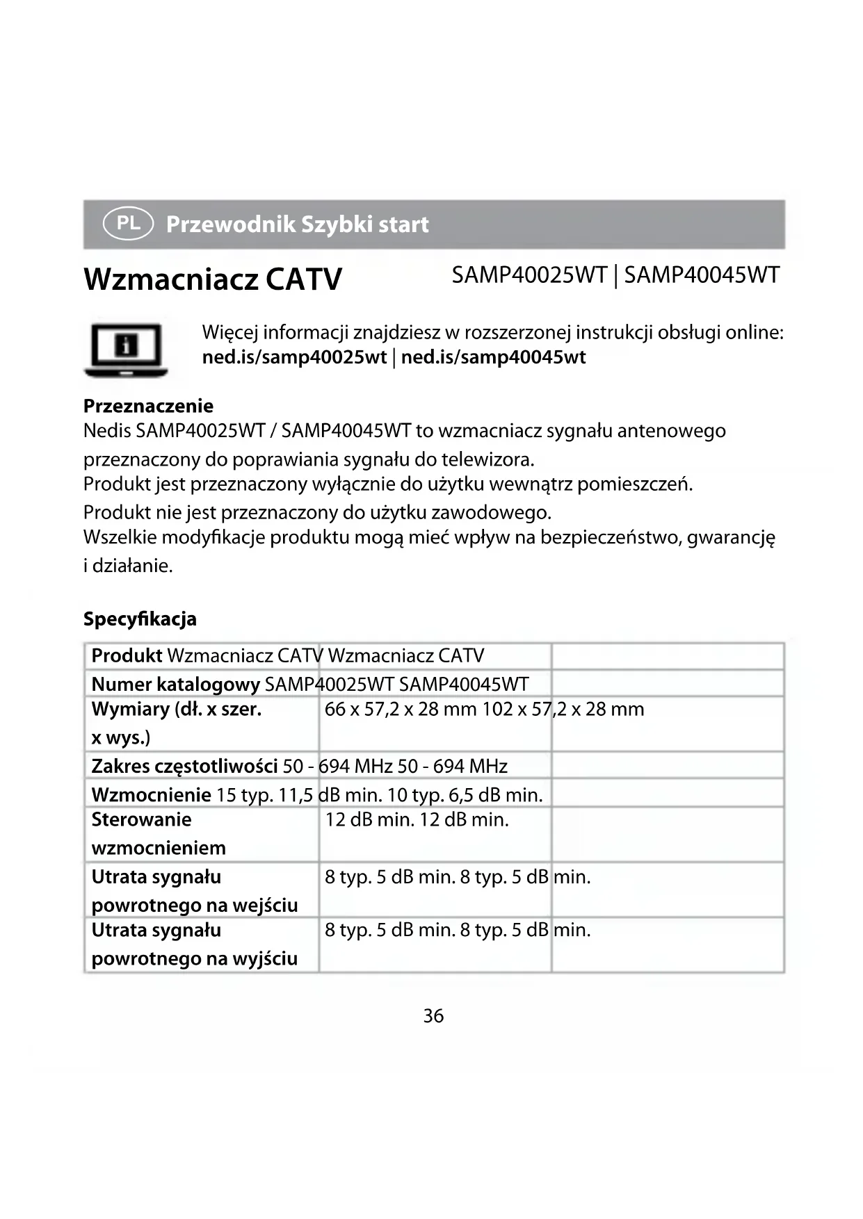 Więcej informacji znajdziesz w rozszerzonej instrukcji obsługi online: ned.is/samp40025wt | ned.is/samp40045wt Przeznaczenie Nedis SAMP40025WT / SAMP40045WT to wzmacniacz sygnału antenowego przeznaczony do poprawiania sygnału do telewizora. Produkt jest przeznaczony wyłącznie do użytku wewnątrz pomieszczeń. Produkt nie jest przeznaczony do użytku zawodowego. Wszelkie modykacje produktu mogą mieć wpływ na bezpieczeństwo, gwarancję i działanie. Specykacja Produkt Wzmacniacz CATV Wzmacniacz CATV Numer katalogowy SAMP40025WT SAMP40045WT Wymiary (dł. x szer. x wys.) 66 x 57,2 x 28 mm 102 x 57,2 x 28 mm Zakres częstotliwości 50 - 694 MHz 50 - 694 MHz Wzmocnienie 15 typ. 11,5 dB min. 10 typ. 6,5 dB min. Sterowanie wzmocnieniem 12 dB min. 12 dB min. Utrata sygnału powrotnego na wejściu 8 typ. 5 dB min. 8 typ. 5 dB min. Utrata sygnału powrotnego na wyjściu 8 typ. 5 dB min. 8 typ. 5 dB min.37 Współczynnik szumów 5 typ. 8 dB min. 5 typ. 8 dB min. Poziom sygnału wyjściowego 85 dBµV min. 80 dBµV min. Impedancja 75 Ω 75 Ω Złącze wejściowe Złącze żeńskie IEC x1 Złącze żeńskie IEC x1 Złącze wyjściowe Złącze męskie IEC x2 Złącze męskie IEC x4 Wejście zasilacza sieciowego