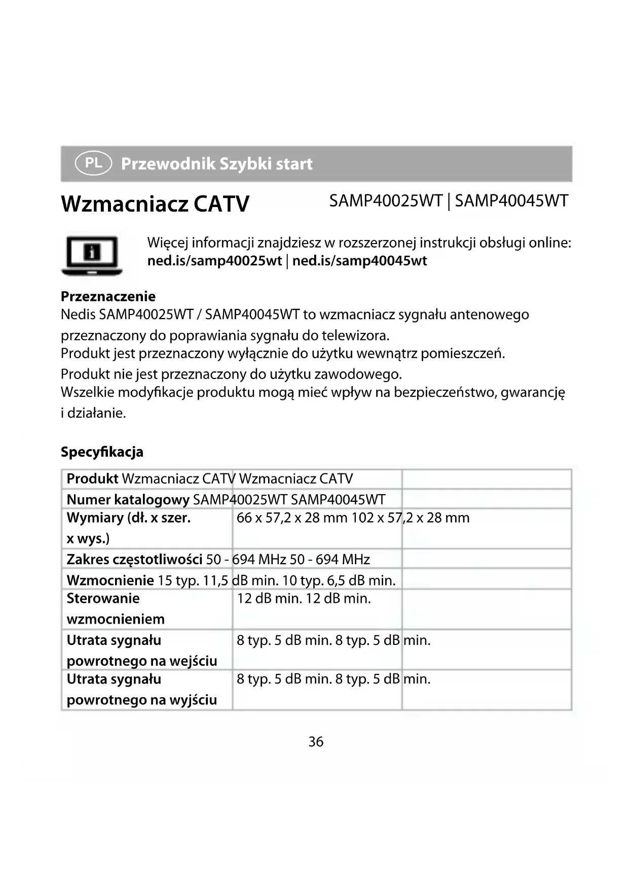 Więcej informacji znajdziesz w rozszerzonej instrukcji obsługi online: ned.is/samp40025wt | ned.is/samp40045wt Przeznaczenie Nedis SAMP40025WT / SAMP40045WT to wzmacniacz sygnału antenowego przeznaczony do poprawiania sygnału do telewizora. Produkt jest przeznaczony wyłącznie do użytku wewnątrz pomieszczeń. Produkt nie jest przeznaczony do użytku zawodowego. Wszelkie modykacje produktu mogą mieć wpływ na bezpieczeństwo, gwarancję i działanie. Specykacja Produkt Wzmacniacz CATV Wzmacniacz CATV Numer katalogowy SAMP40025WT SAMP40045WT Wymiary (dł. x szer. x wys.) 66 x 57,2 x 28 mm 102 x 57,2 x 28 mm Zakres częstotliwości 50 - 694 MHz 50 - 694 MHz Wzmocnienie 15 typ. 11,5 dB min. 10 typ. 6,5 dB min. Sterowanie wzmocnieniem 12 dB min. 12 dB min. Utrata sygnału powrotnego na wejściu 8 typ. 5 dB min. 8 typ. 5 dB min. Utrata sygnału powrotnego na wyjściu 8 typ. 5 dB min. 8 typ. 5 dB min.37 Współczynnik szumów 5 typ. 8 dB max. 5 typ. 8 dB max. Poziom sygnału wyjściowego 85 dBµV min. 80 dBµV min. Impedancja 75 Ω 75 Ω Złącze wejściowe Złącze żeńskie IEC x1 Złącze żeńskie IEC x1 Złącze wyjściowe Złącze męskie IEC x2 Złącze męskie IEC x4 Wejście zasilacza sieciowego