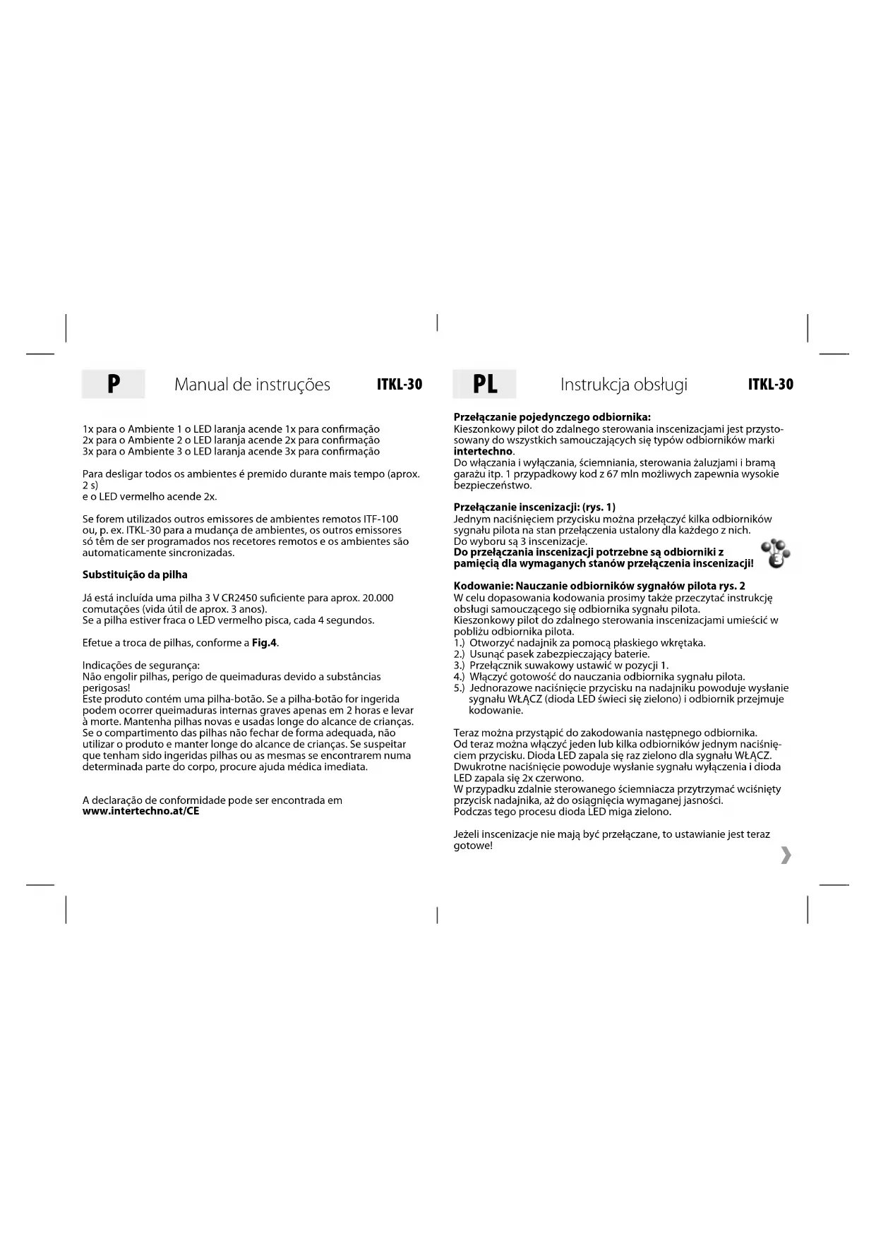 3Kasowanie kodowania W celu skasowania kodowania należy postąpić jak wyżej opisano w punktach od 3.) do 5.), przy czym teraz przez 2x naciśnięcia wysyłany jest sygnał wyłączenia.Dioda LED zapala się 2x czerwono.Wprowadzenie do pamięci przełączania inscenizacjiDotyczy tylko odbiorników przystosowanych do przełączania inscenizacji (SYMBOL)!3 różne inscenizacje mogą być zapisane w pamięci. (rys. 1)W przypadku zastosowania 2 lub więcej nadajników przystosowanych do przełączania inscenizacji i z takim samym kodowaniem odbiorników sygnału pilota, ustawienia dotyczące inscenizacji są automatycznie przejmowane.Do ustawiania inscenizacji z kilkoma odbiornikami pilota zaleca się stosowanie nadajnika ręcznego, jak np. ITLS-16, ITT-1500 itp.Odbiorniki sygnałów pilota doprowadzić nim do wymaganego stanu, jak np. ustawienie ściemniacza (nastawienie wymaganej jasności świecenia) albo wymagany stan włączenia bądź wyłączenia. W razie braku innego nadajnika ręcznego można również kieszonkowym pilotem do zdalnego sterowania inscenizacjami przeprowadzić ustawienie po kolei wszystkich odbiorników sygnału pilota, przy czym przełącznik suwakowy musi być w pozycji 1. Ostatnia ustawiona jasność świecenia pozostaje zachowana w ściemniaczach, także po ich wyłączeniu.Inscenizacja 1: Przełącznik suwakowy ustawić w pozycji 3 (rys. 3) i jeden raz nacisnąć dla inscenizacji 1! Do potwierdzenia dioda LED zapala się 3x zielono i 1x pomarańczowo dla inscenizacji 1. Inscenizacja 1 jest wprowadzony do pamięci.Inscenizacja 2: W celu przeprowadzenia ustawień przesunąć przełącznik suwakowy do pozycji 3 i na koniec nacisnąć 2x. Dioda LED zapala się 2x pomarańczowo.Inscenizacja 3 zostanie zaprogramowany przez 3x naciśnięcie i dioda LED zapala się 3x zielono i 3x pomarańczowo.Gdy wszystkie 3 inscenizacje są wprowadzone do pamięci należy ustawić przełącznik suwakowy w pozycji 2.W zależności od tego, która inscenizacja ma być włączona, należy nacisnąć przycisk.1x dla inscenizacji 1, dioda LED zapala się 1x pomarańczowo na potwierdzenie2x dla inscenizacji 2, dioda LED zapala się 2x pomarańczowo na potwierdzenie3x dla inscenizacji 3, dioda LED zapala się 3x pomarańczowo na potwierdzenieDo wyłączenia wszystkich inscenizacji dłużej przytrzymać wciśnięty (około 2 sek.) i dioda LED zapala się 2x czerwono.Jeżeli mają być używane także inne piloty do zdalnego sterowania inscenizacjami ITF-100 albo też np. ITKL-30 do przełączania inscenizacji, to należy je nauczyć kodu tylko odbiorników sygnałów pilota, ponieważ wtedy inscenizacje są poddawane automatycznej synchronizacji.Wymiana baterii Bateria 3 V CR2450 wystarczająca na około 20 000 przełączeń (okres trwałości około 3 lata) należy do zestawu. Gdy bateria zbliża się do całko-witego wyczerpania miga czerwona dioda LED co 4 sekundy.Wymianę baterii przeprowadzić zgodnie z rys. 4.Przepisy bezpieczeństwa:Nie dopuścić do połknięcia baterii, niebezpieczeństwo oparzenia niebez-piecznymi substancjami!Niniejszy produkt zawiera baterię guzikową. W razie połknięcia baterii guzikowej mogą wystąpić ciężkie oparzenia wewnętrzne w ciągu zale-dwie 2 godzin, których skutkiem może być śmierć. Nowe i wyczerpane baterie należy przechowywać w sposób niedostępny dla dzieci. Jeżeli zagłębienia na baterię nie da się poprawnie zamknąć, to nie używać dalej produktu i przechowywać go w sposób niedostępny dla dzieci. W razie stwierdzenia, że baterie zostały połknięte albo znajdują się w jakiejś części ciała, należy natychmiast zwrócić się o pomoc lekarską.Deklaracja zgodności WE jest do wglądu na stronie www.intertechno.at/CE