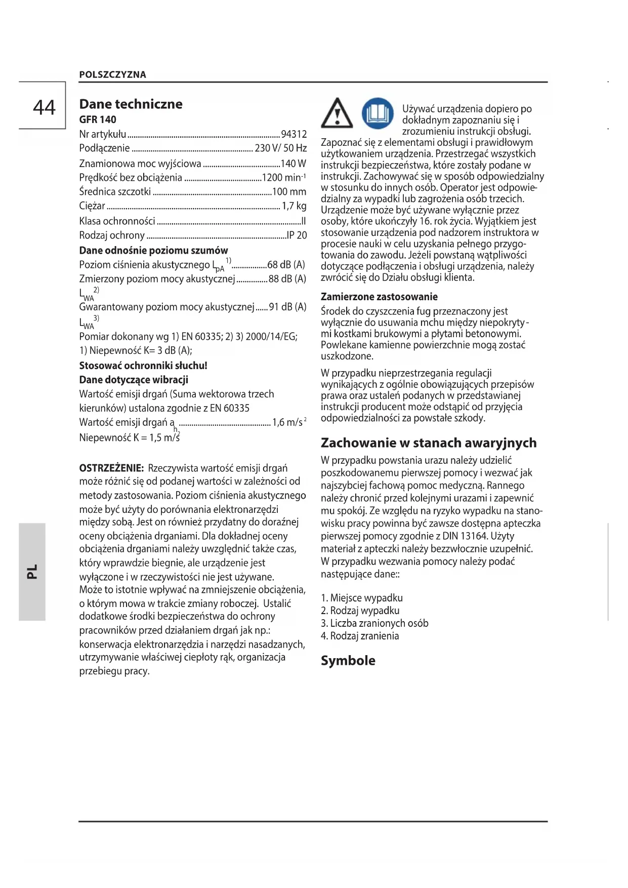 mi kostkami brukowymi a płytami betonowymi. Powlekane kamienne powierzchnie mogą zostać uszkodzone. W przypadku nieprzestrzegania regulacji wynikających z ogólnie obowiązujących przepisów prawa oraz ustaleń podanych w przedstawianej instrukcji producent może odstąpić od przyjęcia odpowiedzialności za powstałe szkody. Zachowanie w stanach awaryjnych W przypadku powstania urazu należy udzielić poszkodowanemu pierwszej pomocy i wezwać jak najszybciej fachową pomoc medyczną. Rannego należy chronić przed kolejnymi urazami i zapewnić mu spokój.Ze względu na ryzyko wypadku na stano- wisku pracy powinna być zawsze dostępna apteczka pierwszej pomocy zgodnie z DIN 13164. Użyty materiał z apteczki należy bezzwłocznie uzupełnić. W przypadku wezwania pomocy należy podać następujące dane::